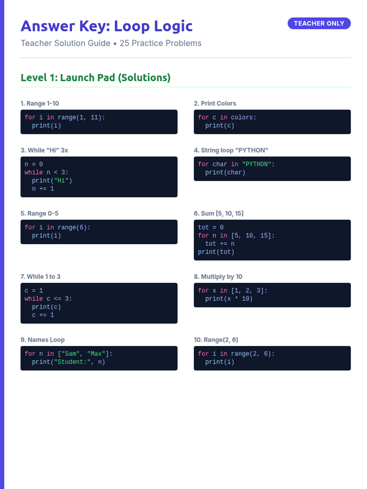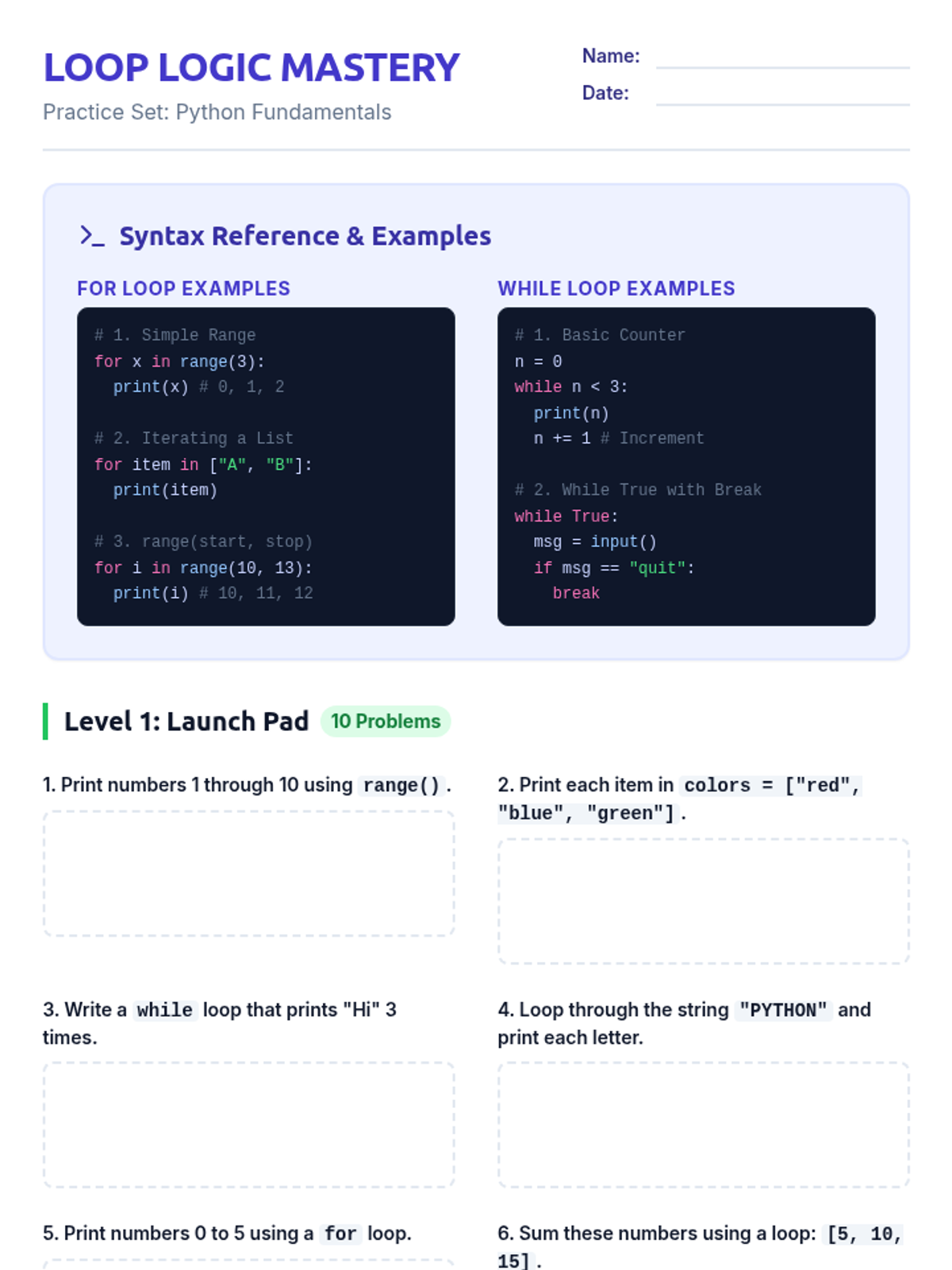 A comprehensive practice set and reference guide for Python for and while loops, designed to prepare students for their upcoming test. Includes introductory, moderate, and challenging problems with a mix of debugging and code creation.