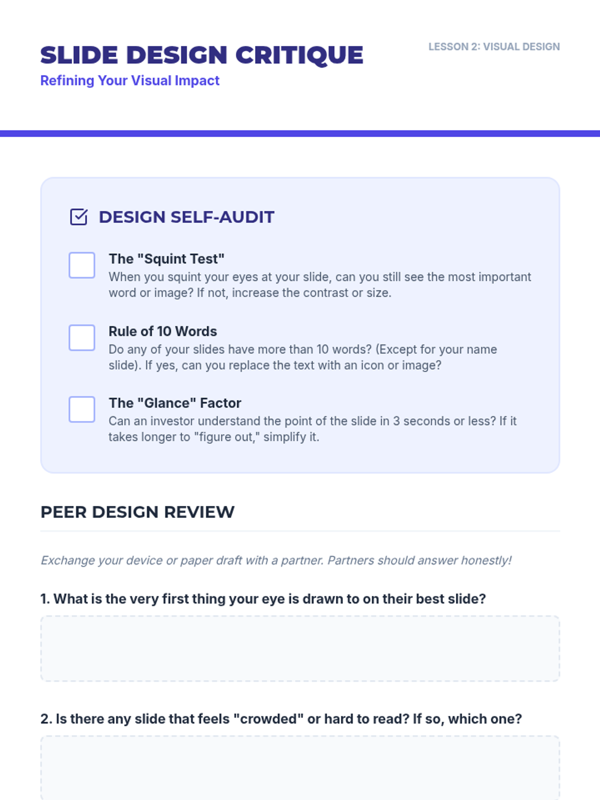 Students develop visual aids that enhance their verbal presentation, focusing on design principles like simplicity, high-contrast visuals, and effective data representation.