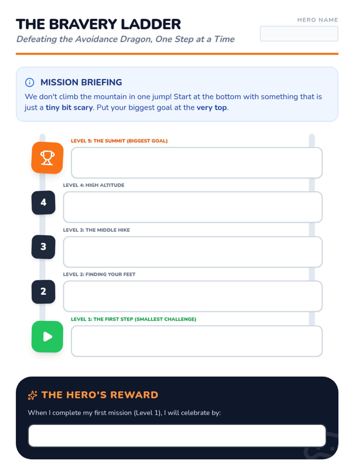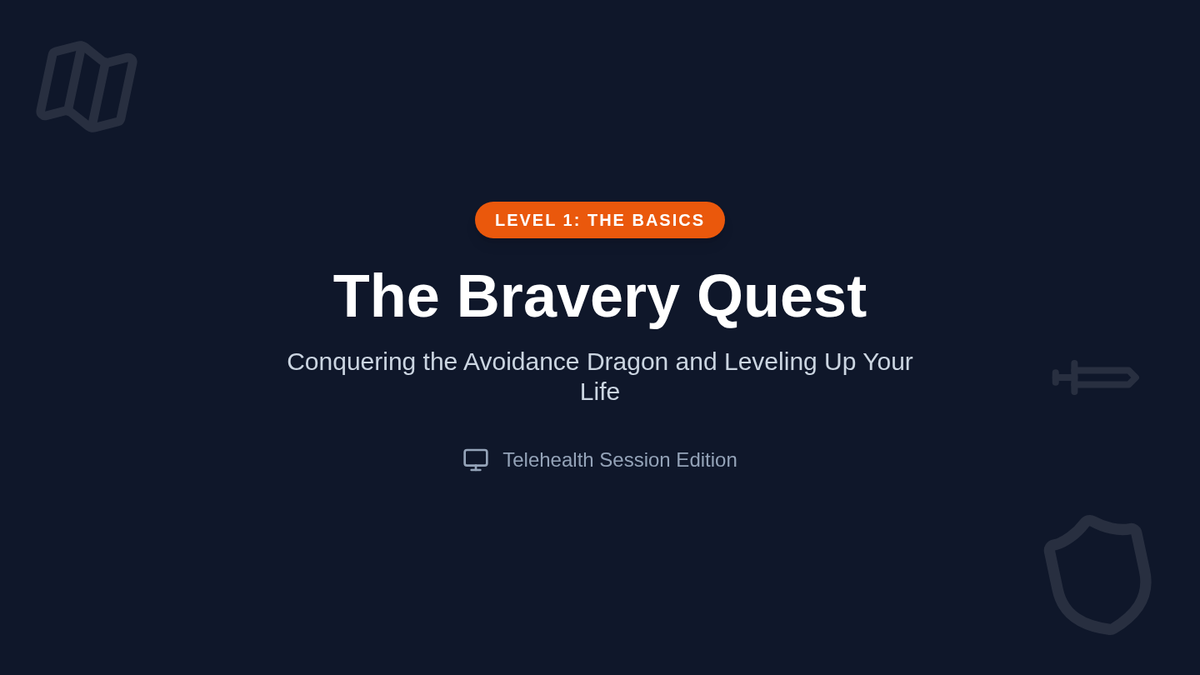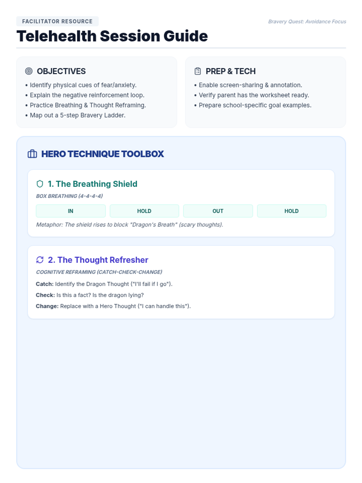A psychoeducation lesson for a 10-year-old boy focusing on understanding the cycle of avoidance and negative reinforcement through the metaphor of a 'Bravery Quest.' It includes slides for telehealth delivery, a goal-setting worksheet, and a facilitator guide.
