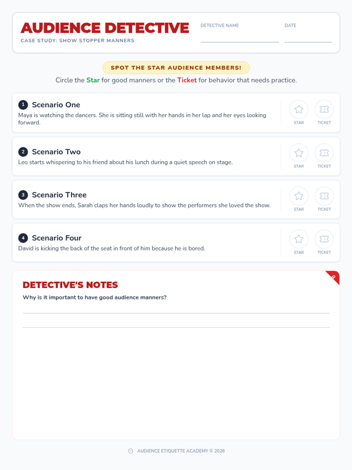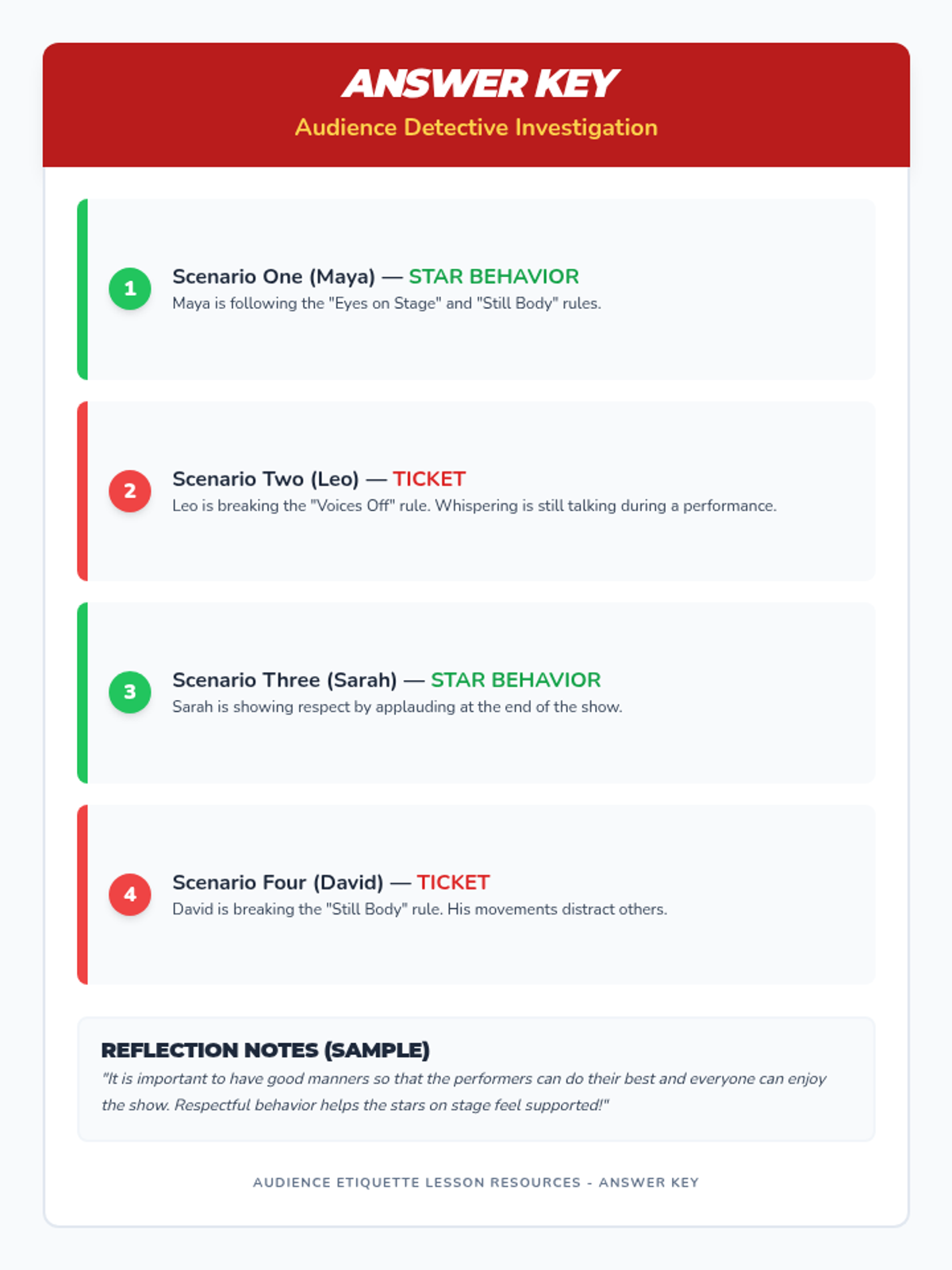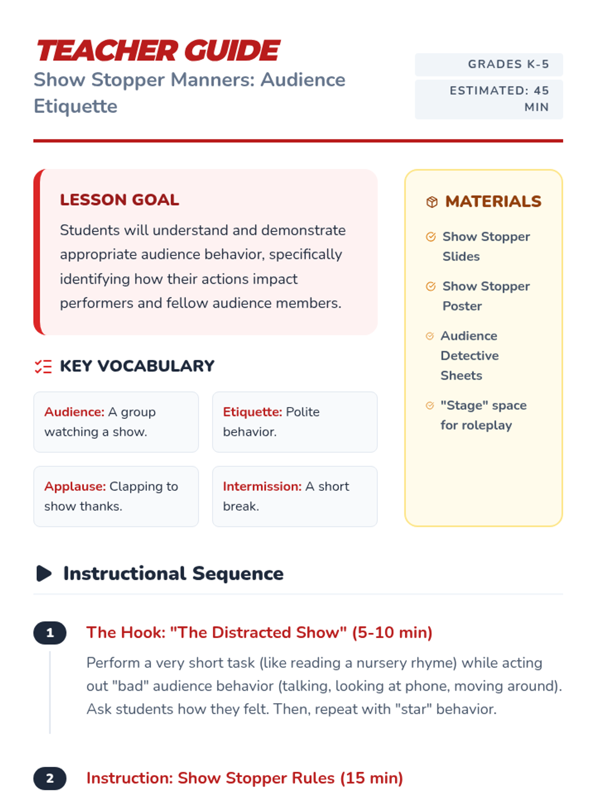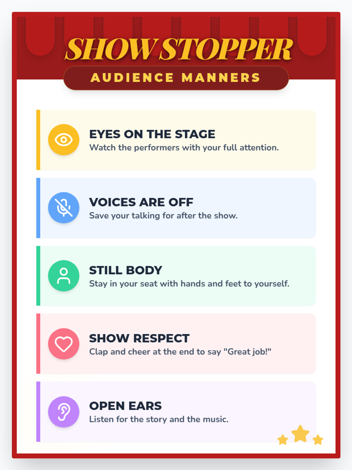 A theatrical lesson for K-5 students on audience etiquette, using a stage theme to teach respect, focus, and appropriate responses.