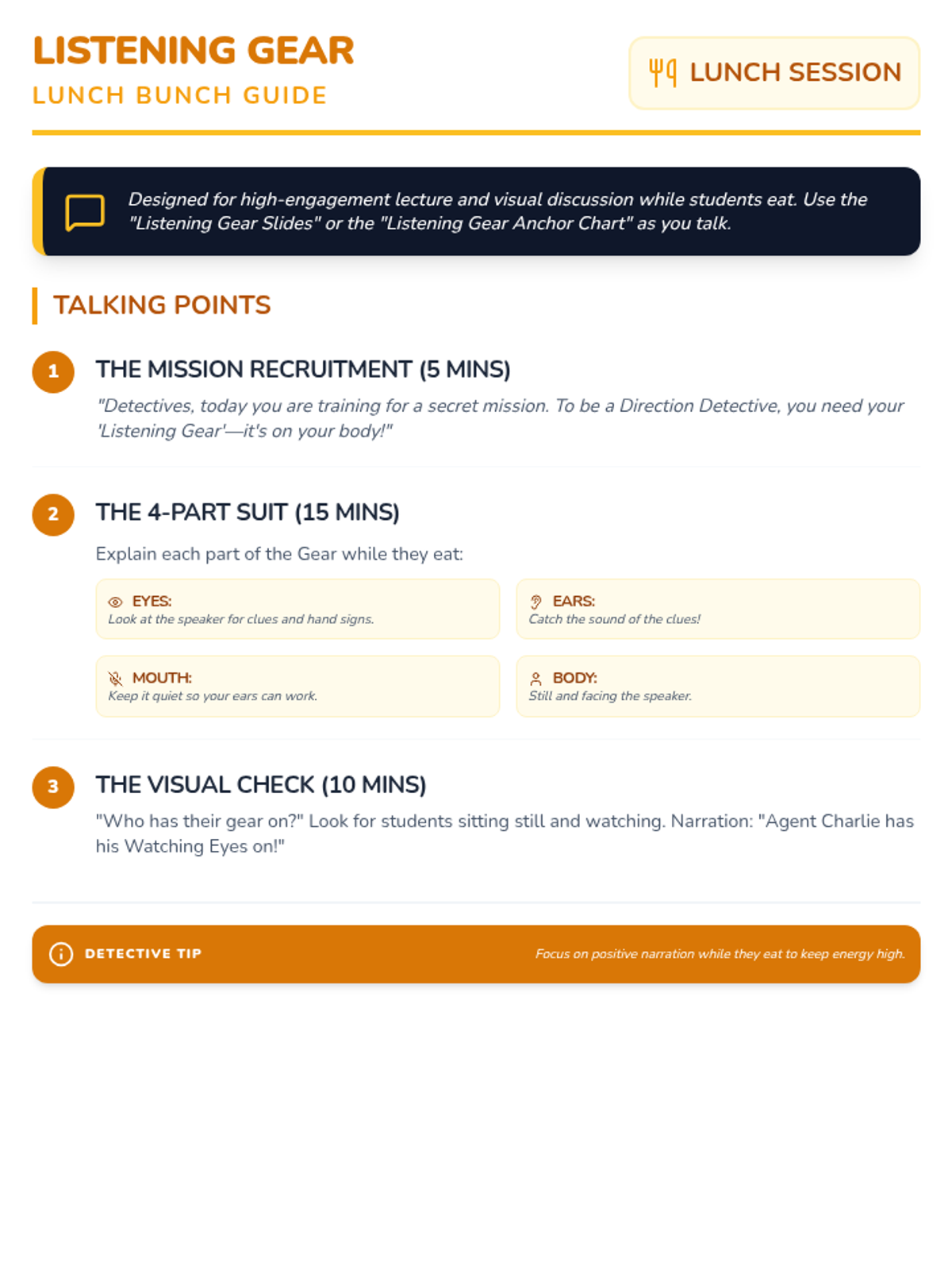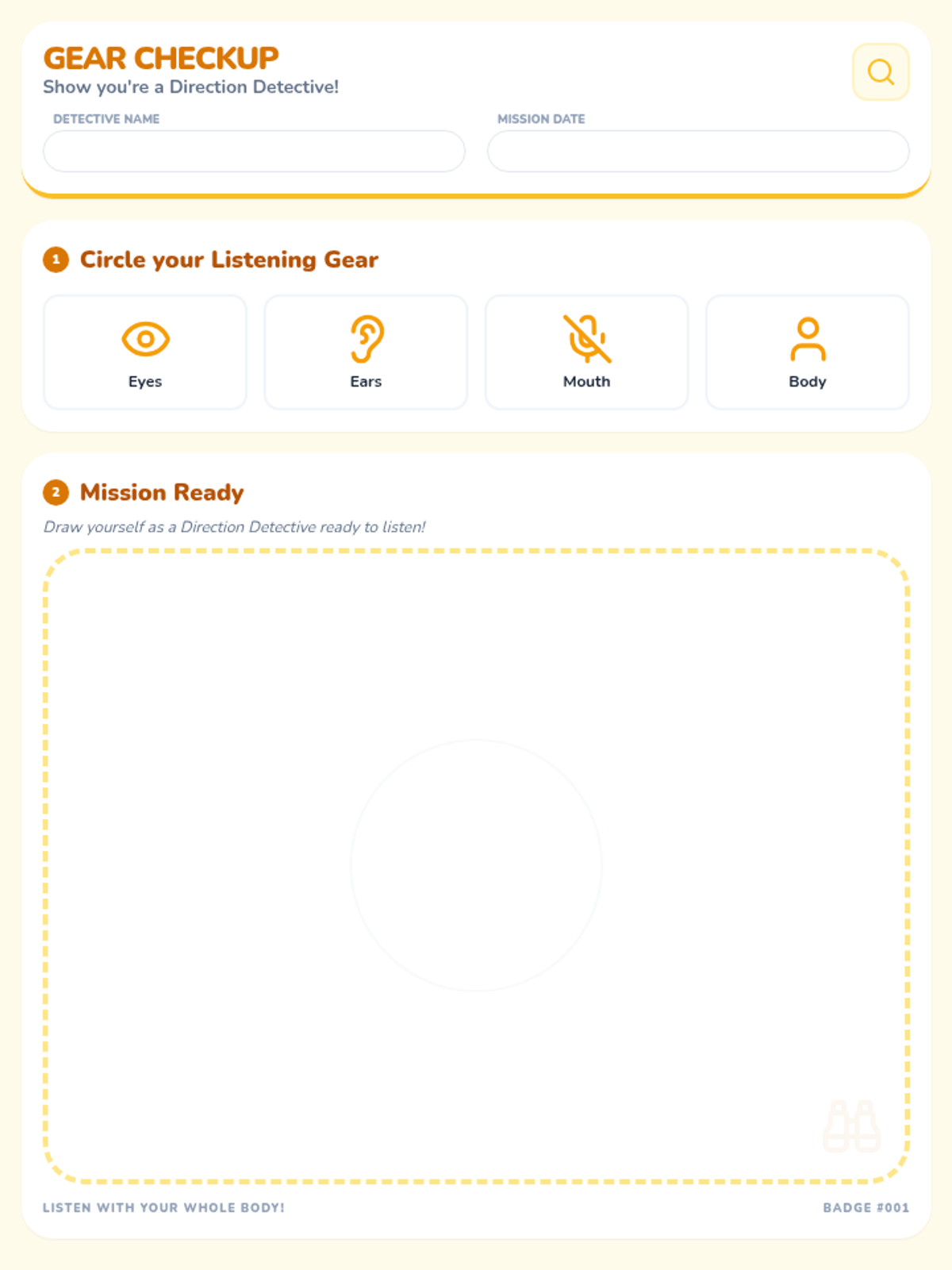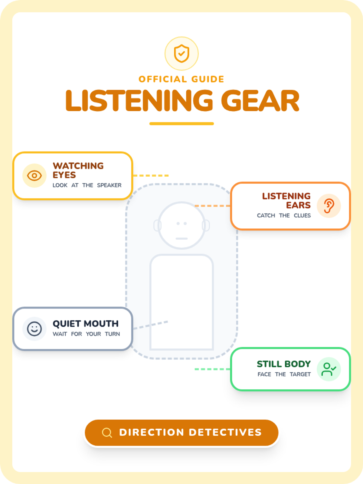 Students learn the physical 'gear' needed for active listening: watching eyes, listening ears, quiet mouths, and still bodies.