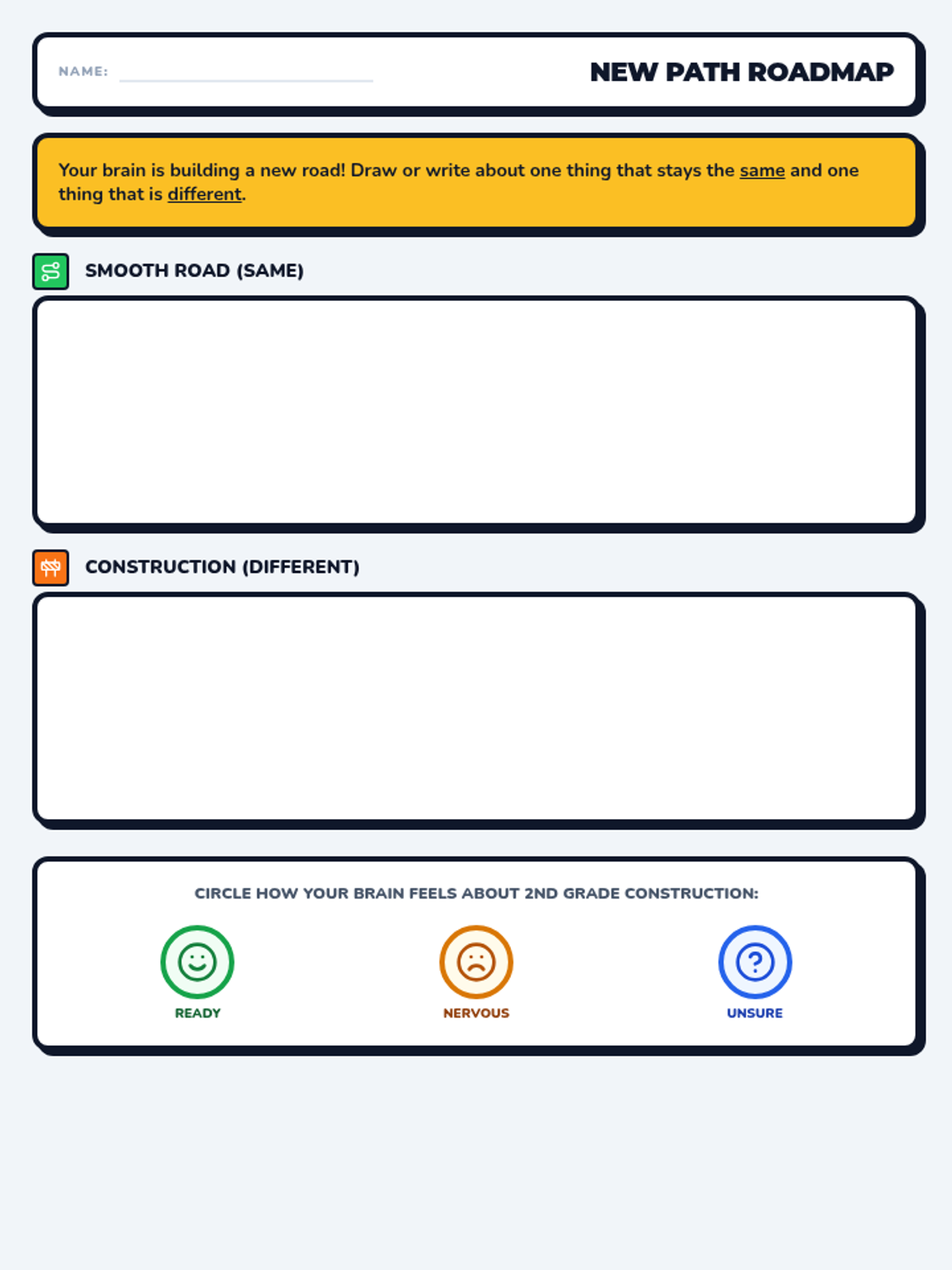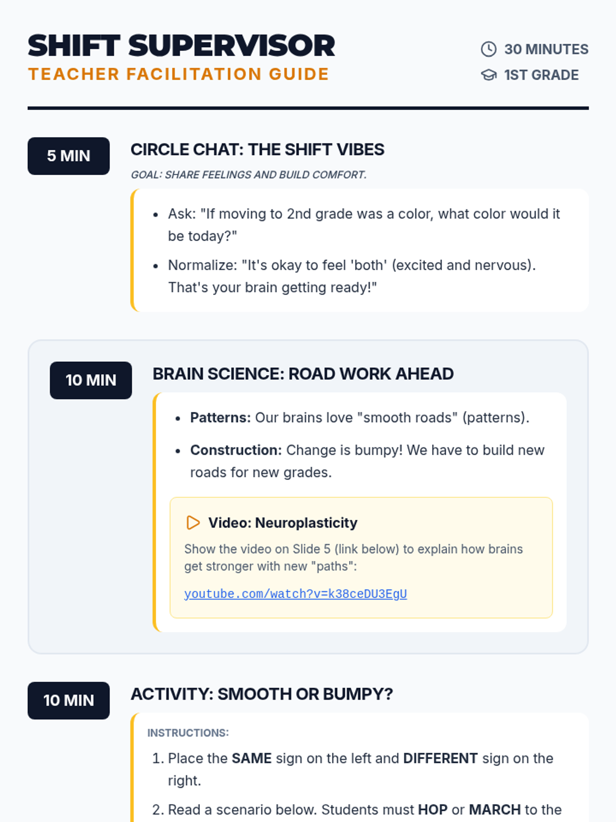 A 30-minute introductory lesson on managing the shift to 2nd grade, focusing on brain science, emotional awareness, and identifying what stays the same versus what changes.
