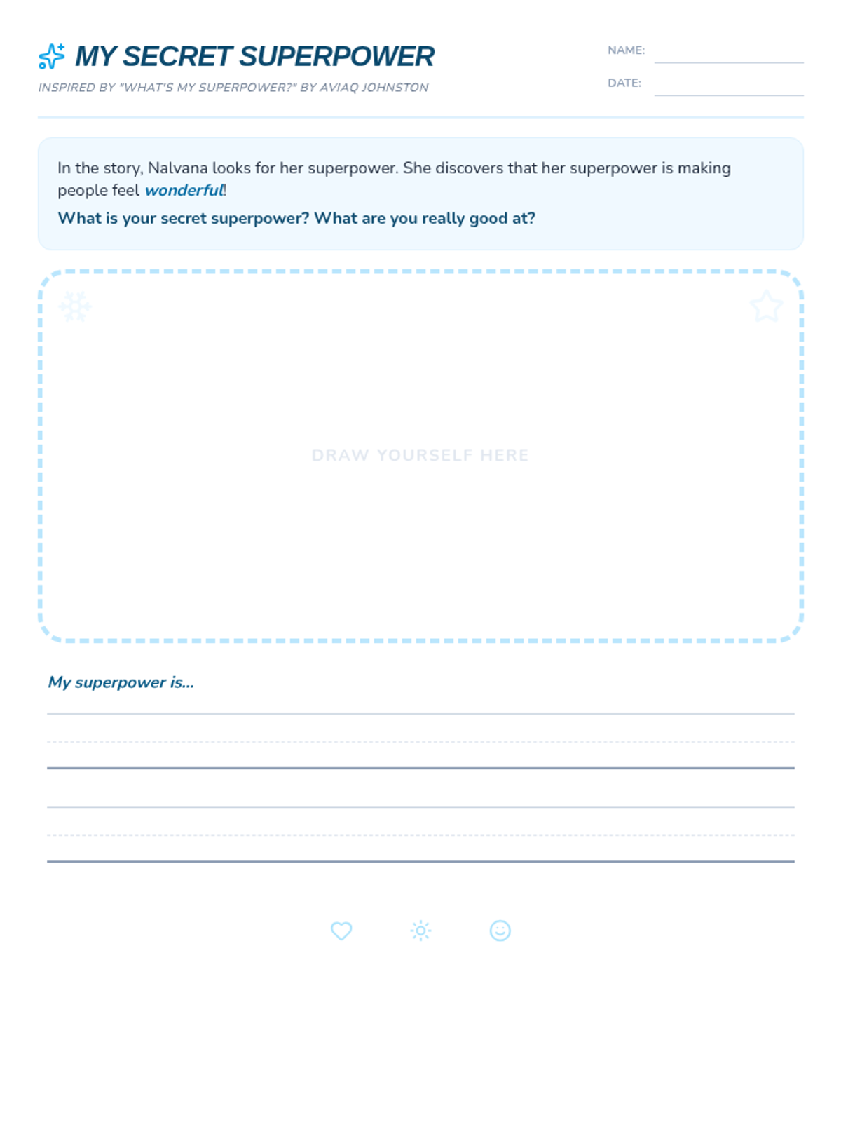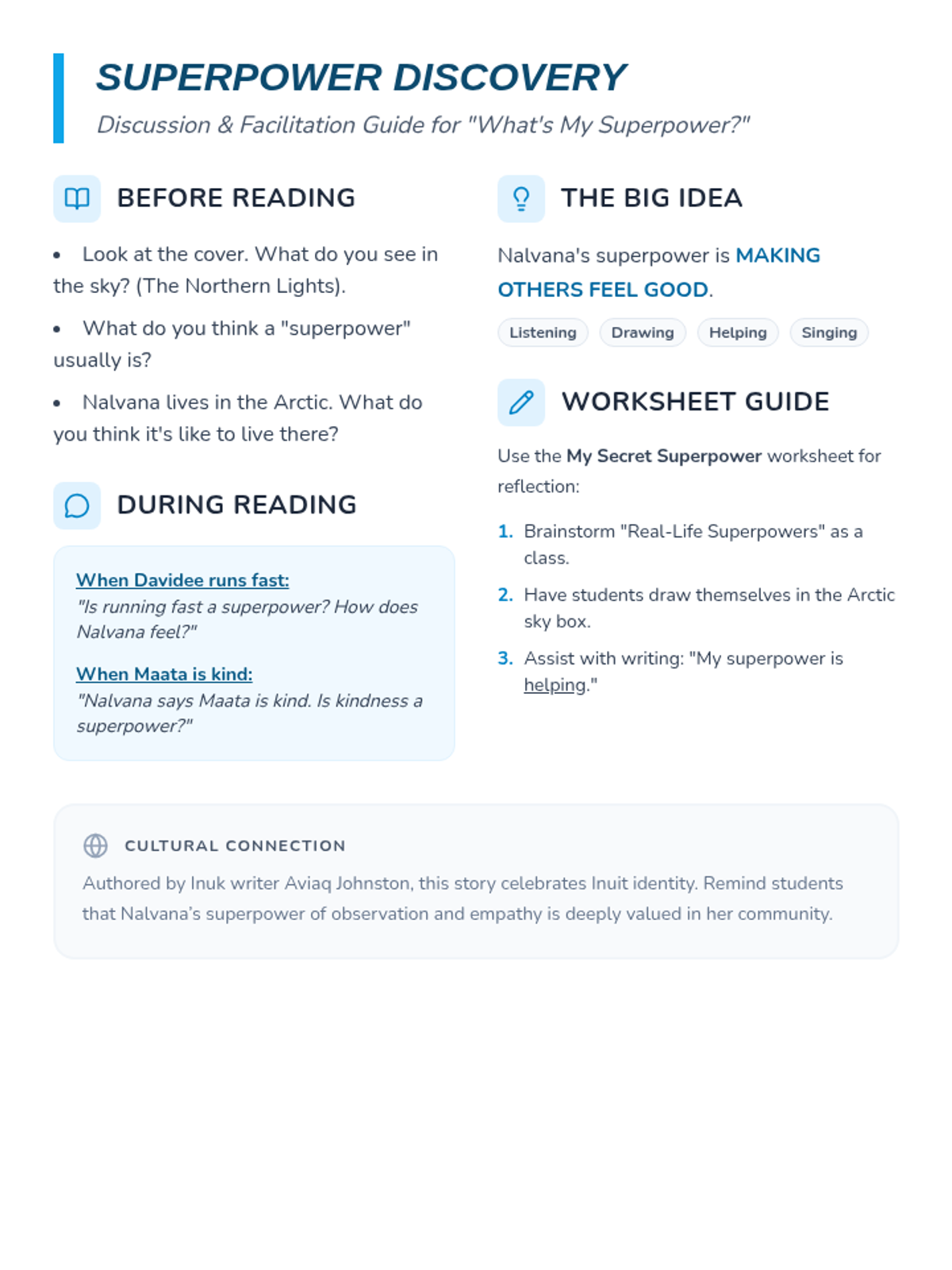 A social-emotional learning lesson based on Aviaq Johnston's 'What's My Superpower?' where students explore their unique strengths and talents.