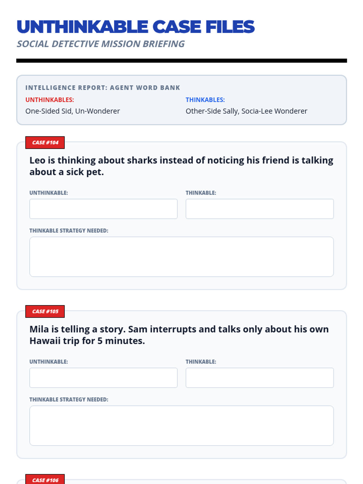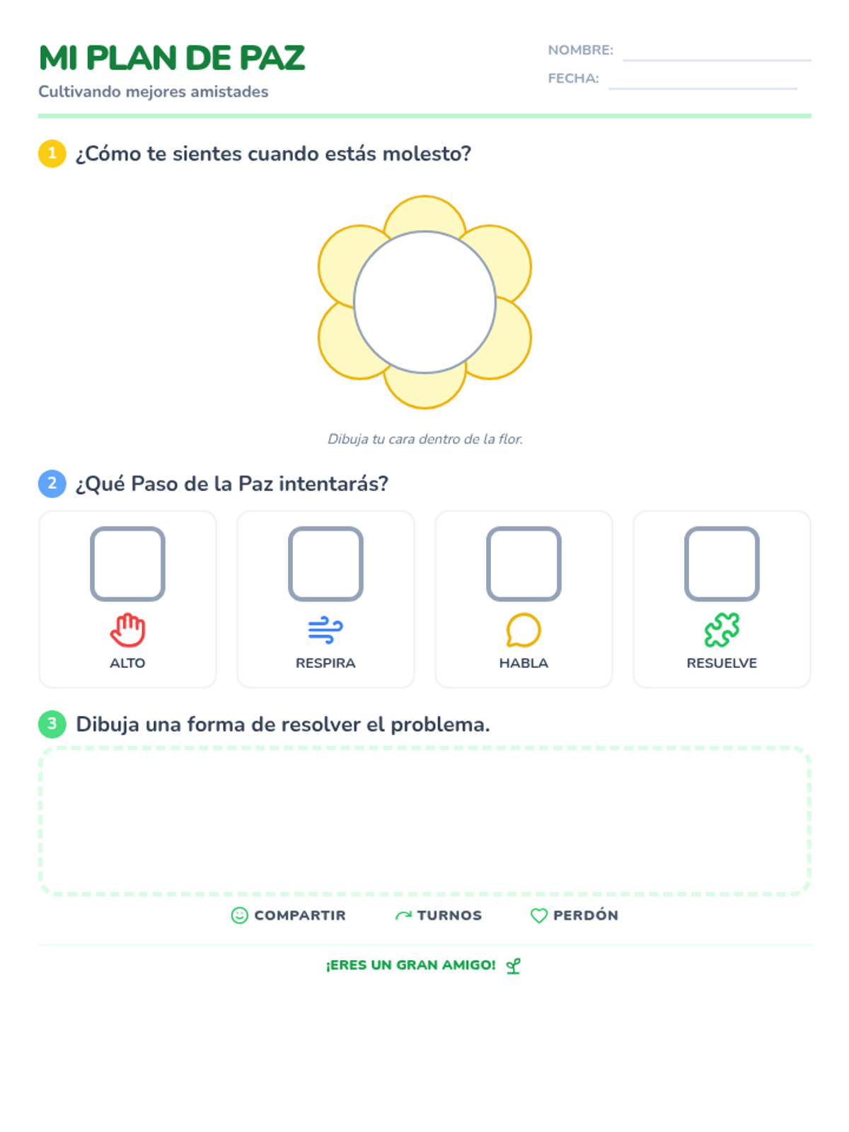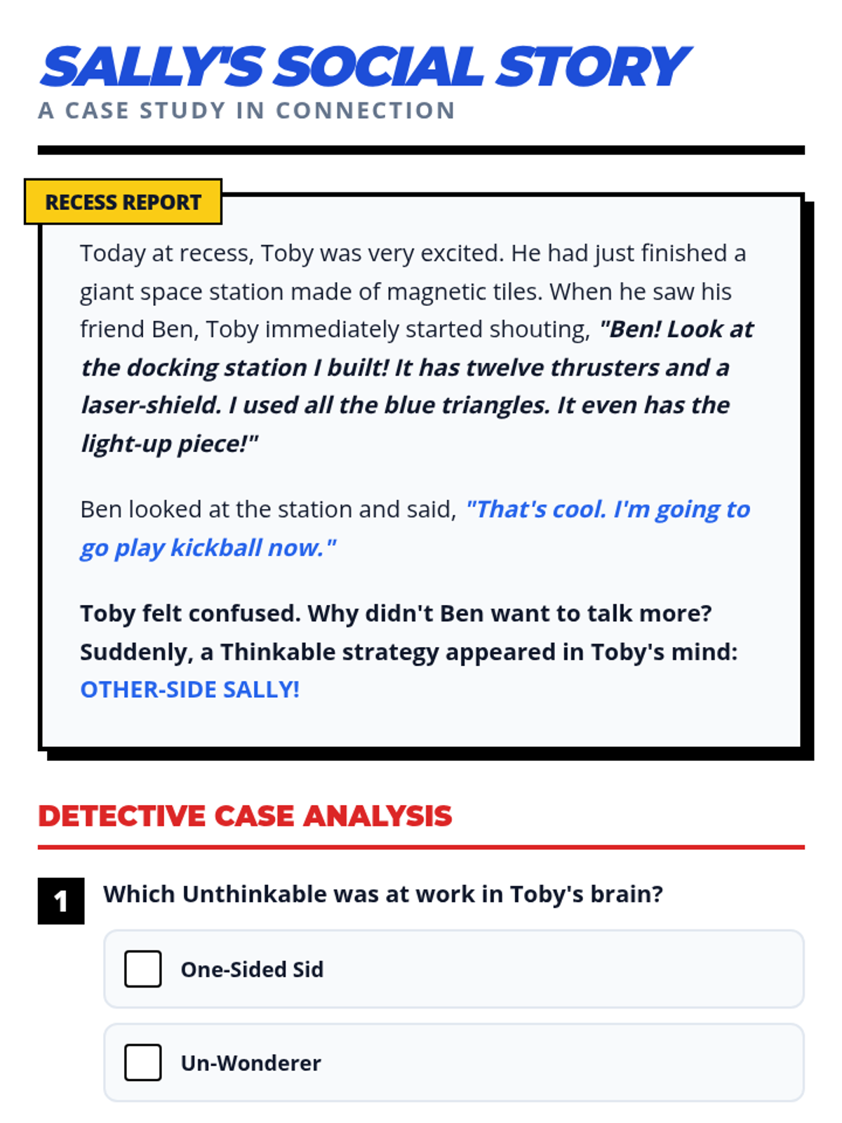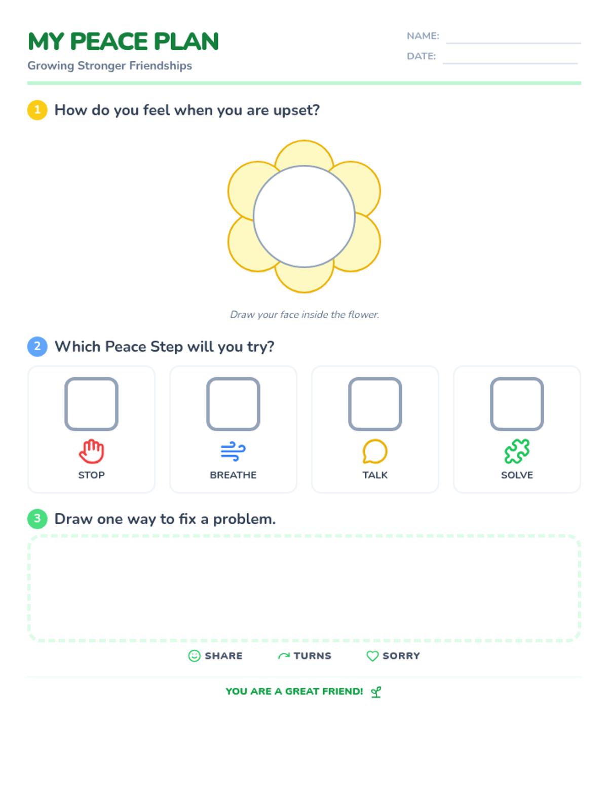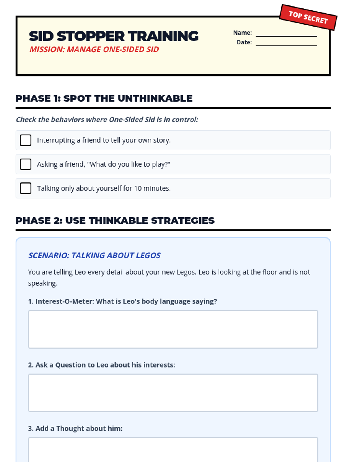 A lesson designed to help 1st grade students identify social 'Stop' cues and practice turn-taking through a 'Friendship Detective' theme. includes a social story and a visual self-monitoring checklist.
