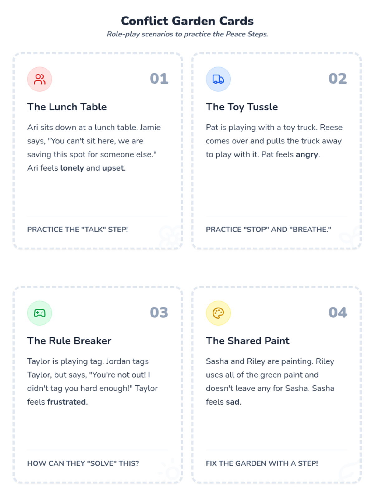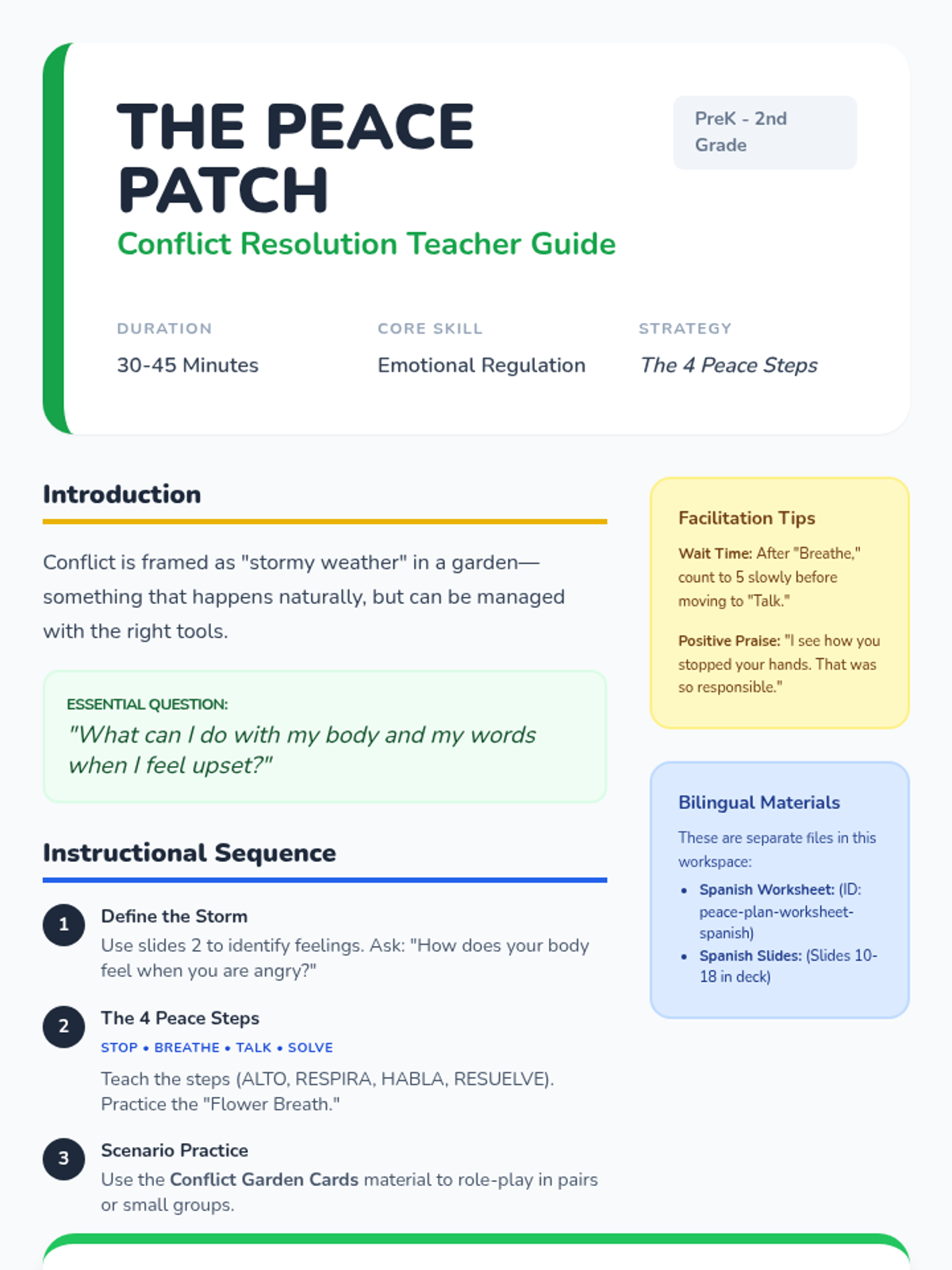 A social-emotional learning lesson for PreK-2nd grade students focused on navigating conflict and managing feelings of upset with friends using a 'Peace Patch' garden theme.