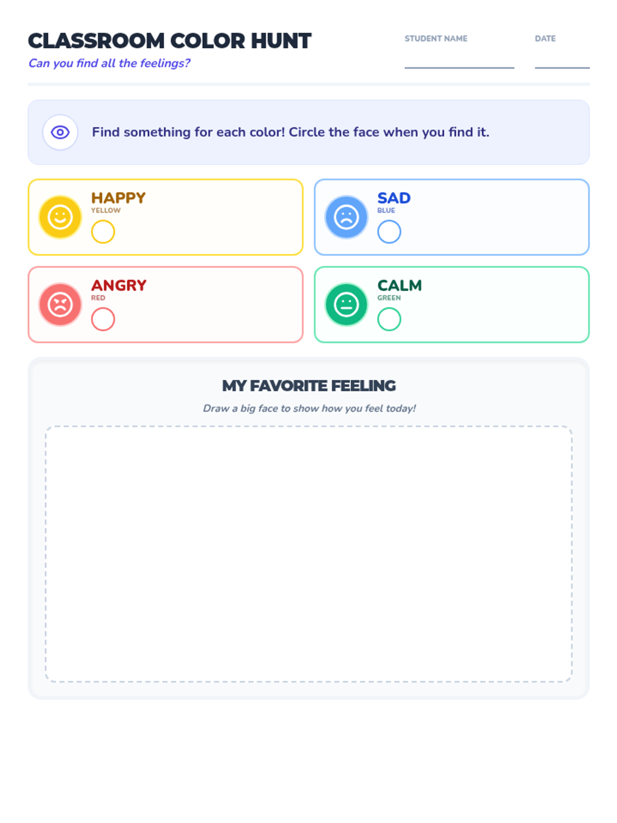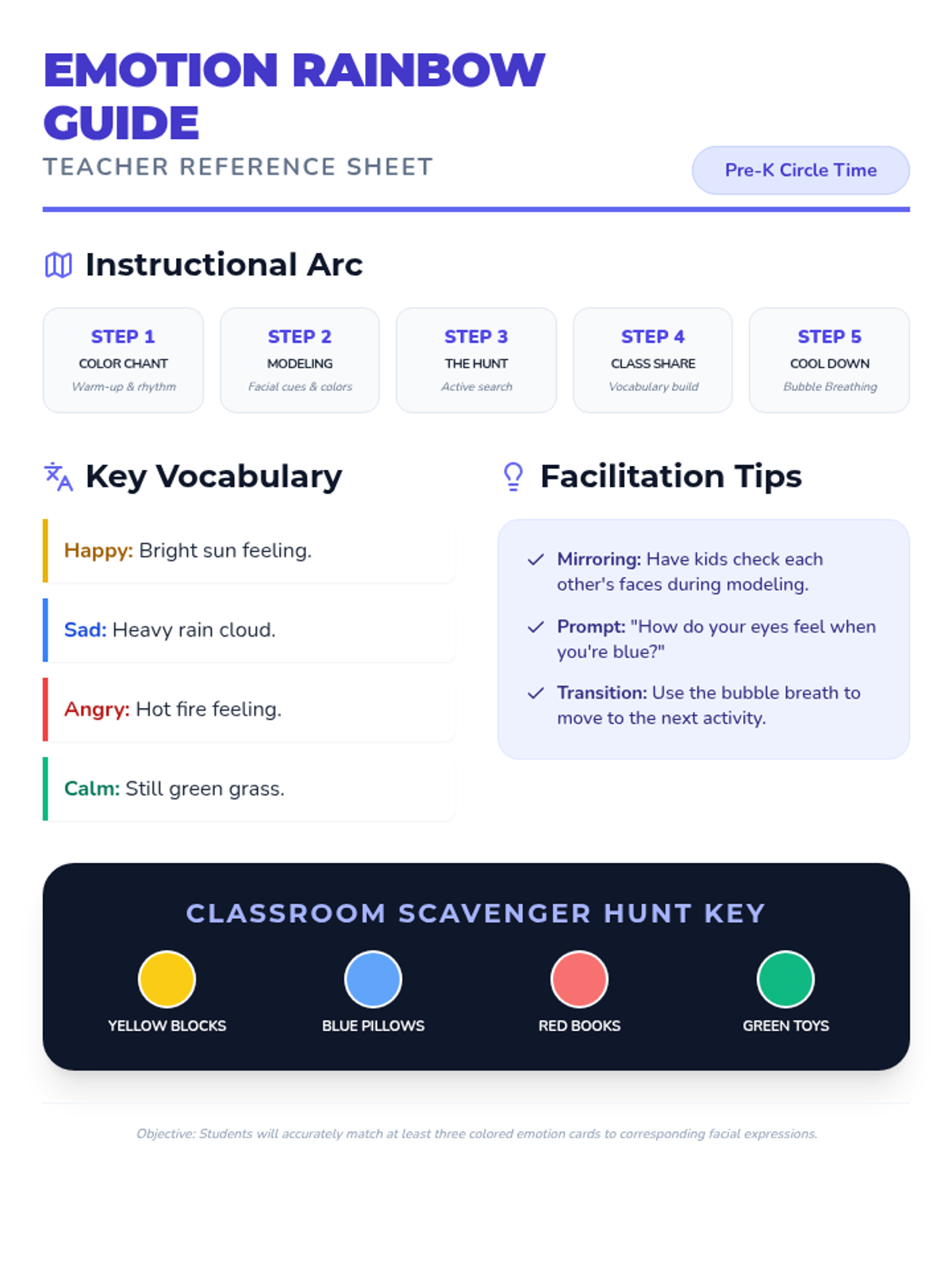 A playful Pre-K lesson that connects basic emotions to colors through a classroom scavenger hunt and visual aids. Students learn to identify facial cues and build emotional vocabulary in a supportive, whole-group environment.