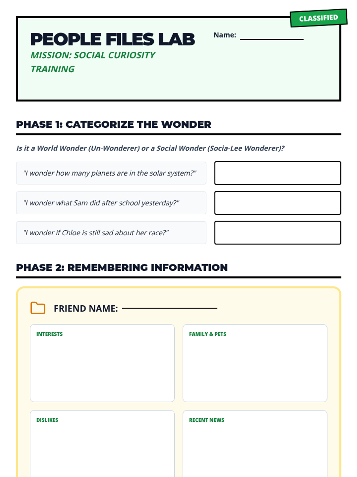 Focuses on moving from world-wondering to people-wondering using 'People Files' and social curiosity to build stronger relationships.