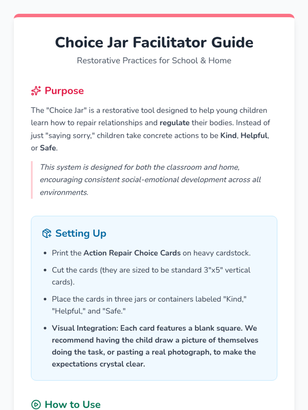 A set of behavior replacement and repair cards for preschool students, categorized into Kind, Helpful, and Safe actions to encourage positive social-emotional growth and restorative practices.