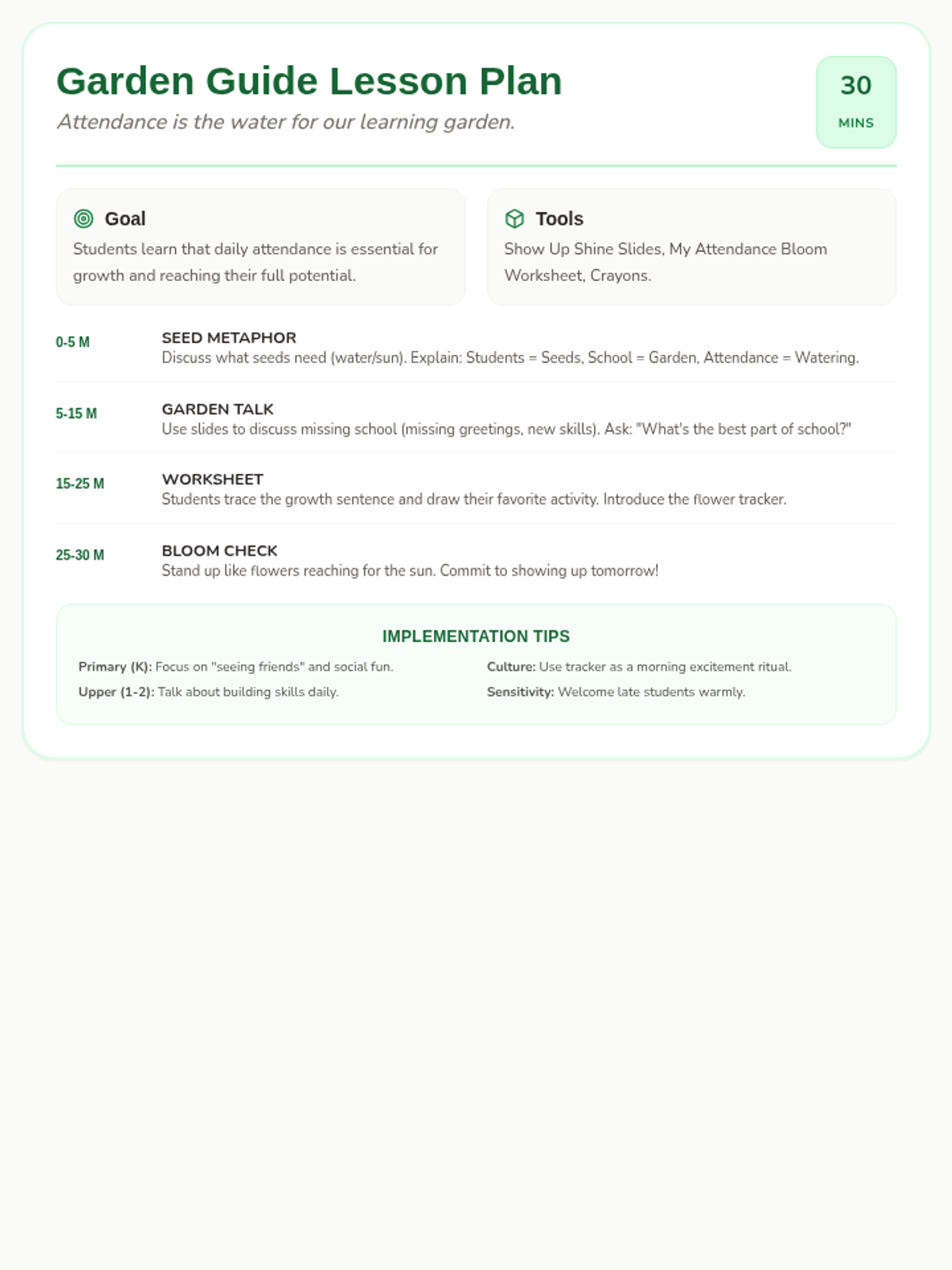 A 30-minute lesson for K-2 students that uses a garden metaphor to explain why showing up to school every day is important for growth and learning.