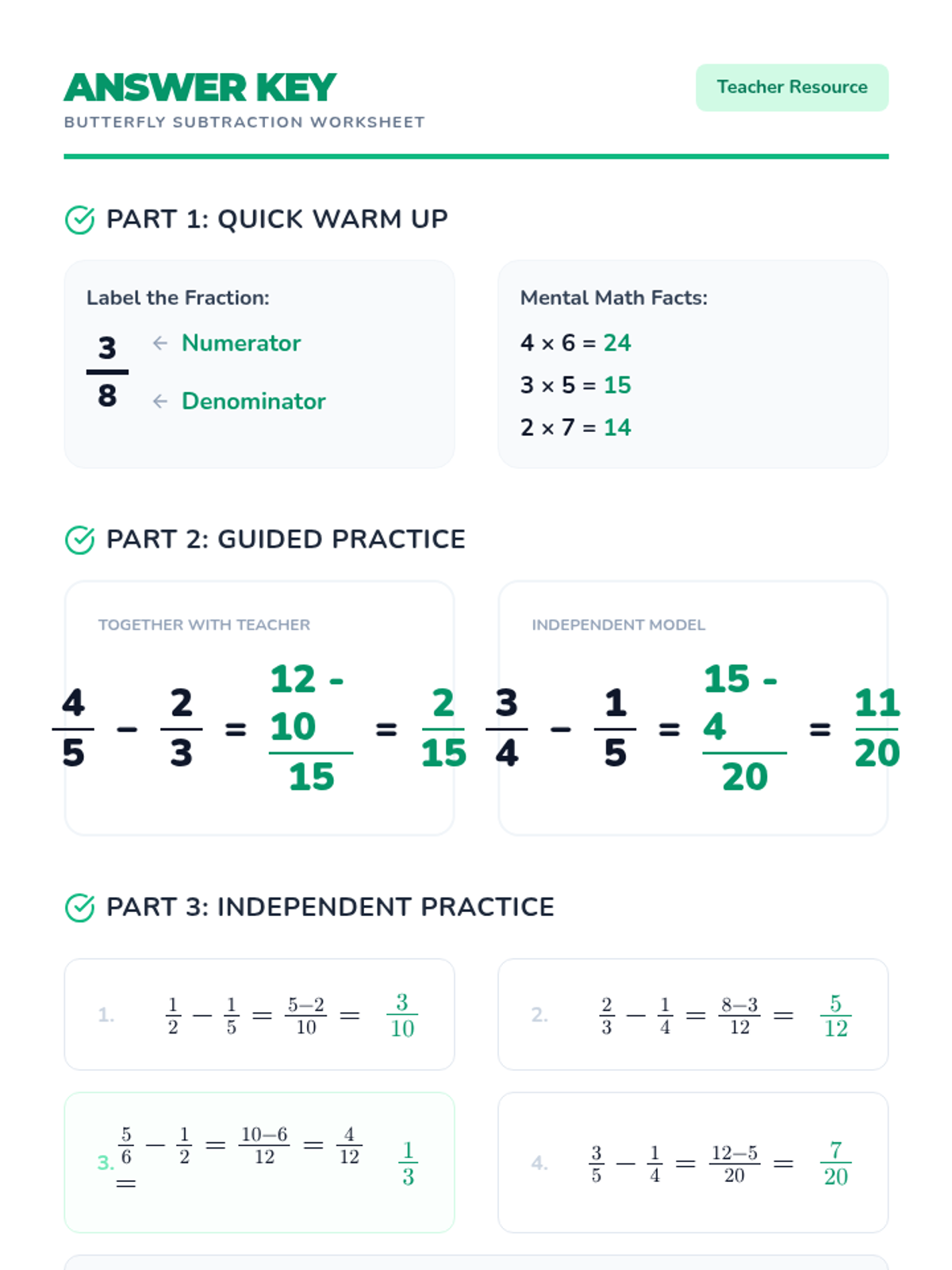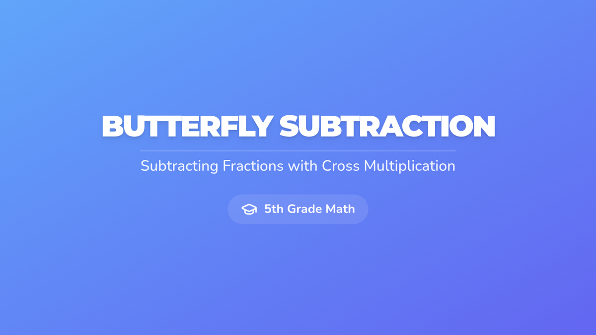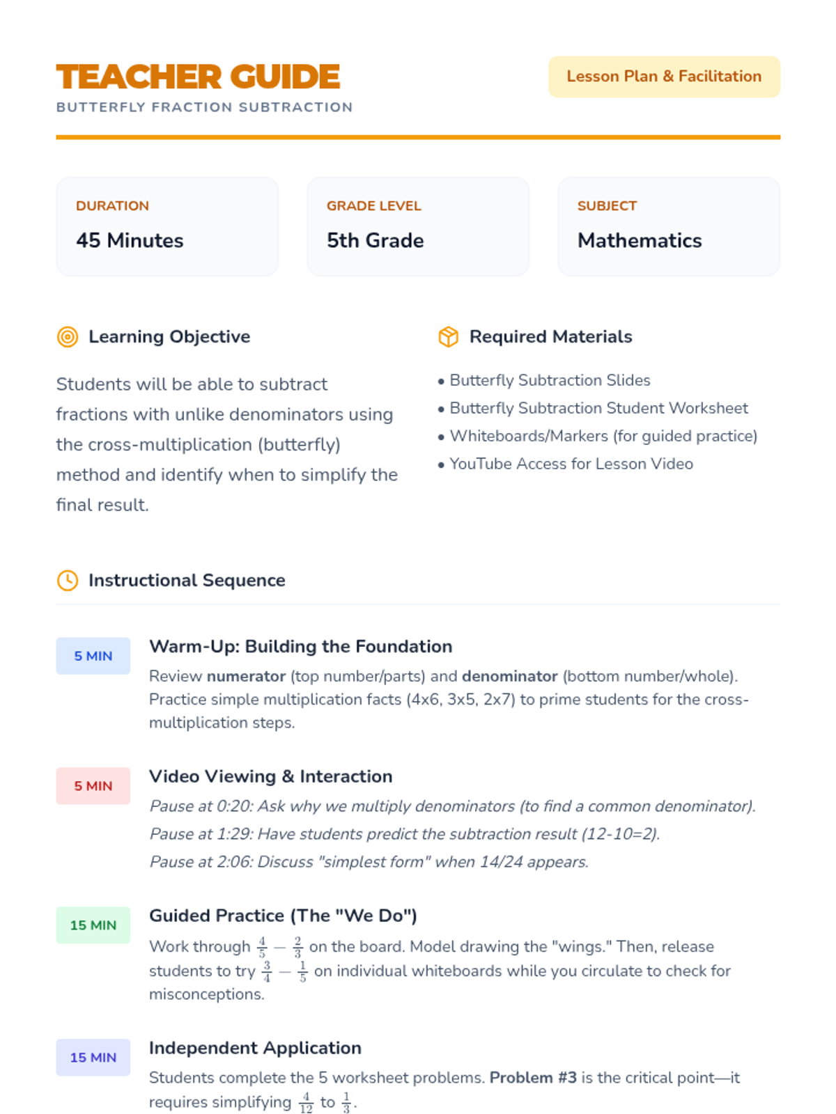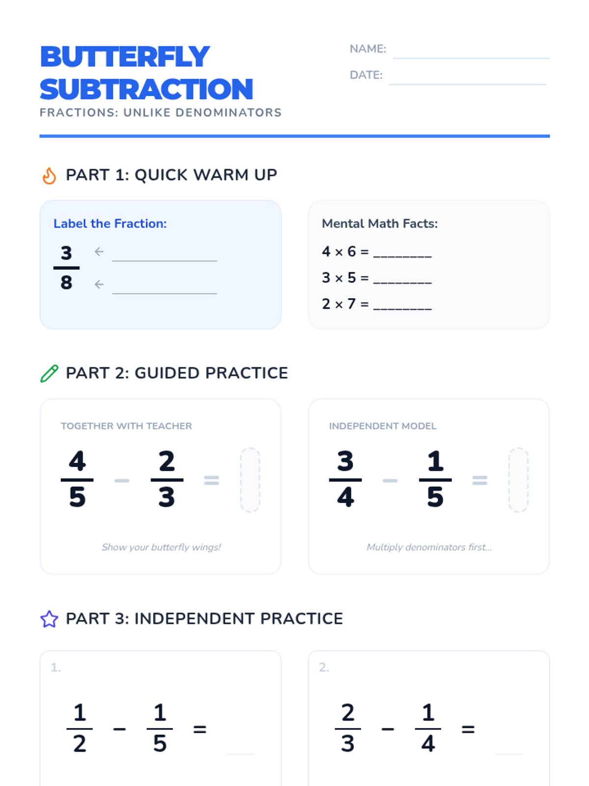 A comprehensive lesson on subtracting fractions with unlike denominators using the cross-multiplication (butterfly) method, featuring a video guide, guided practice, and independent application.