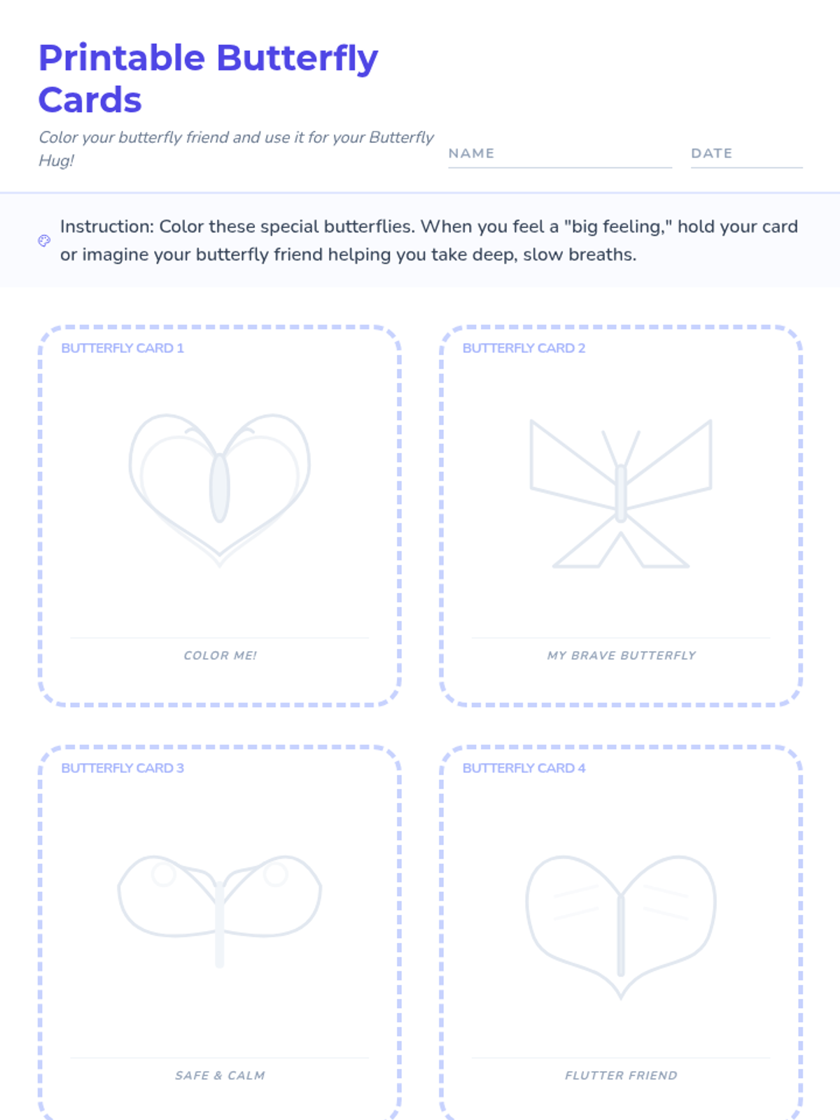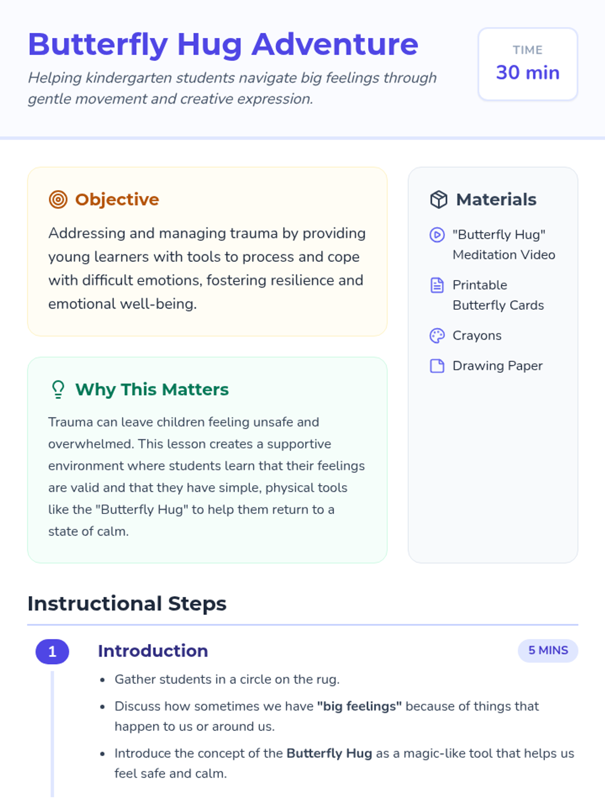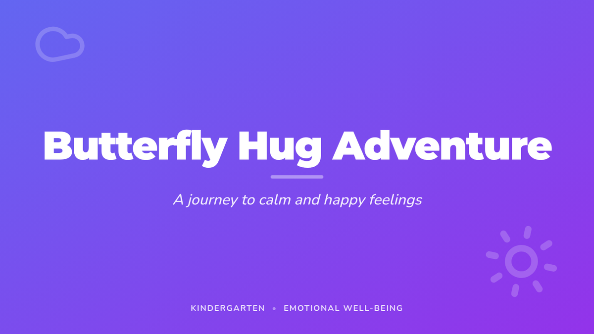 A gentle, trauma-informed lesson for kindergarteners that introduces the 'Butterfly Hug' technique for emotional regulation and self-soothing. Students engage in creative expression and guided visualization to process big feelings in a safe environment.