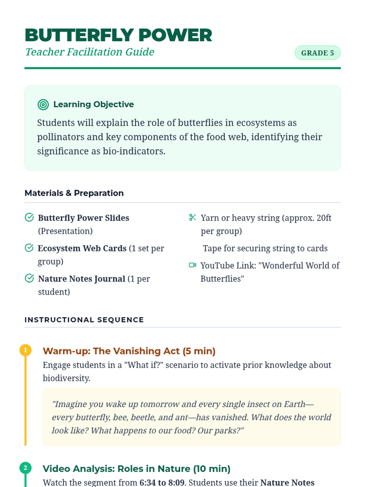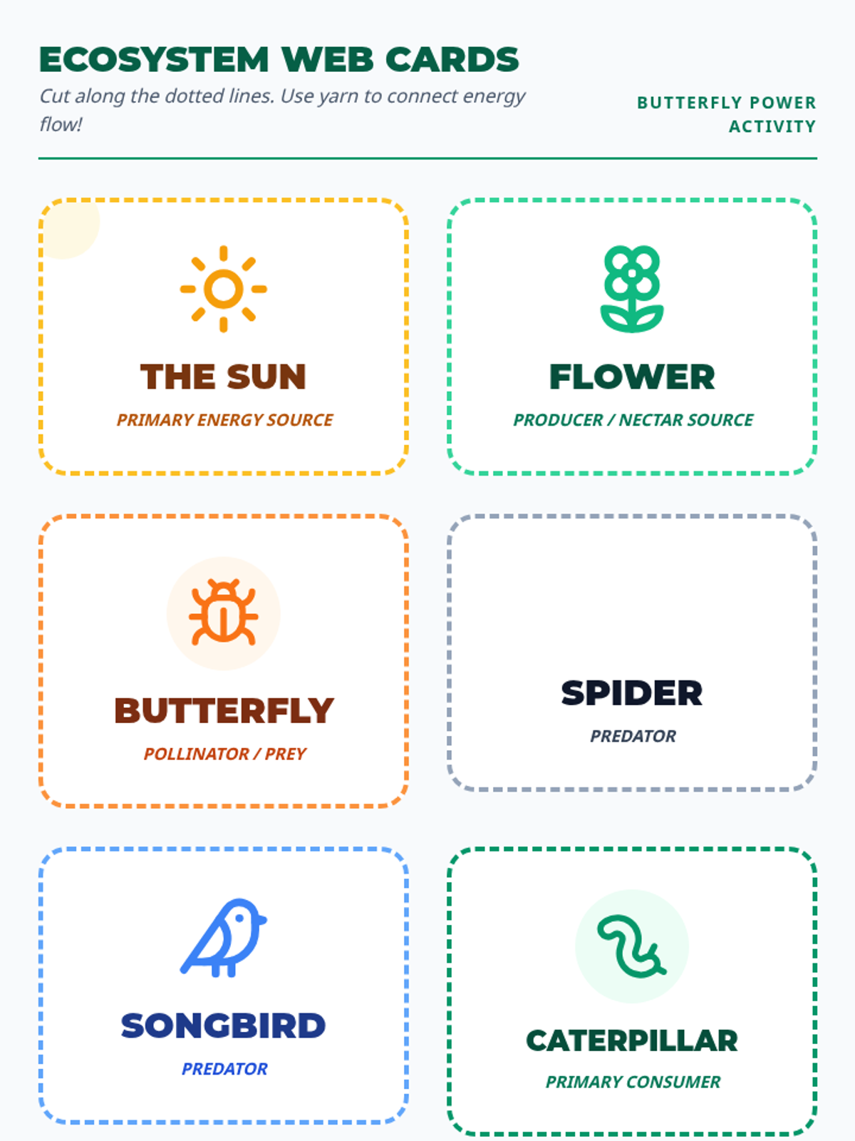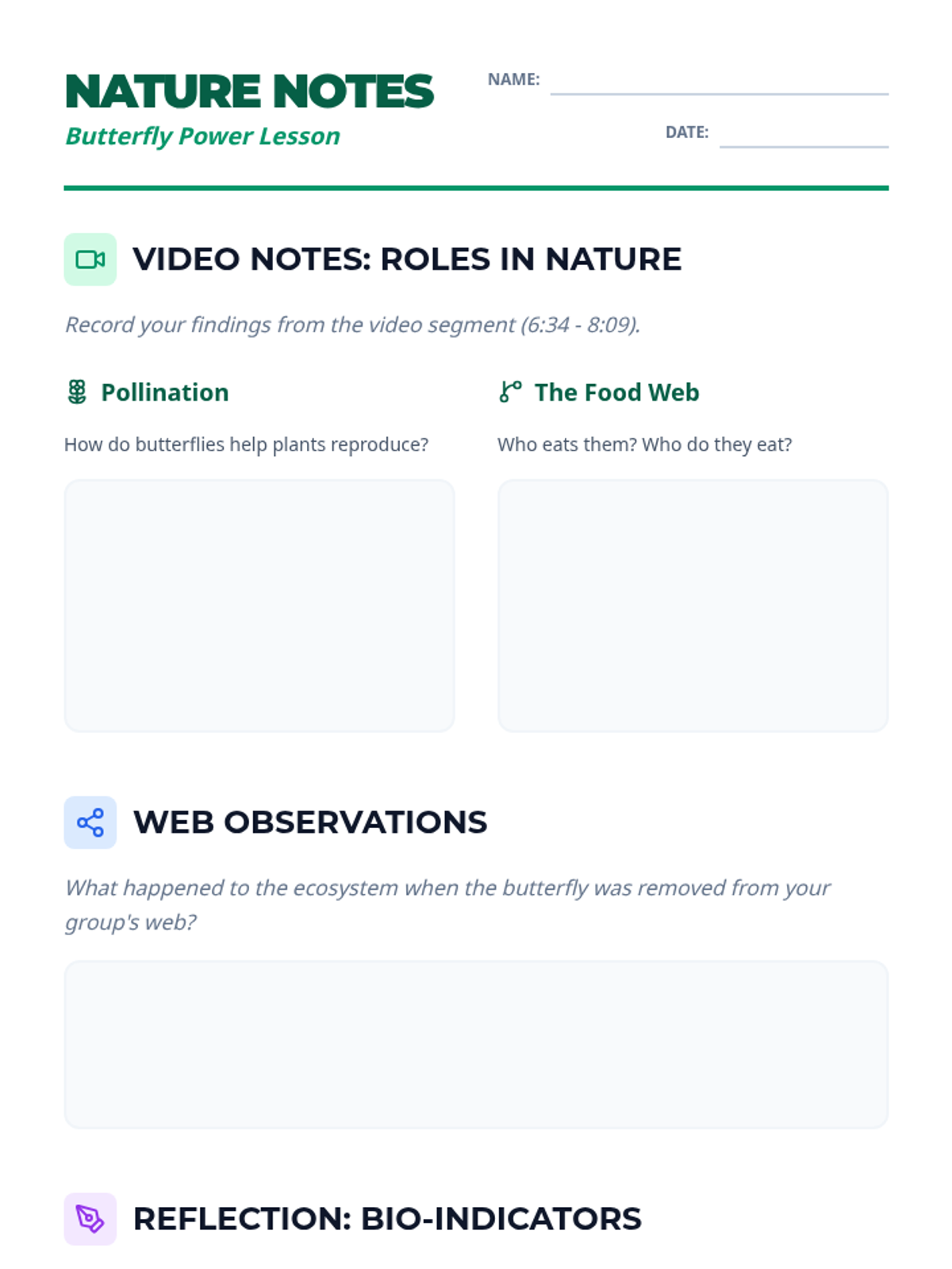 A lesson exploring the critical roles butterflies play in ecosystems as pollinators and key links in the food web. Students will engage with a video, a hands-on food web activity, and reflective journaling.