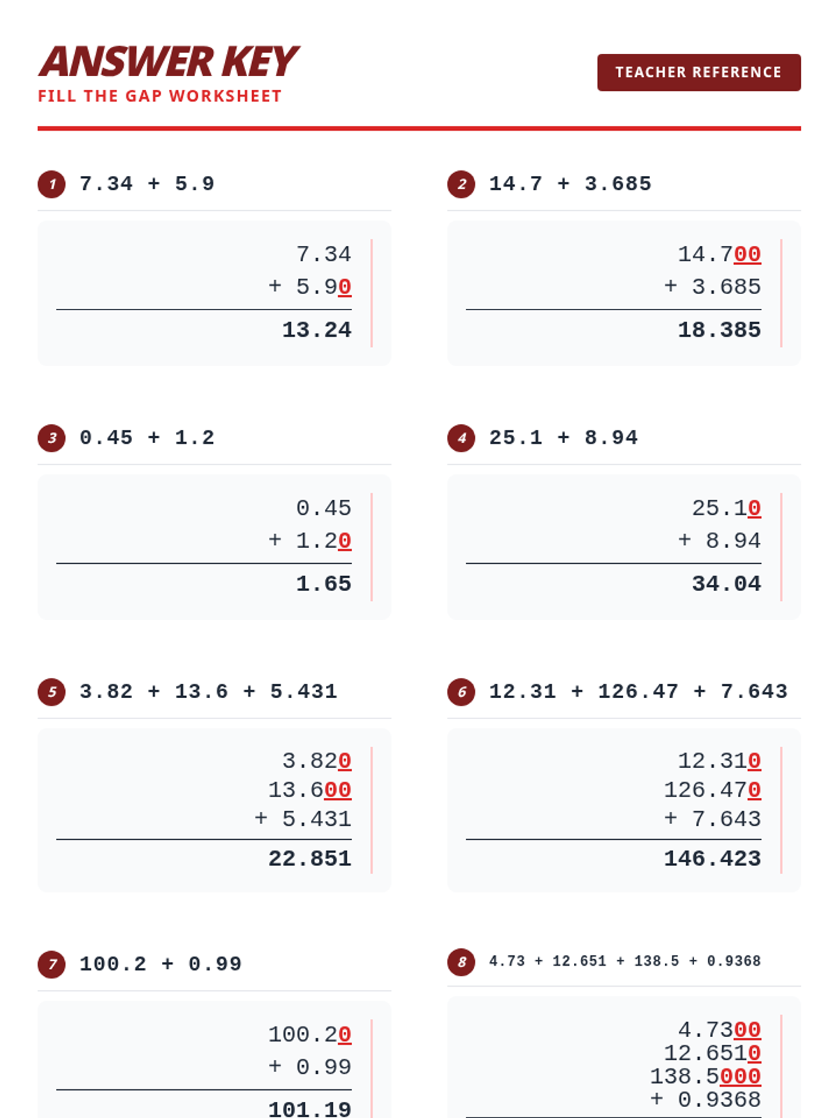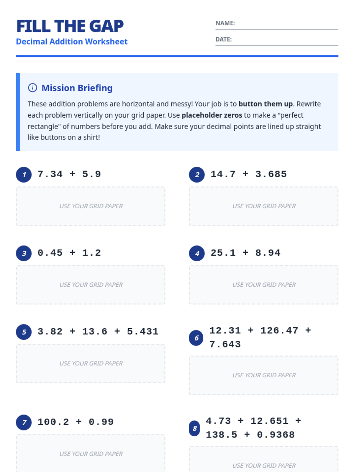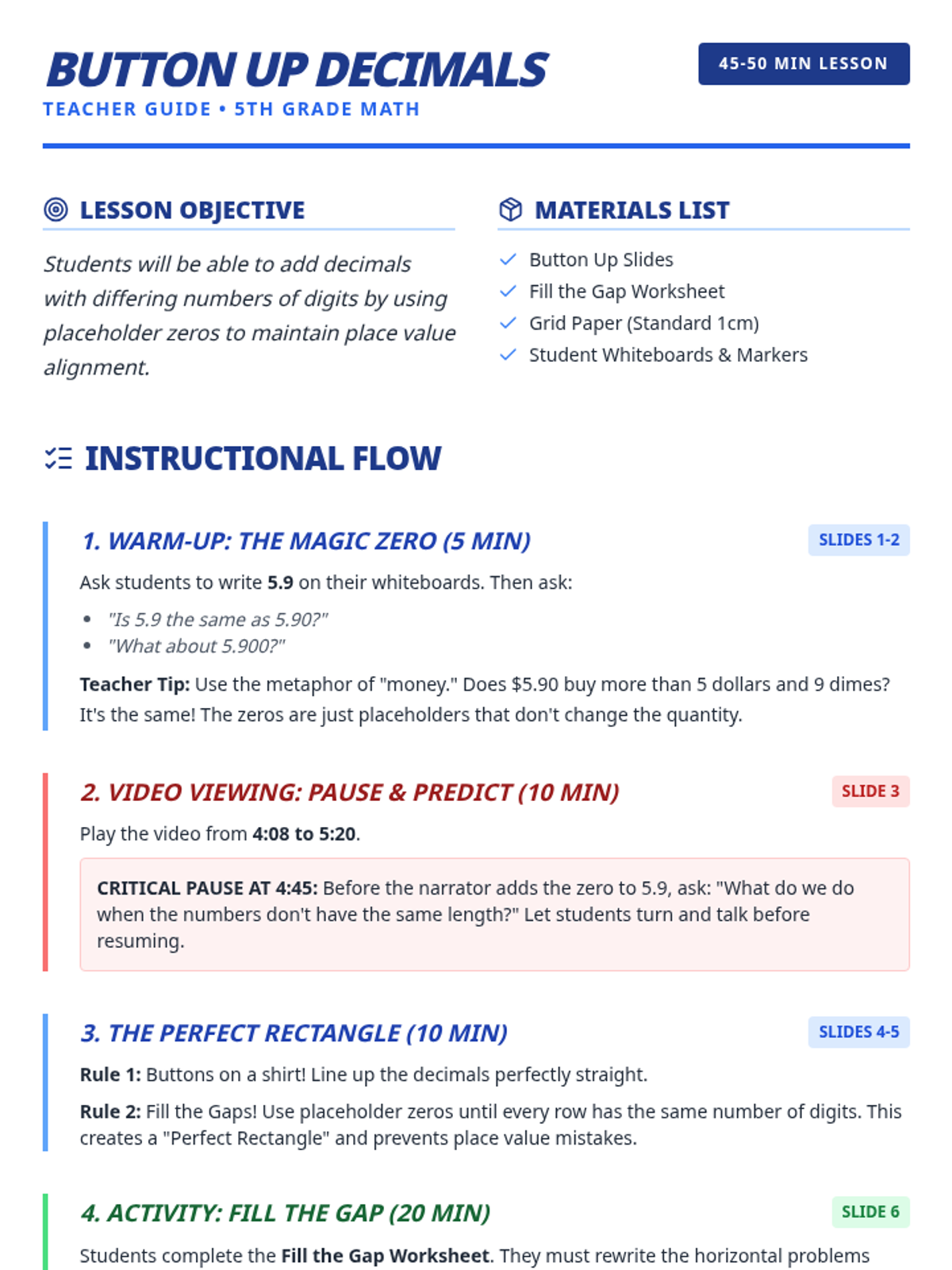 A 5th-grade math lesson focused on adding decimals with different lengths. Students learn to use placeholder zeros to create 'perfect rectangles' and align decimal points like buttons on a shirt.