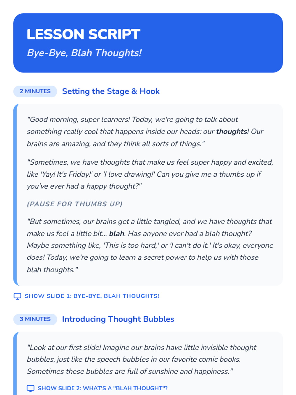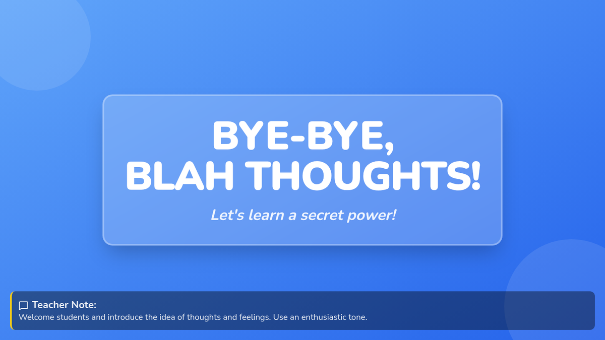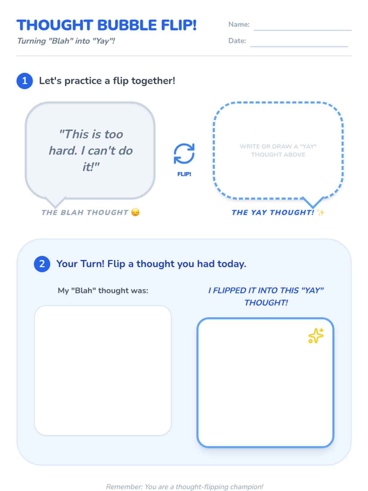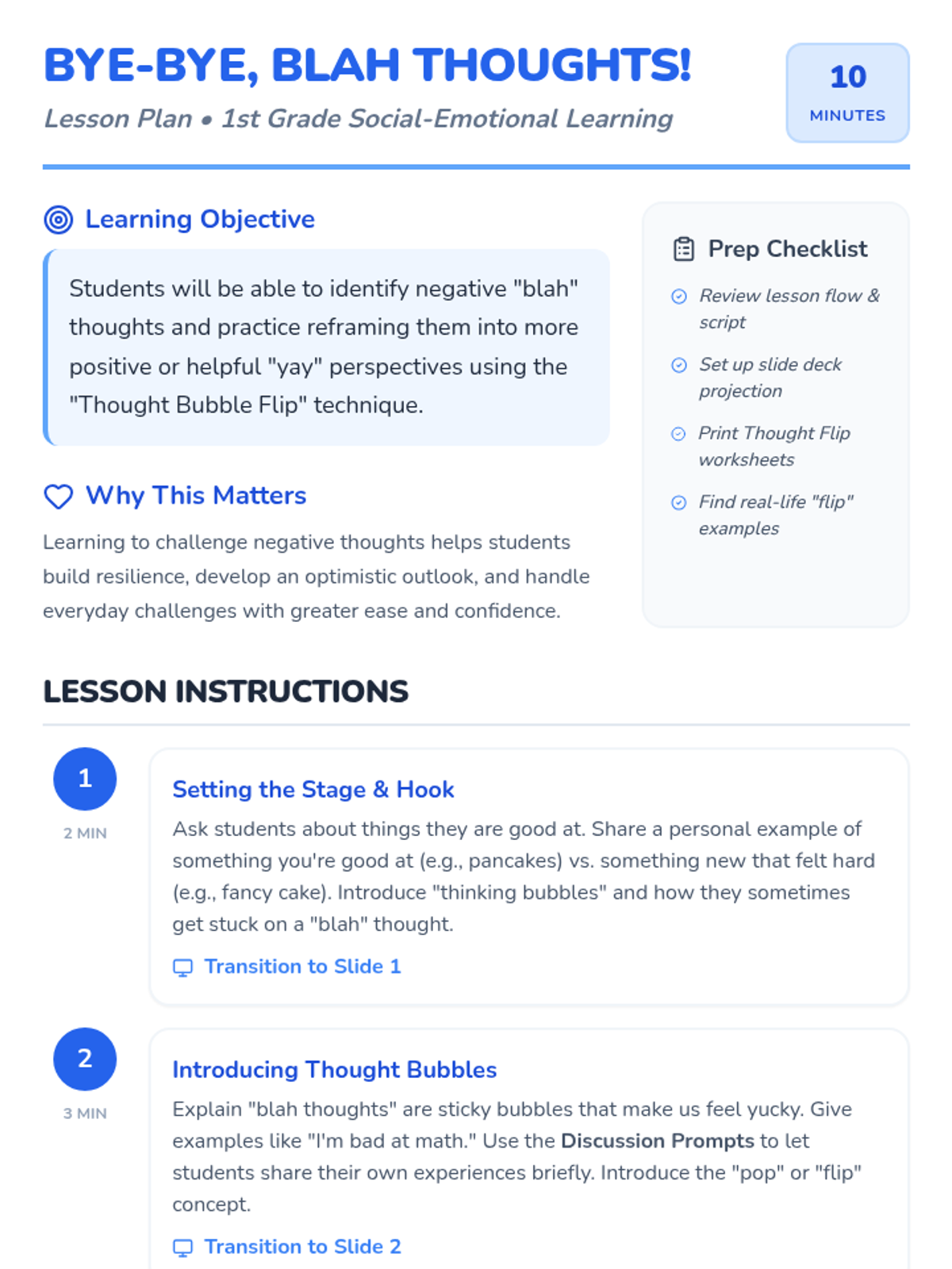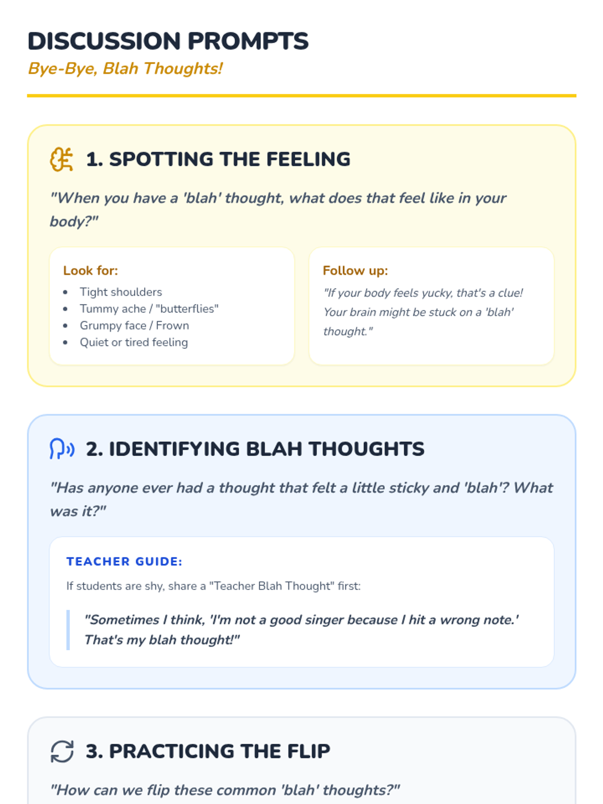 A quick, 10-minute lesson for 1st graders to help them identify 'blah thoughts' (negative, inflexible thinking) and learn the 'Thought Bubble Flip' to turn them into 'yay thoughts.'