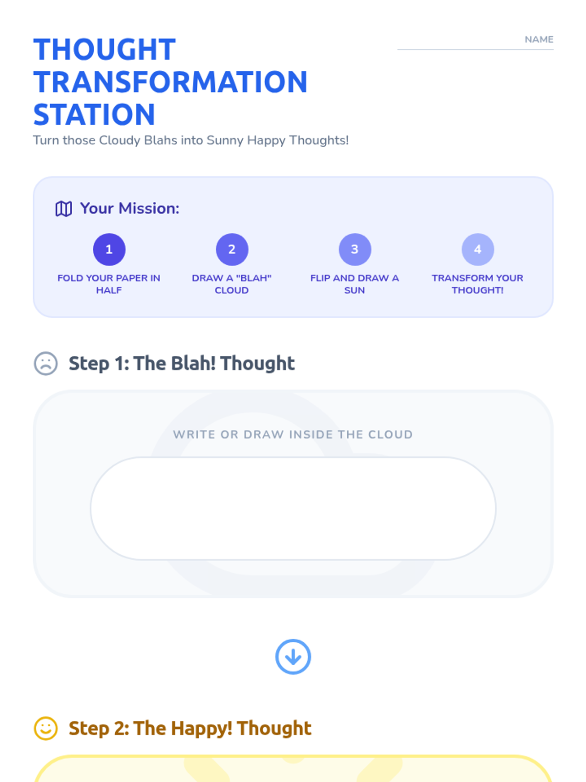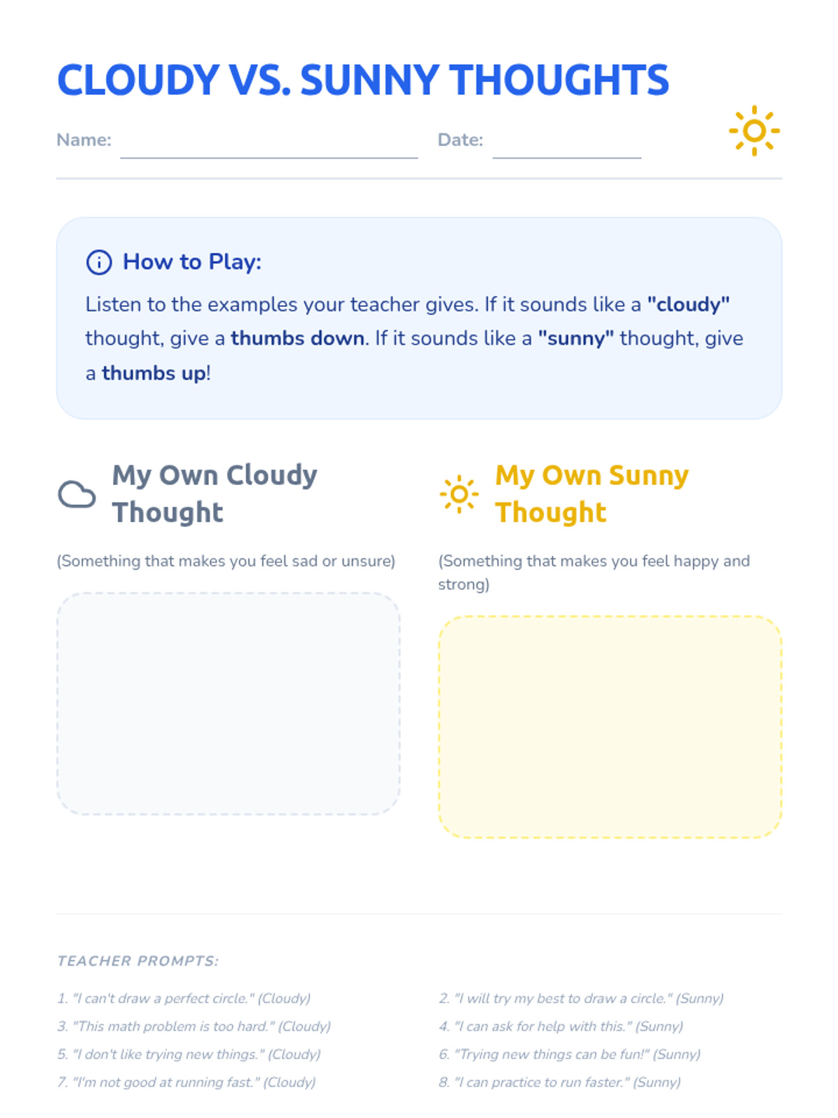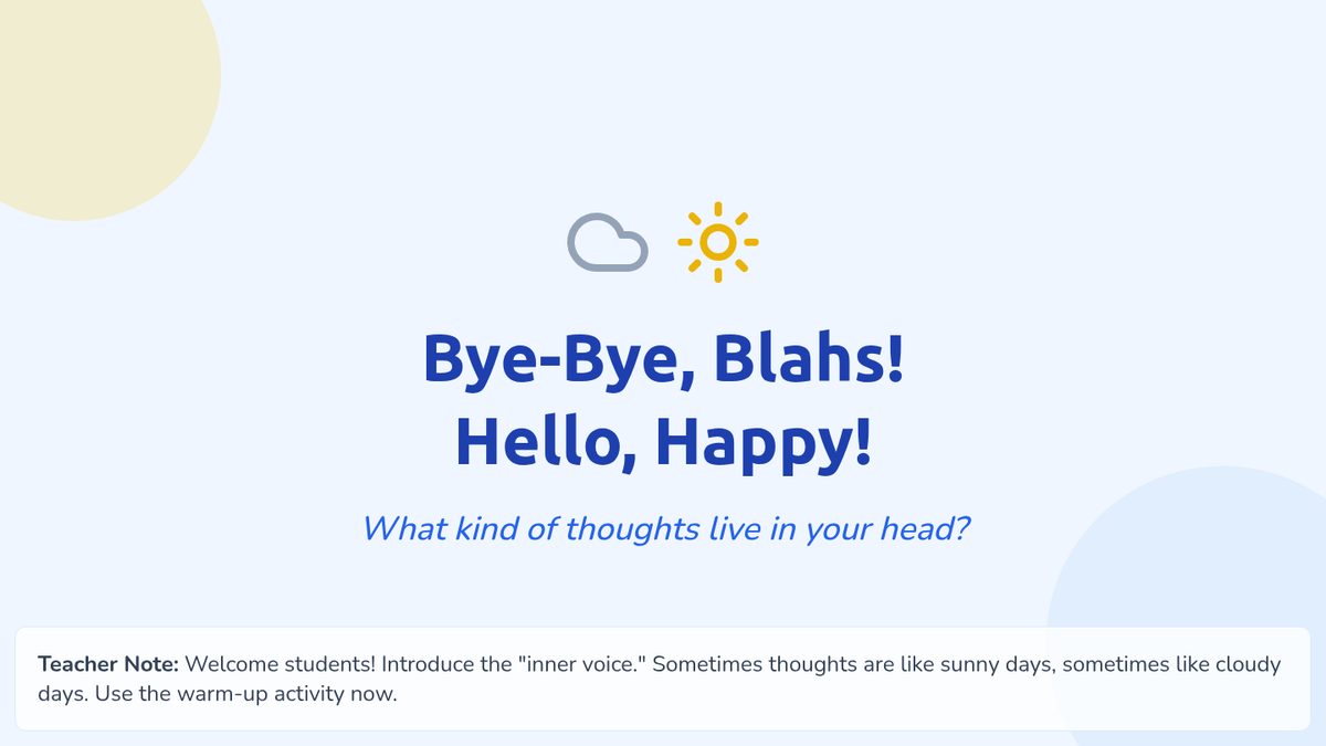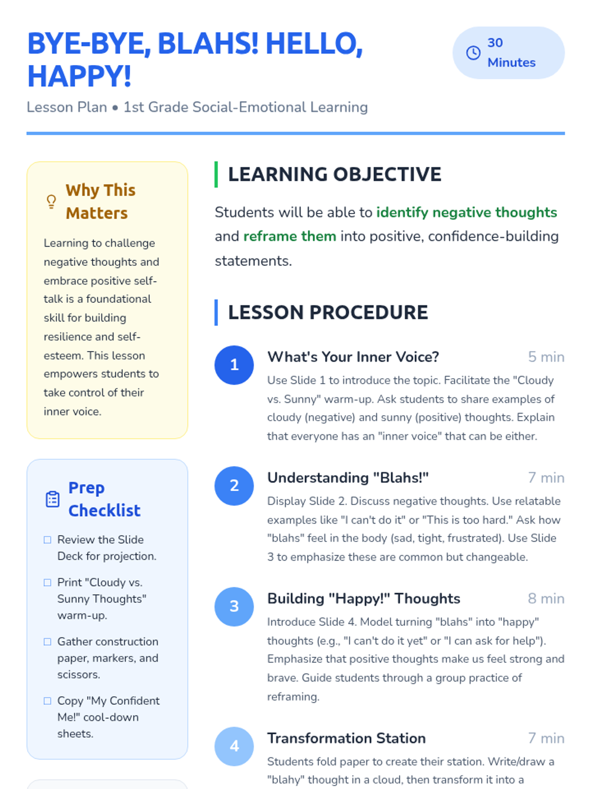 This 30-minute lesson for 1st-grade students introduces the concept of inner voice, helping them identify negative self-talk ('Blahs') and learn to transform it into positive, confidence-building thoughts ('Happy'). Through interactive discussion and visual activities, students build emotional resilience and self-esteem.