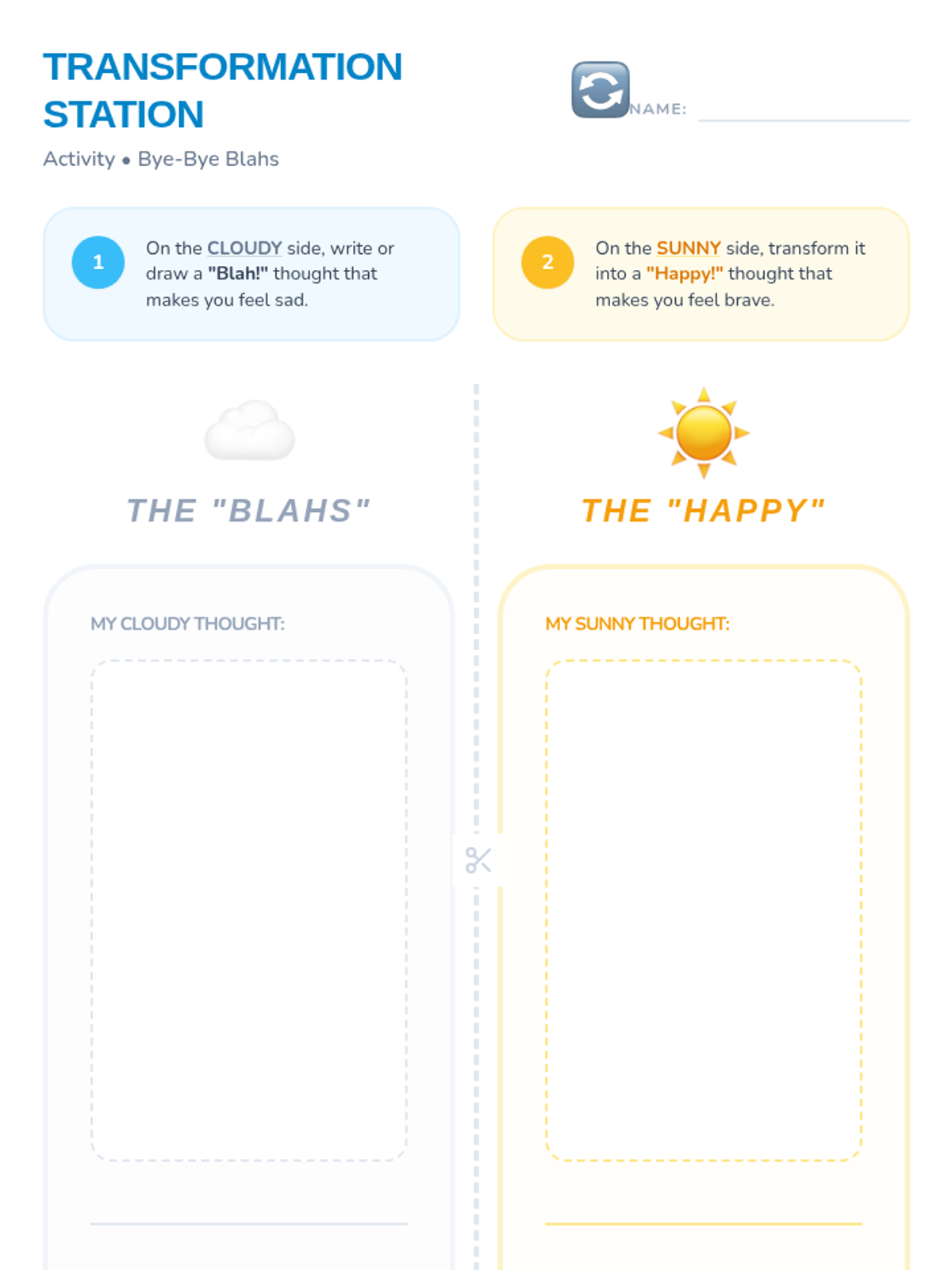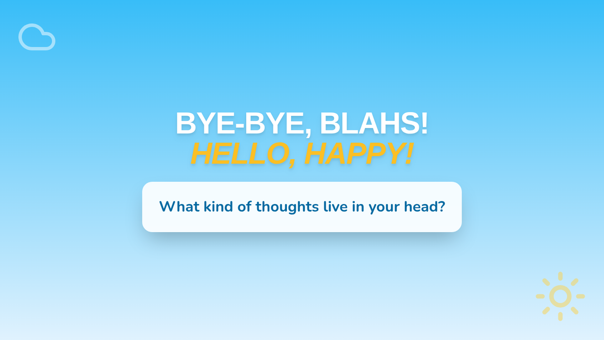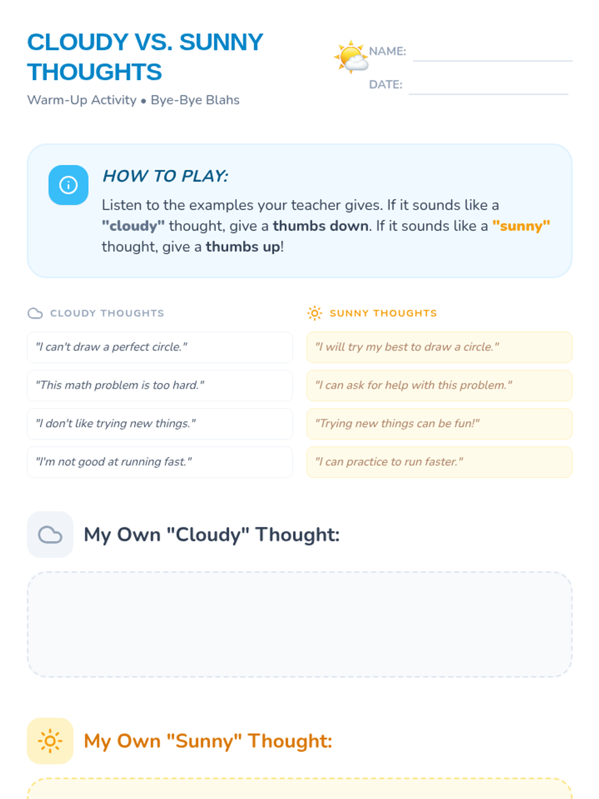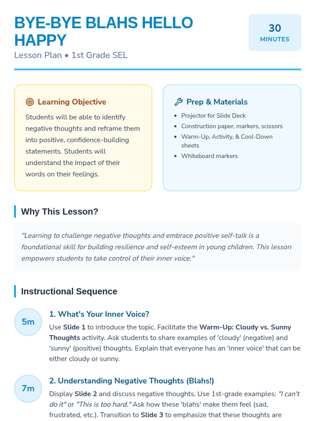 A 30-minute lesson for 1st-grade students to identify negative self-talk ('Blahs') and reframe them into positive, confidence-building thoughts ('Happy'). Students explore their inner voice through weather-themed metaphors and interactive activities.