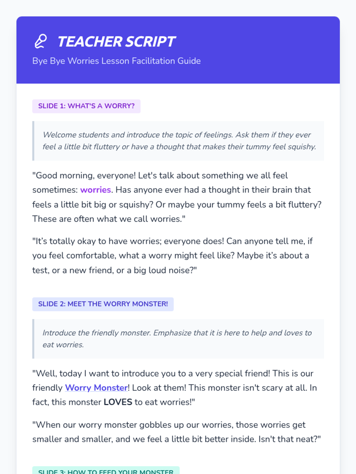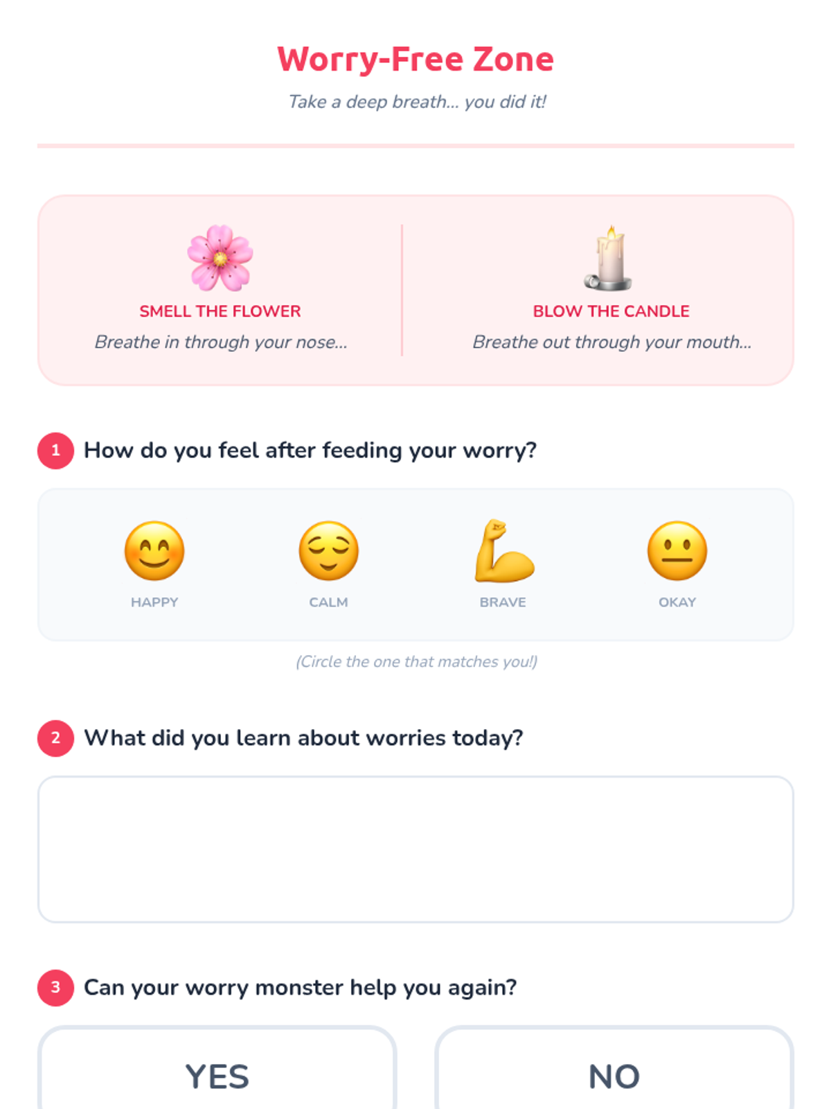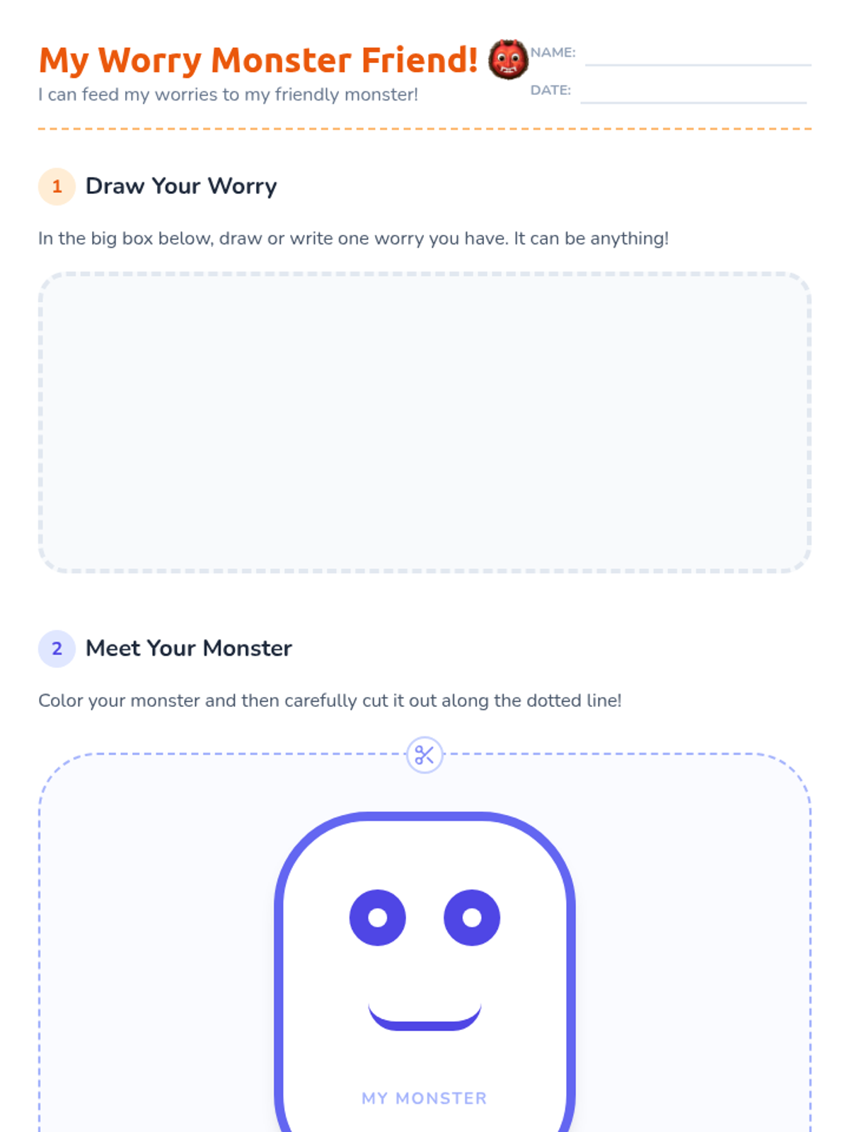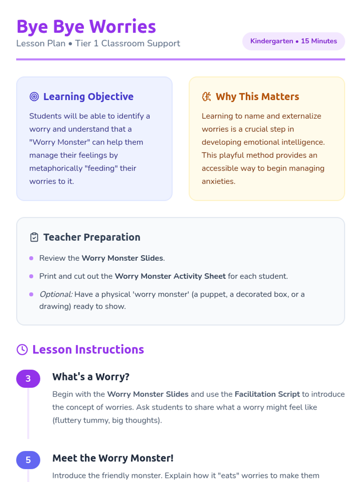 A 15-minute Social-Emotional Learning lesson for Kindergarteners that uses the 'Worry Monster' concept to help students externalize and manage their anxieties. Students will identify a worry, 'feed' it to a friendly monster, and practice emotional regulation.