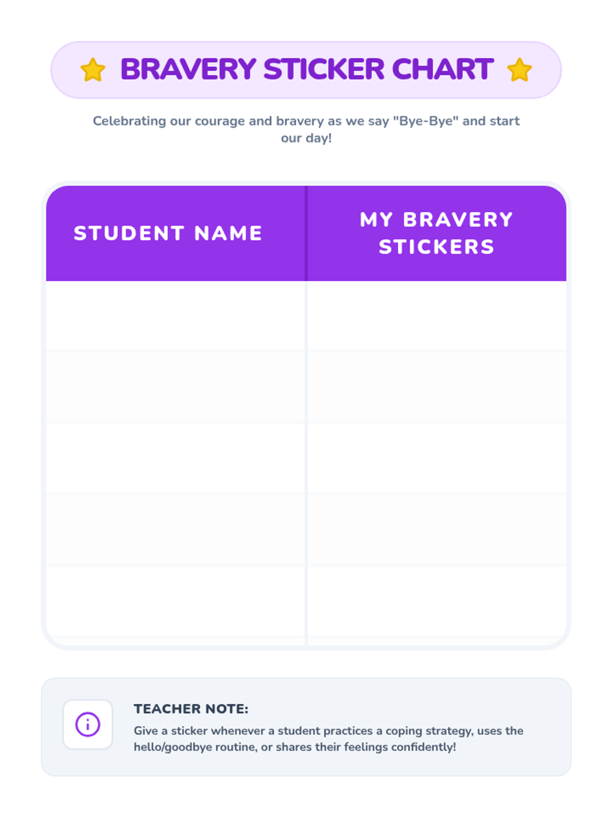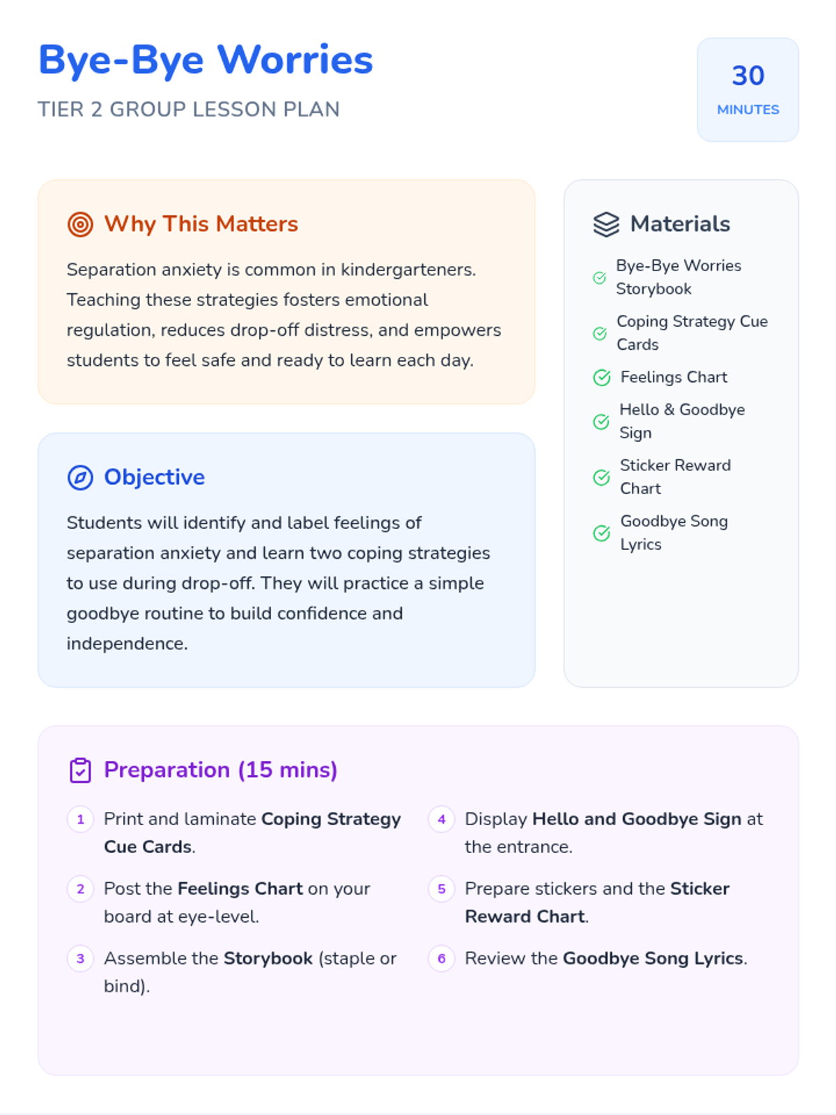 A 30-minute Tier 2 group lesson for kindergarteners to learn coping strategies for separation anxiety during school drop-off. Students will explore feelings, read a story, and practice a goodbye routine to build confidence.