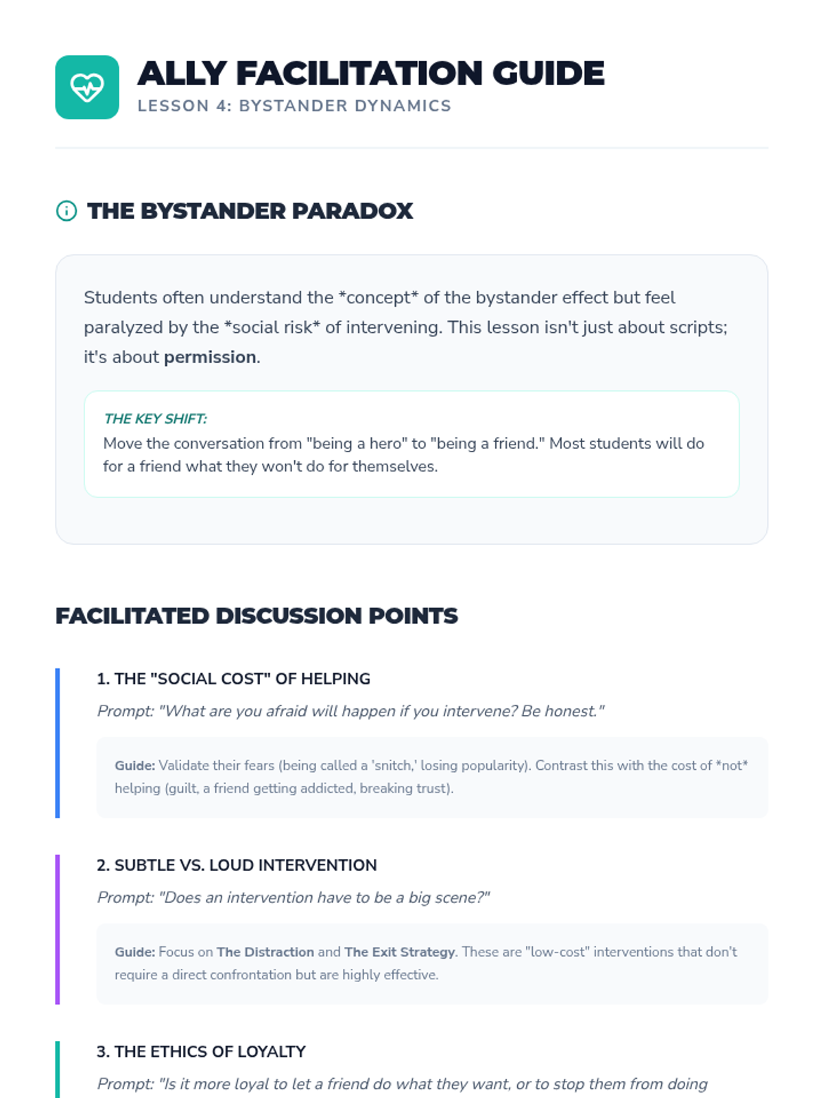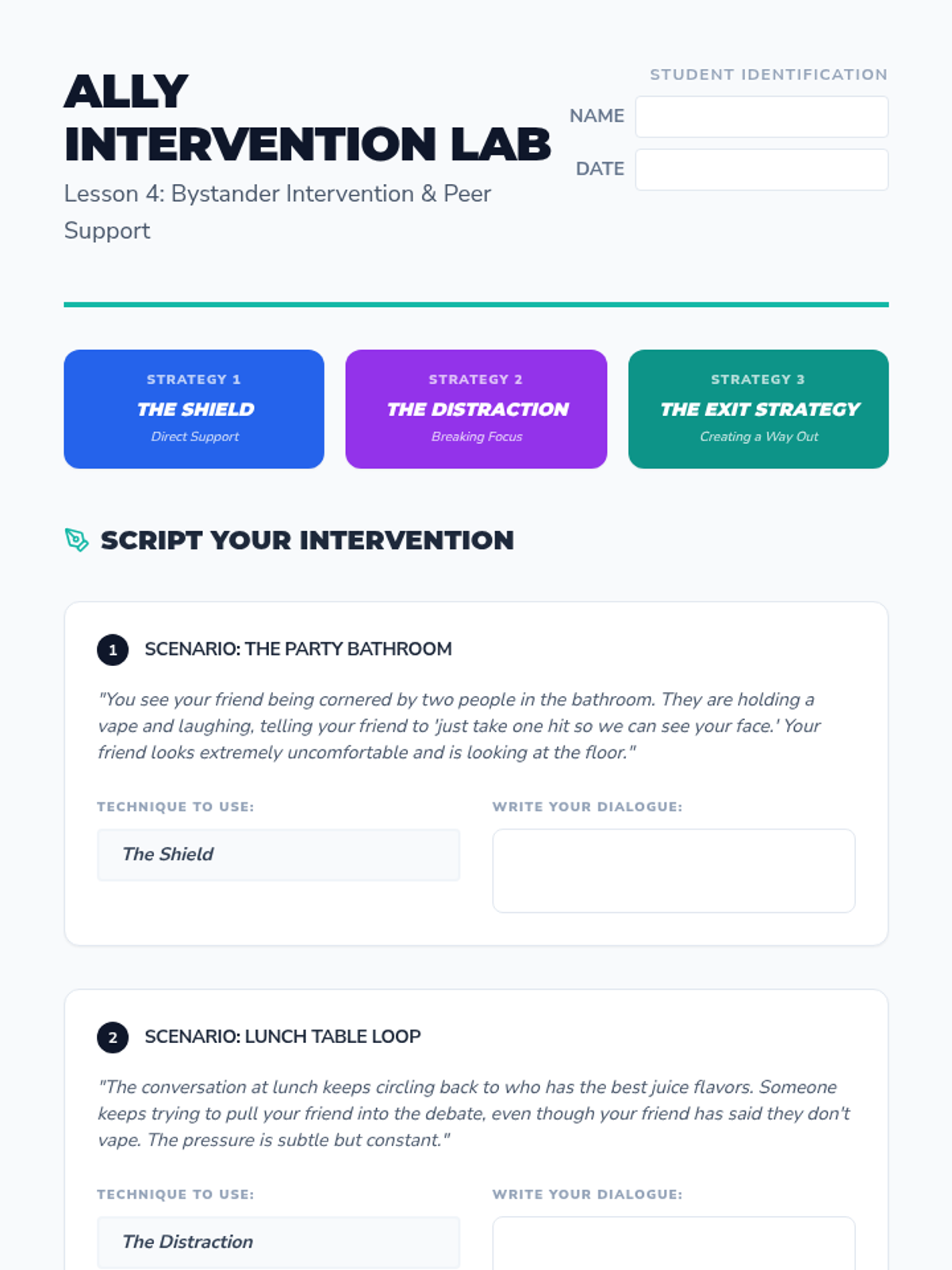 Students shift focus from self-defense to supporting others. They learn how to intervene when a friend is being pressured or wants to quit, practicing supportive dialogue.