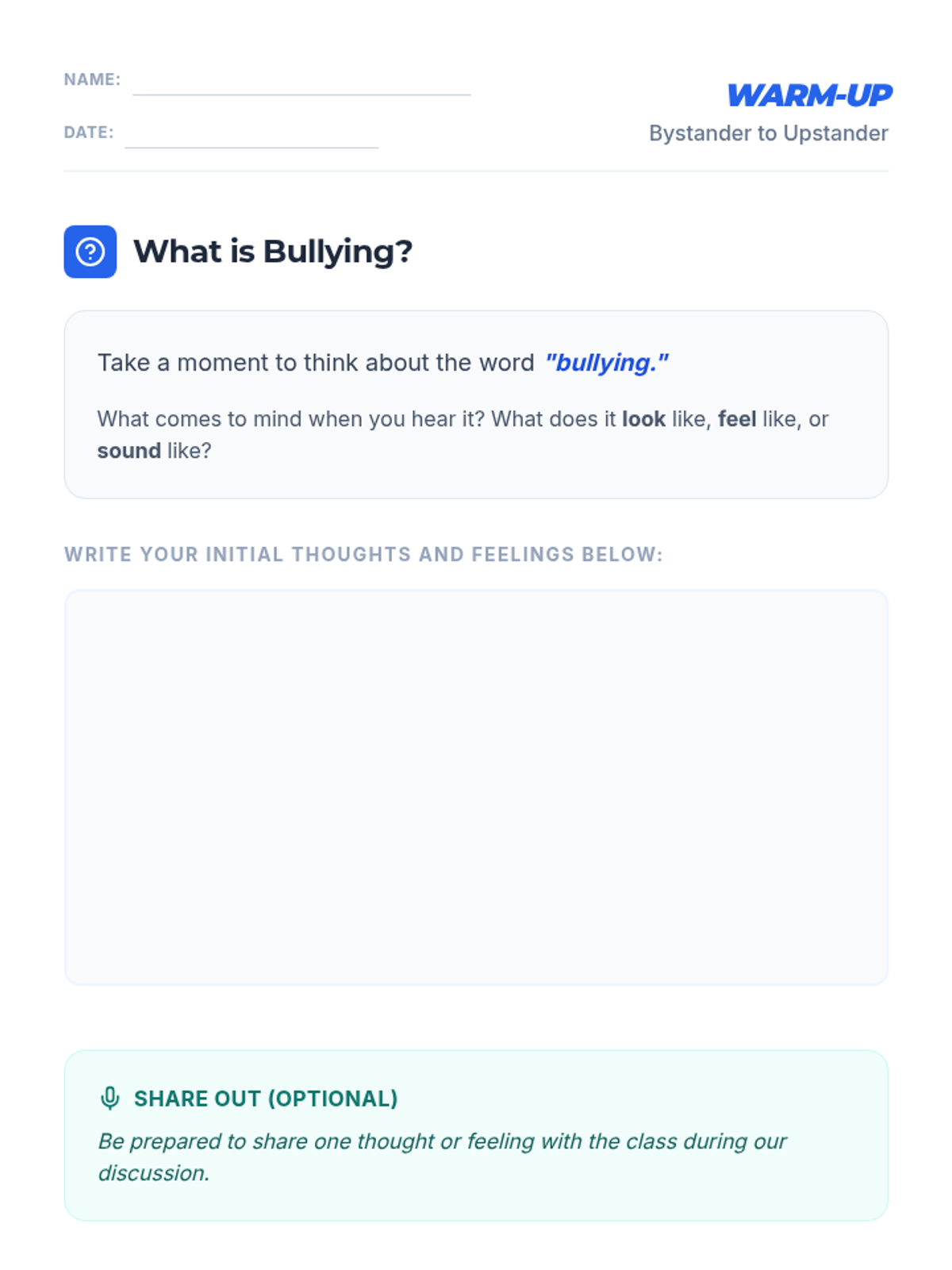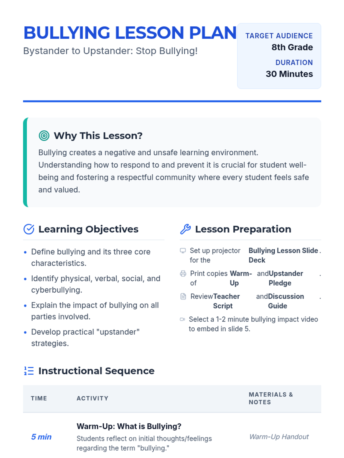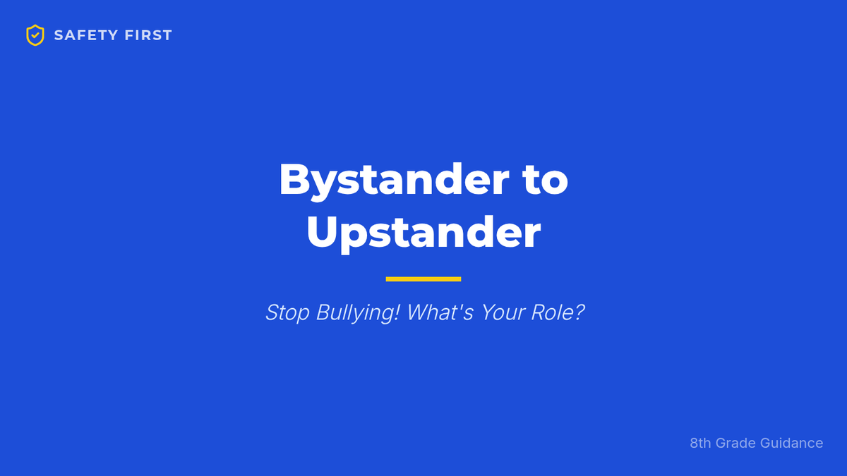 This lesson empowers 8th-grade students to understand, address, and prevent bullying in their school community. Students will learn to recognize different forms of bullying, comprehend its impact, and equip themselves with practical strategies to be an 'upstander'.