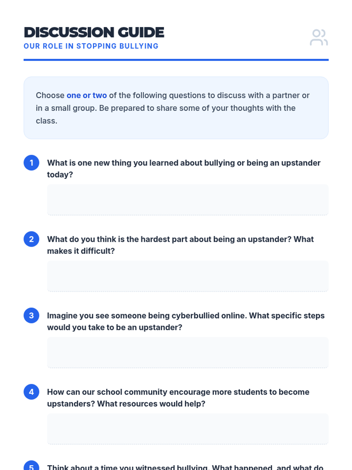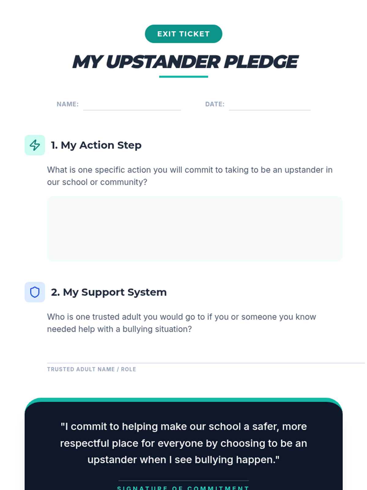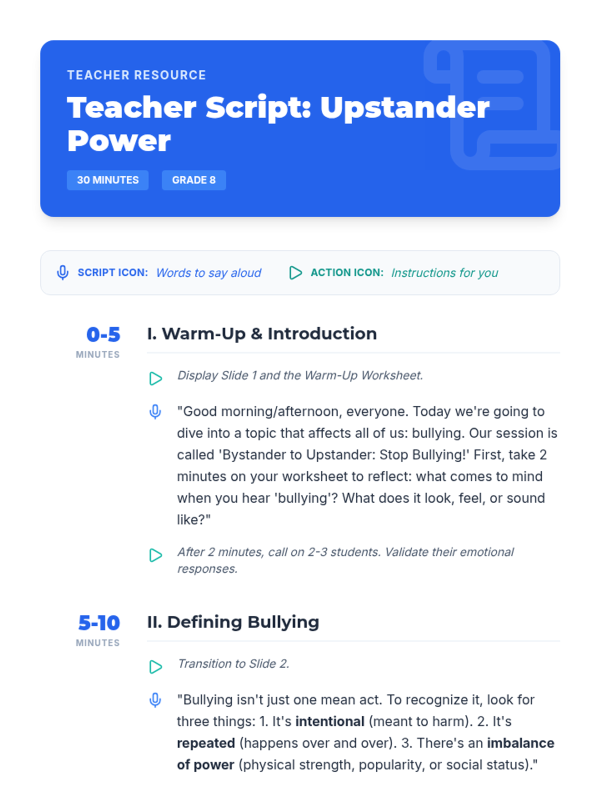 This lesson empowers 8th-grade students to understand, address, and prevent bullying in their school community. Students will learn to recognize different forms of bullying, comprehend its impact, and equip themselves with practical strategies to be an 'upstander'.