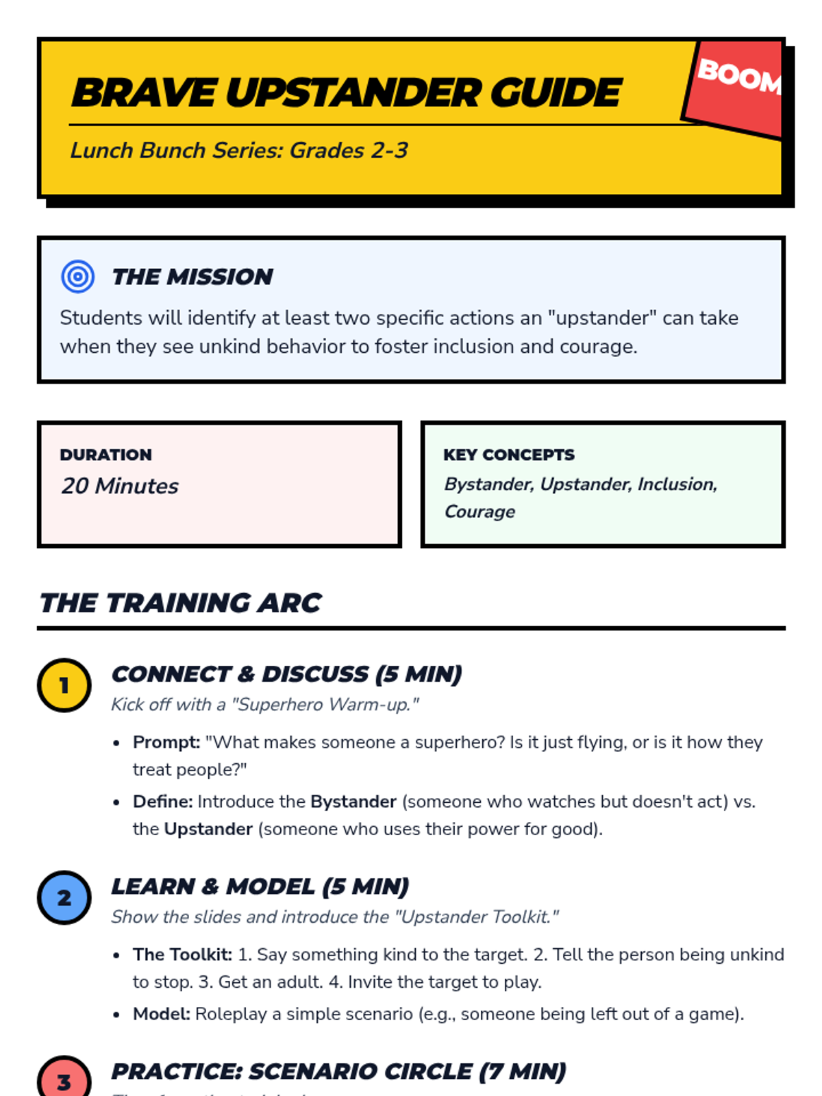 A 20-minute Lunch Bunch lesson for grades 2-3 focused on empowering students to move from passive bystanders to active upstanders using simple, courageous actions.
