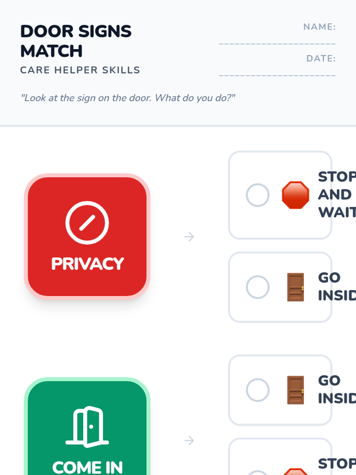 A comprehensive lesson on identifying and matching essential safety signs from community, household, road, and workplace environments. This lesson focuses on visual discrimination and functional literacy through picture-to-picture matching tasks.