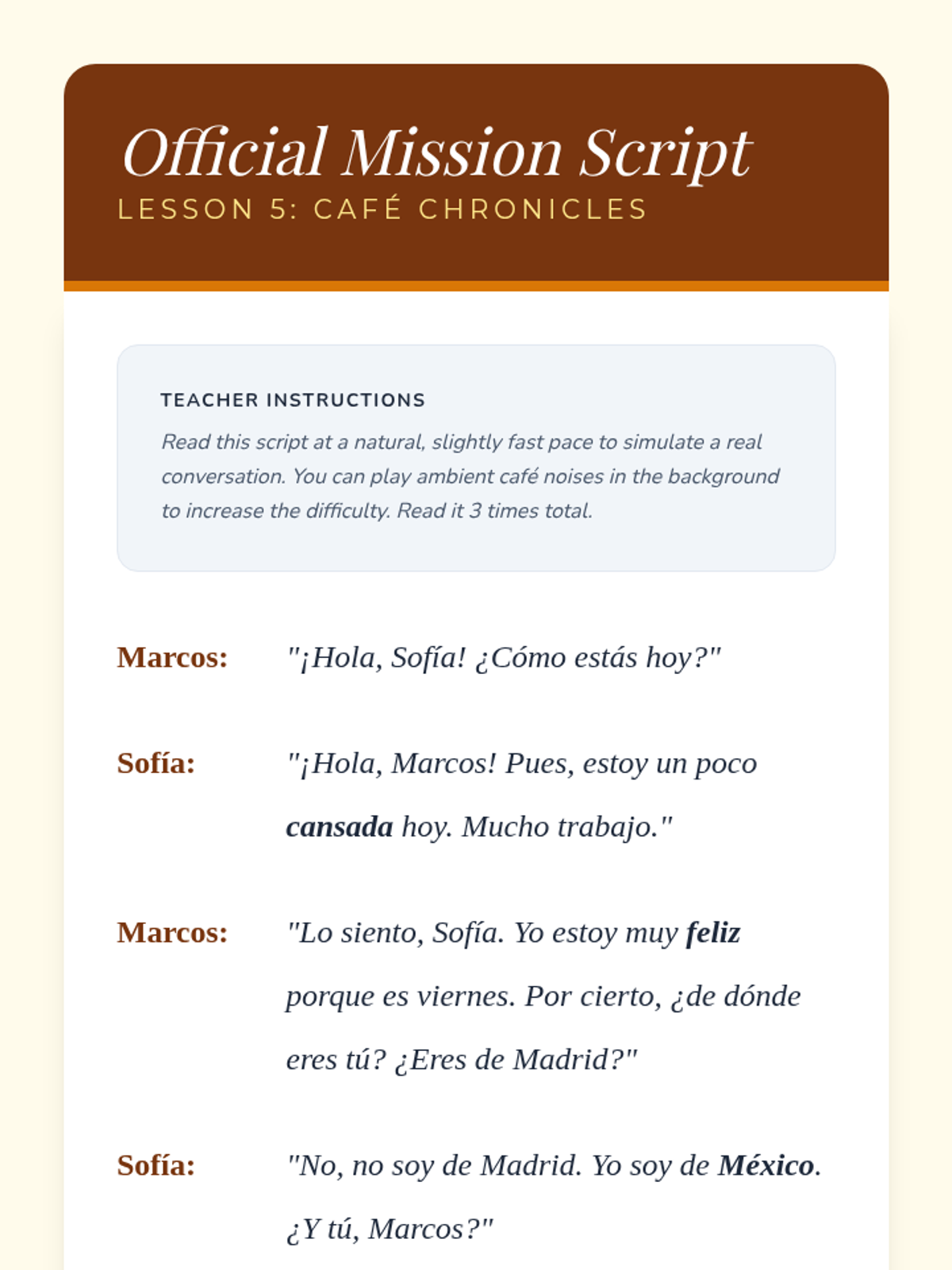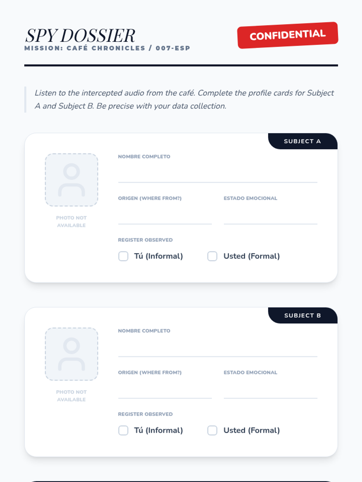 Students synthesize all skills by listening to a complex dialogue in a simulated café setting, extracting information to create character profiles.