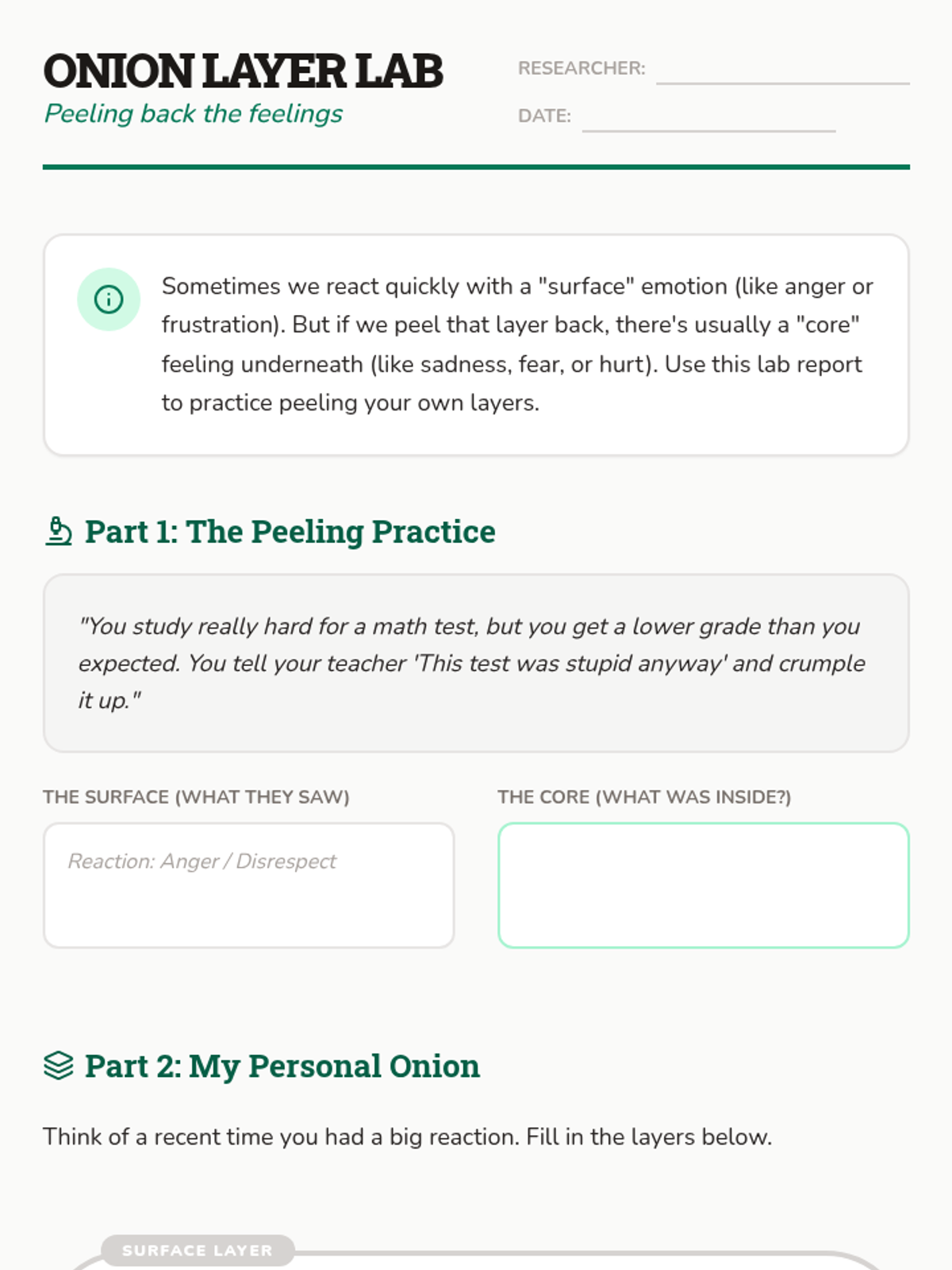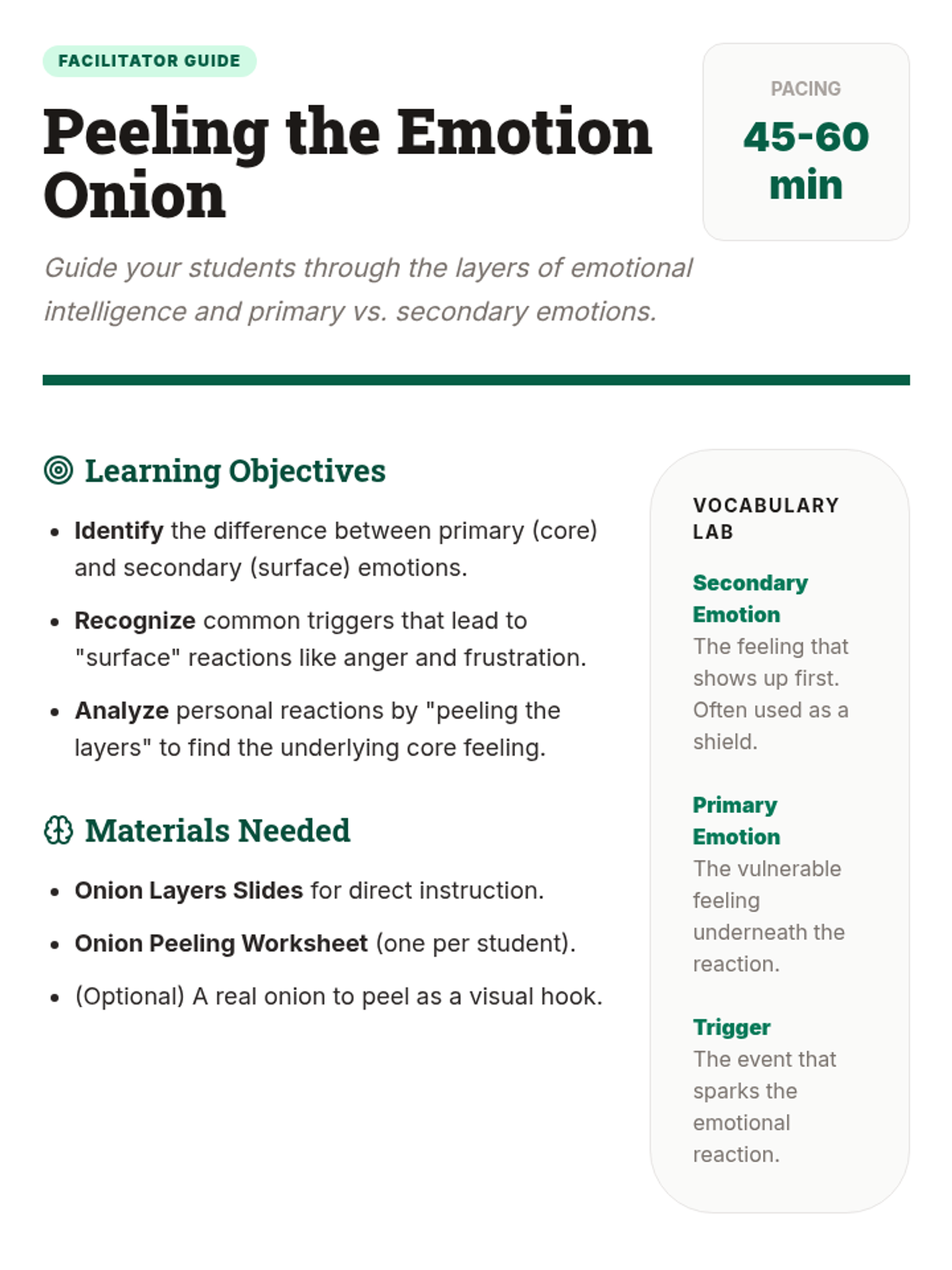A lesson exploring emotional depth using the onion metaphor, helping students identify surface reactions versus core feelings and the triggers that connect them.