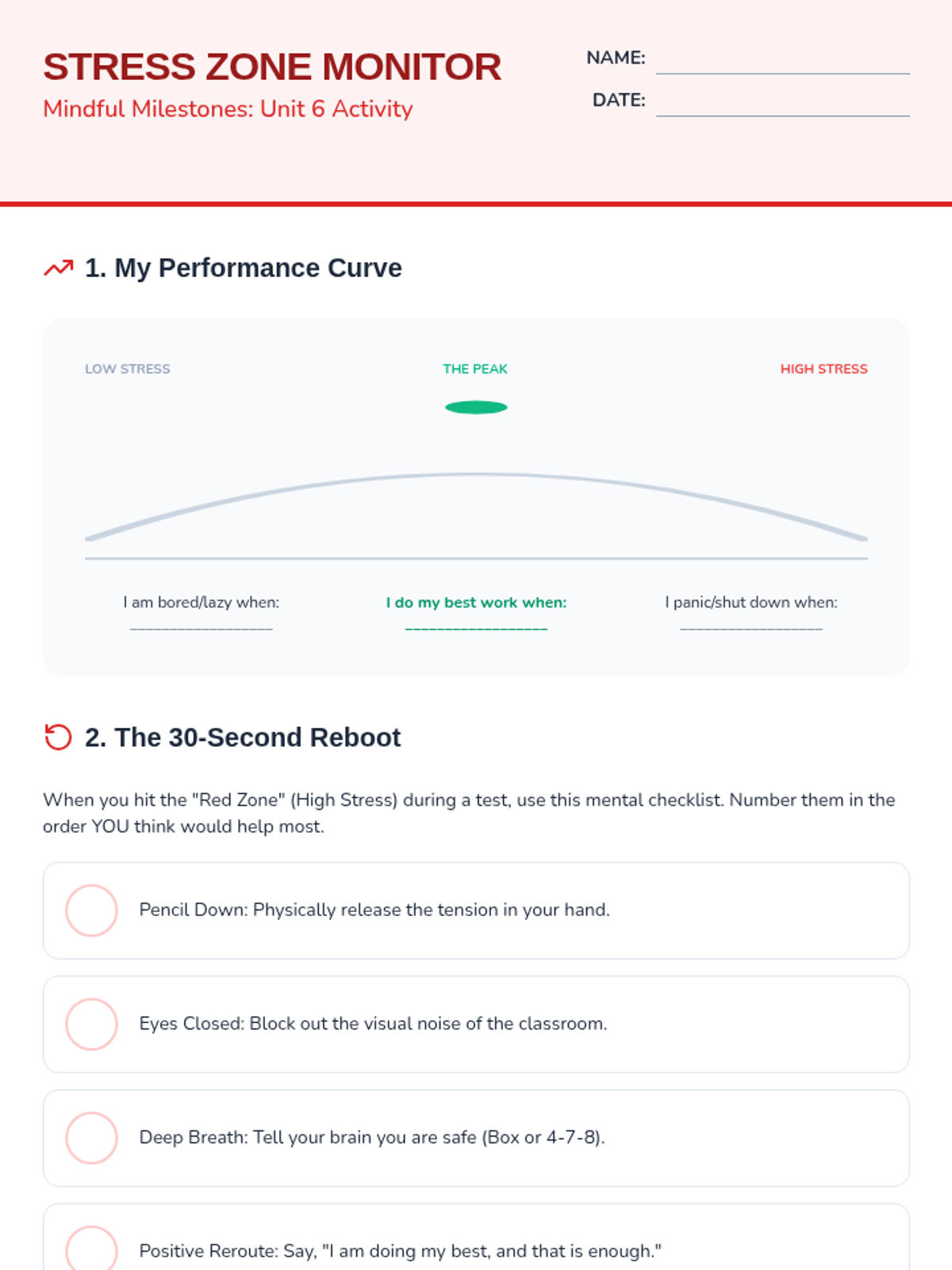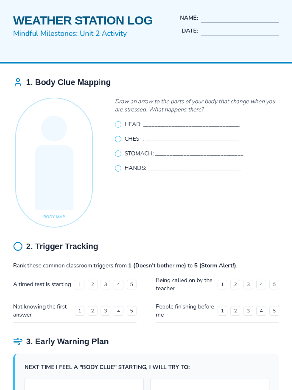 Identifying personal triggers and the physical sensations of stress before they escalate.
