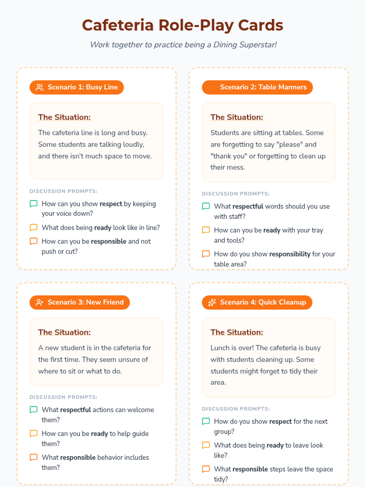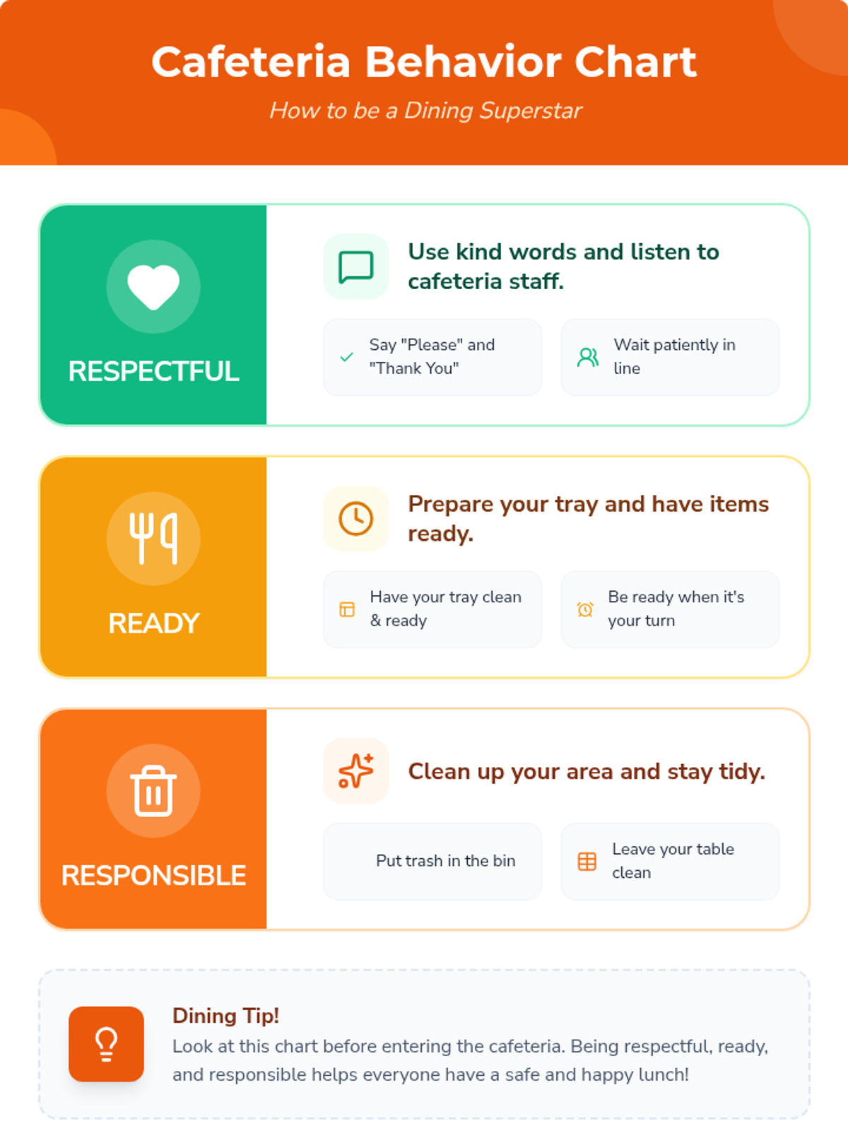 Focuses on manners, cleanliness, and respectful interactions during lunch and snack times in the cafeteria.