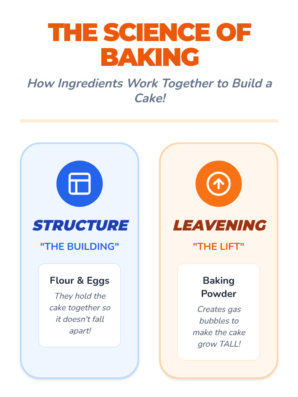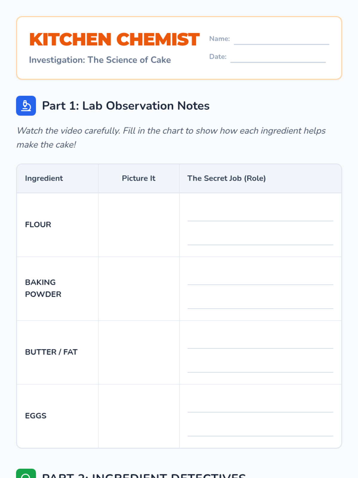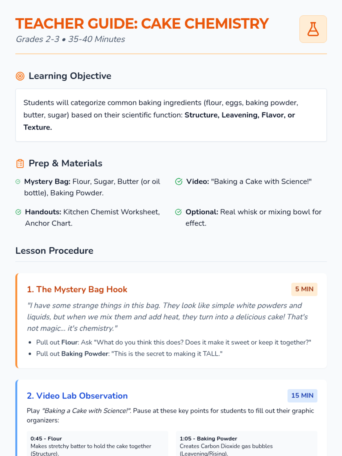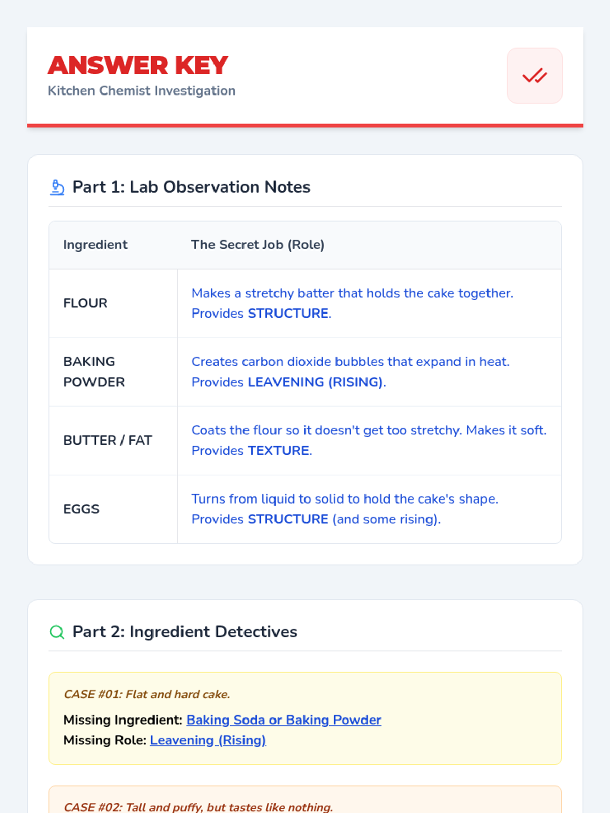 Students explore the chemistry of baking by categorizing ingredients based on their specific functions: Structure, Leavening, Flavor, and Texture. Through a video observation and a 'detective' activity, they learn how chemical reactions transform liquid batter into solid cake.
