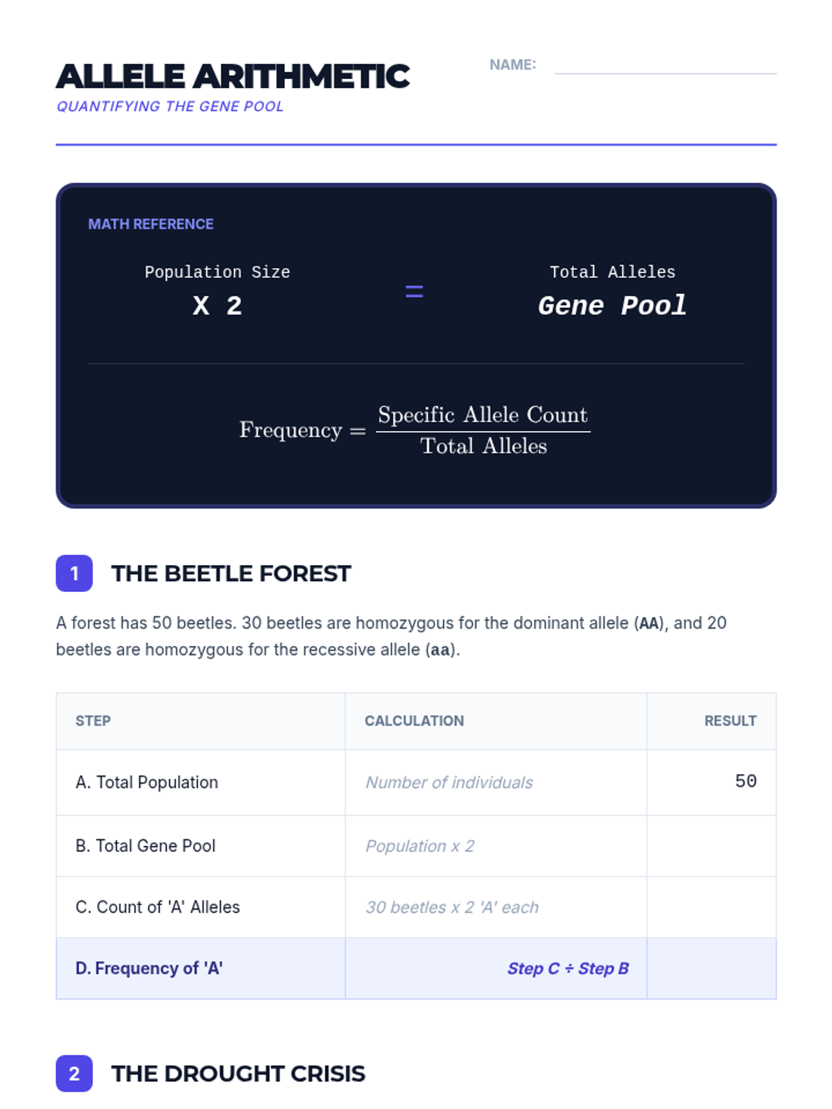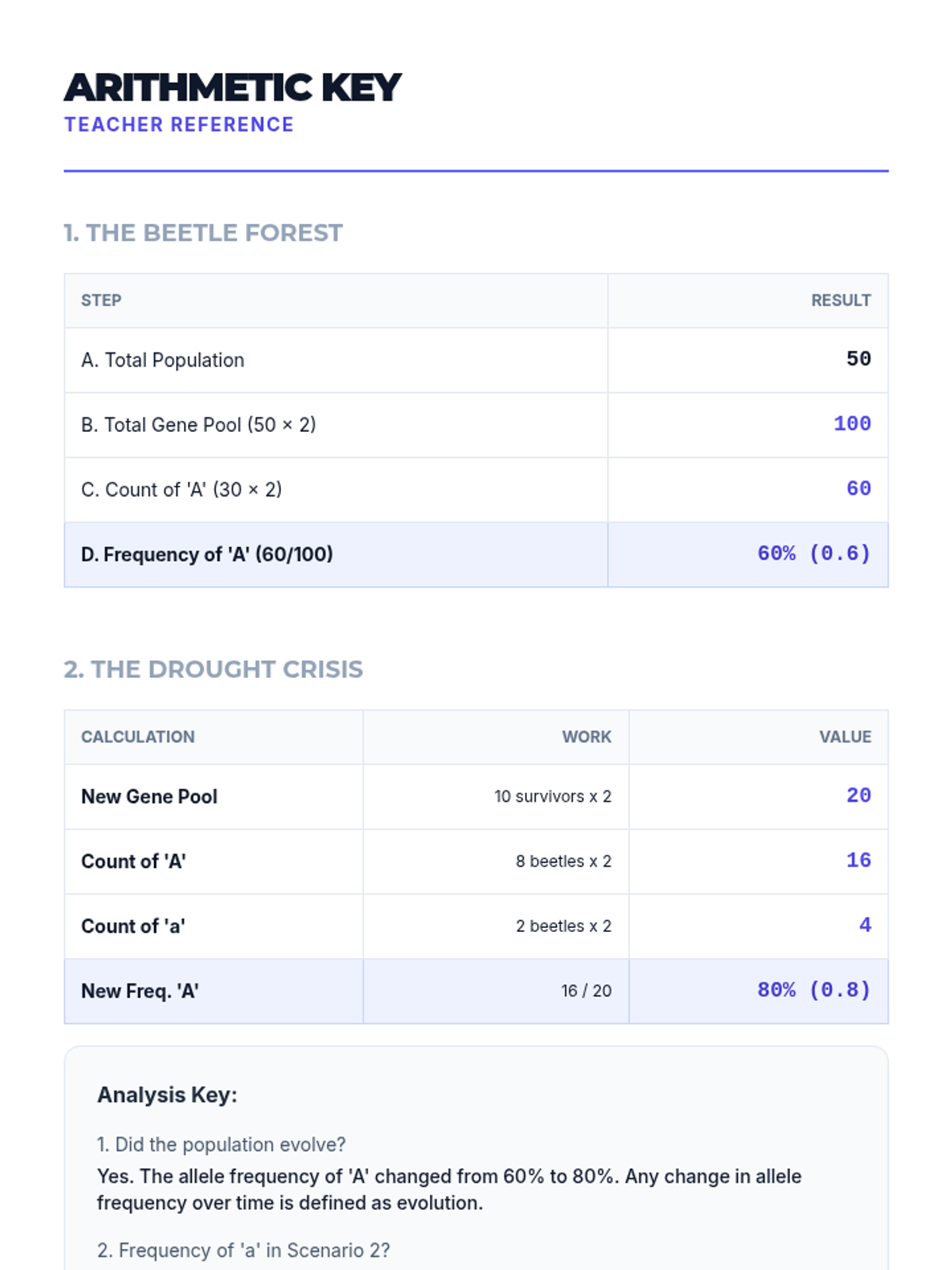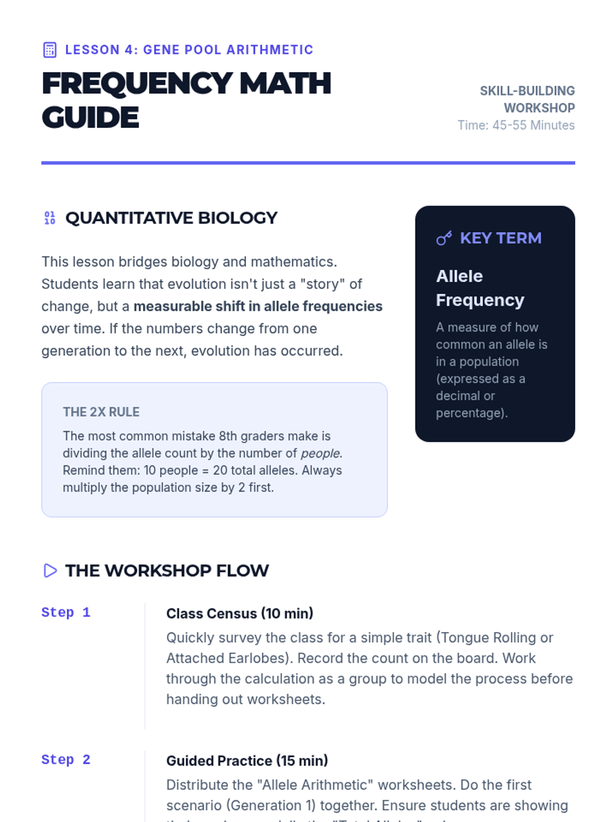 Students practice calculating allele frequencies within a gene pool. This workshop focuses on the mathematical tools used to quantify evolutionary change over generations.