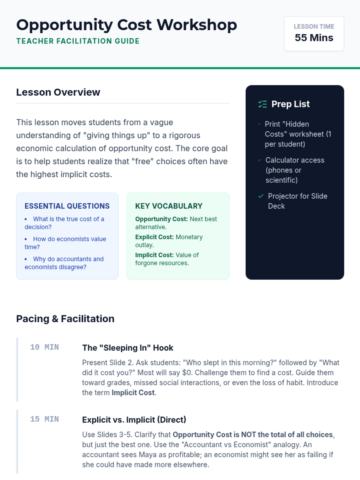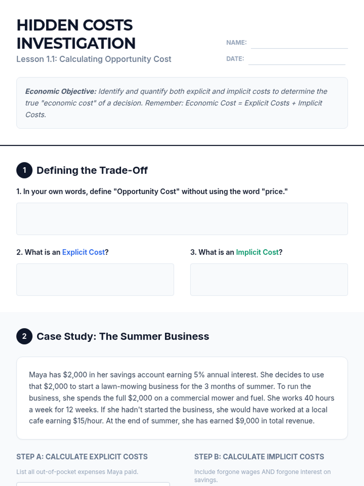 Students analyze the 'next best alternative' in various scenarios, distinguishing between explicit monetary costs and implicit opportunity costs to identify the true cost of choices.