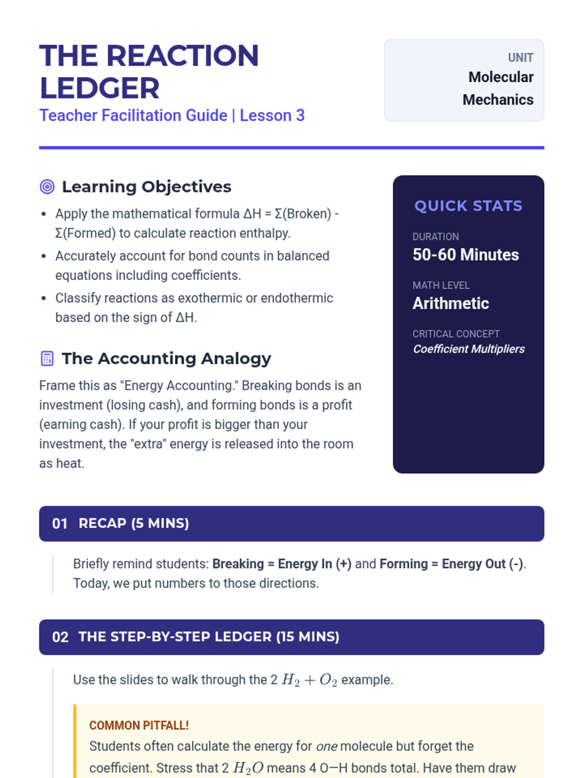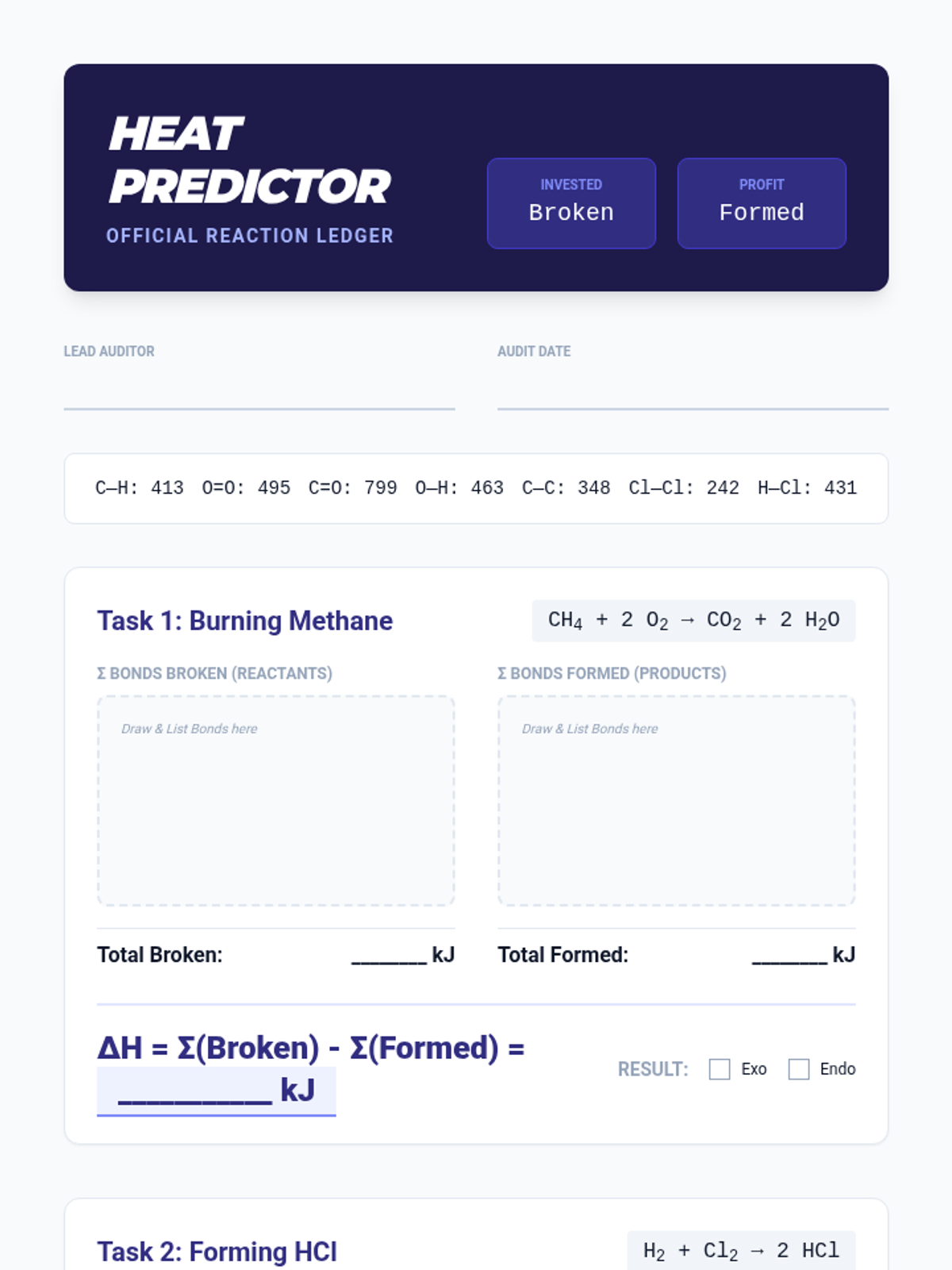 Students perform enthalpy calculations using the 'Sum of Broken minus Sum of Formed' method.