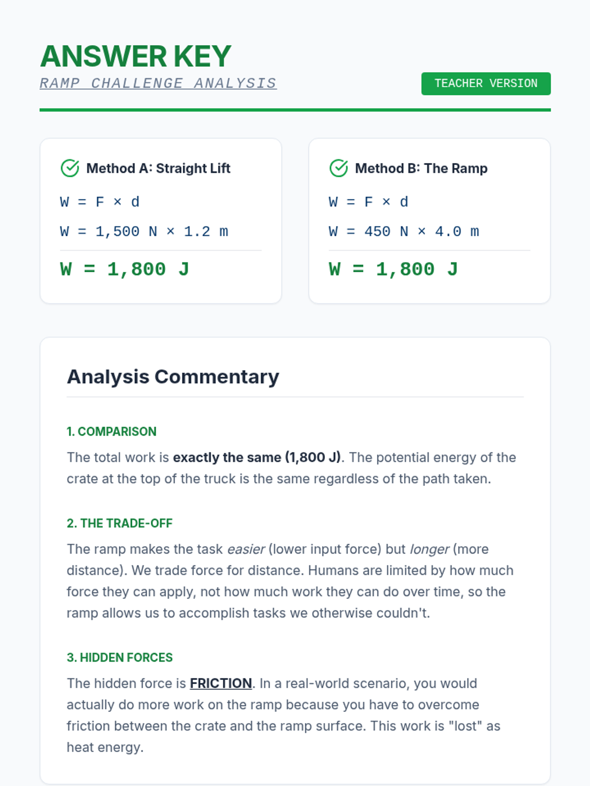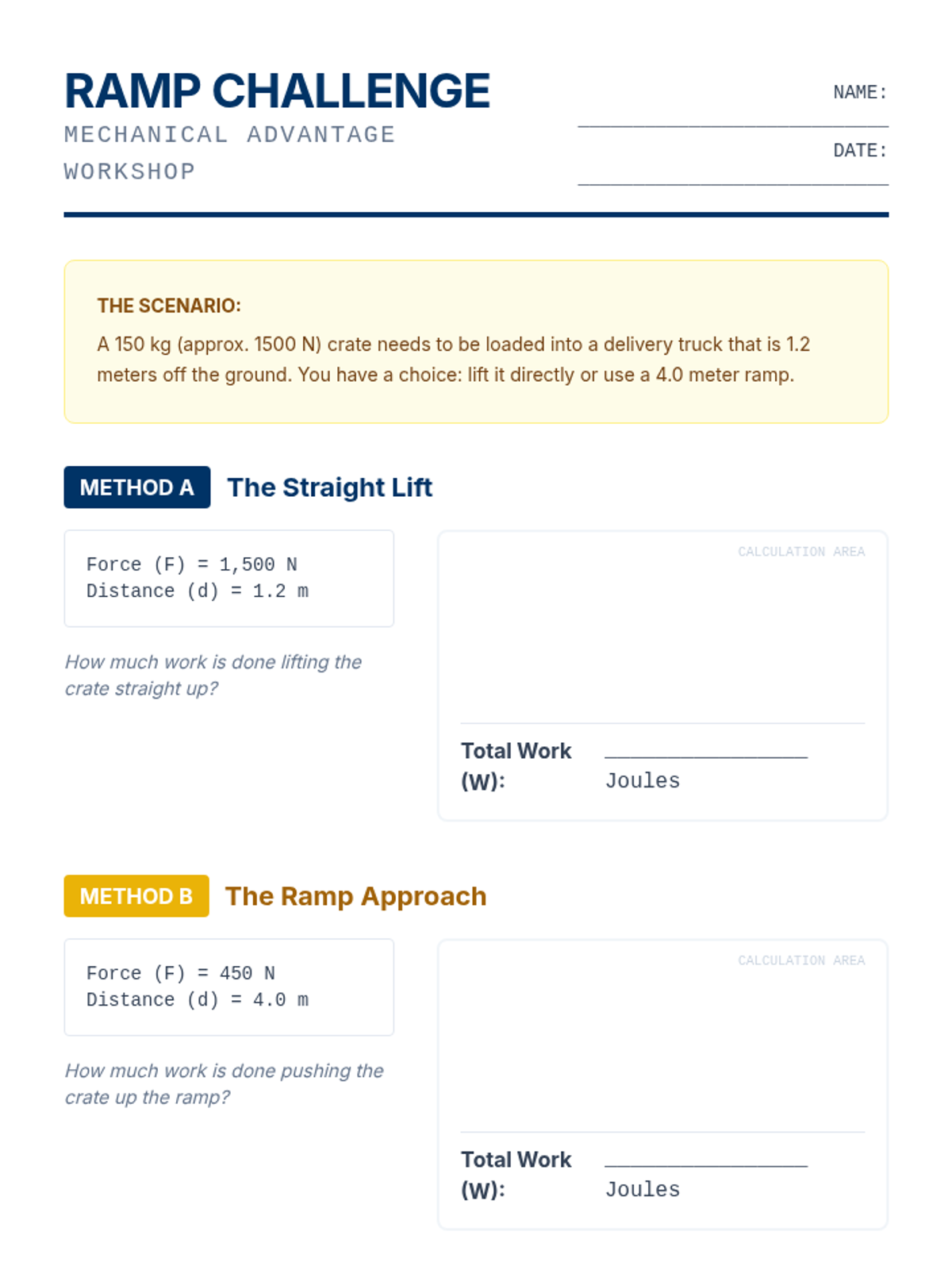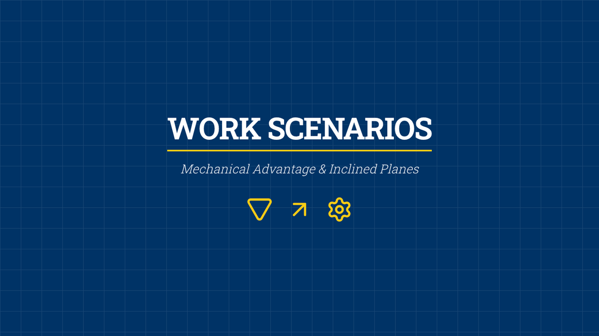 A problem-solving workshop where students apply the work formula to complex scenarios, including ramps and pulleys, comparing direct work against mechanical advantage.