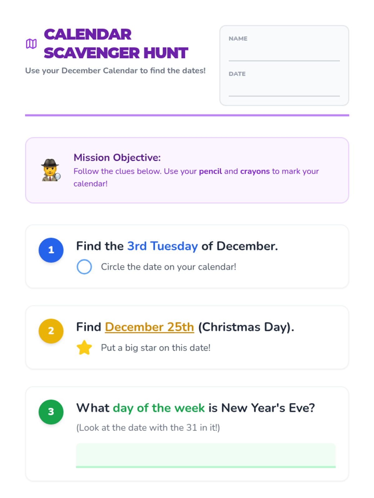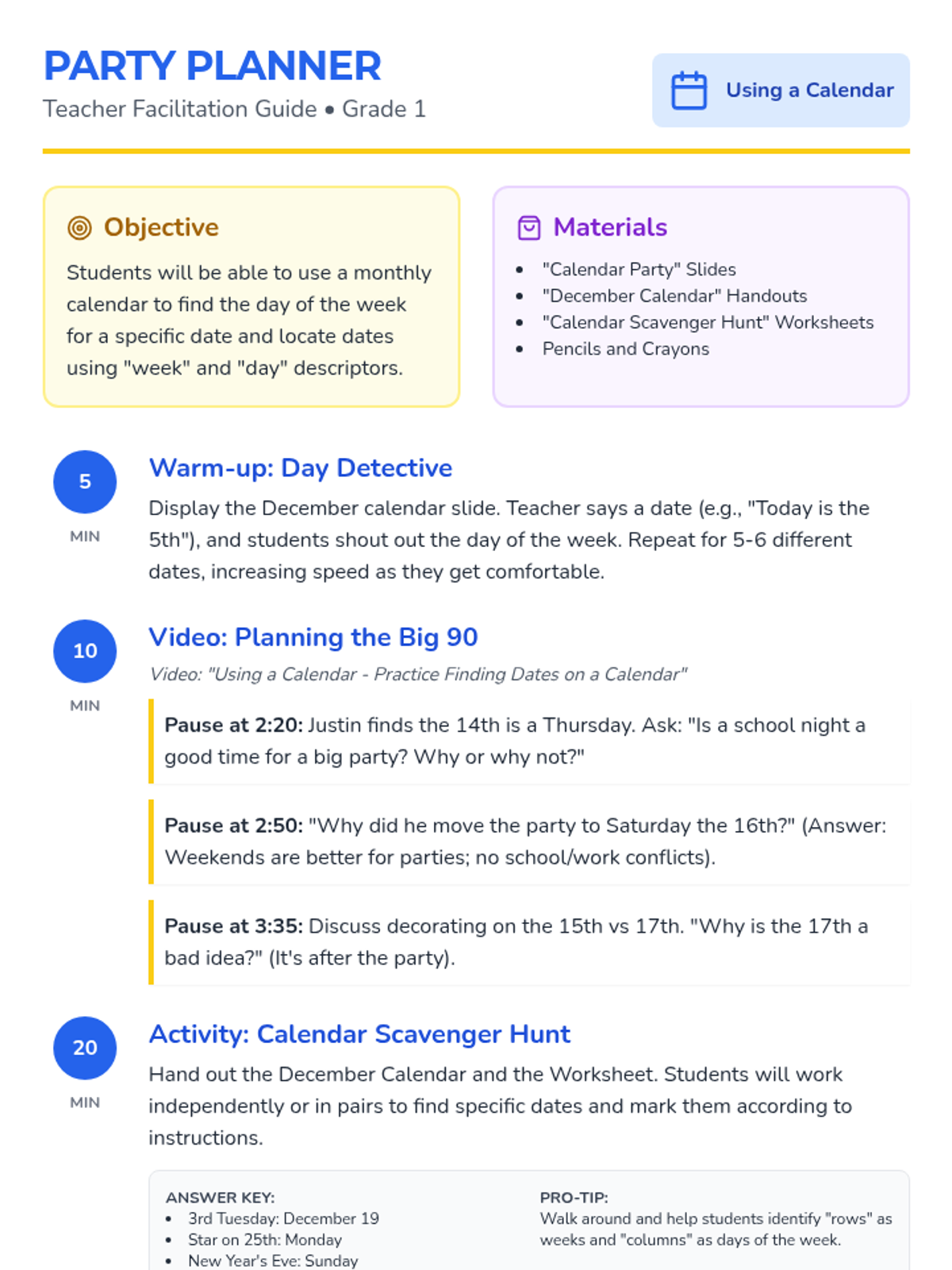 Students learn to navigate a monthly calendar by finding specific dates, identifying days of the week, and using calendar skills to plan a 90th birthday party for Justin's grandpa.