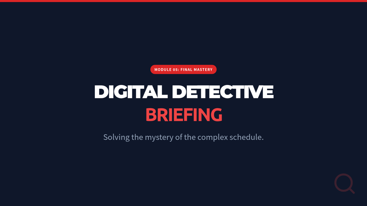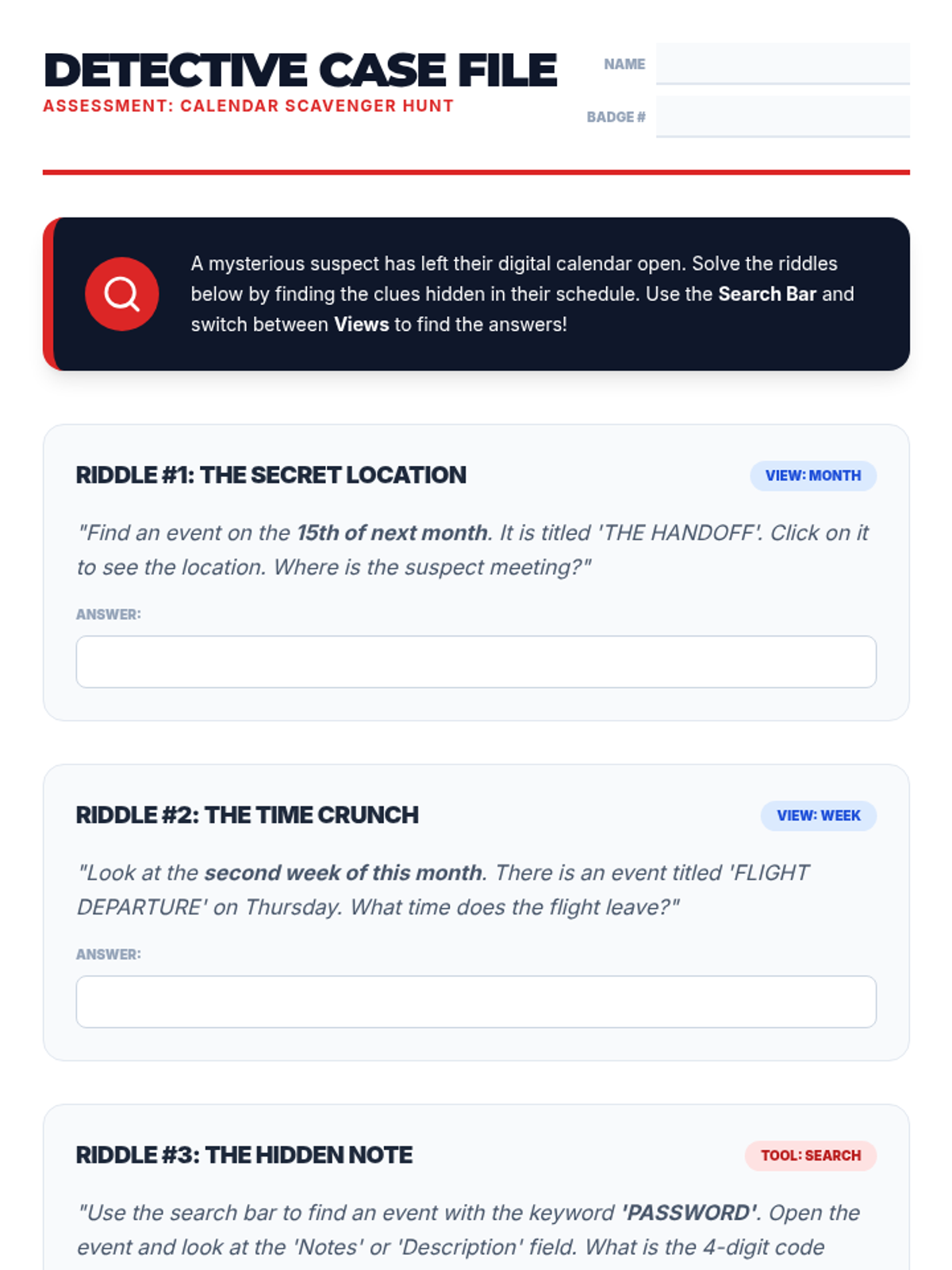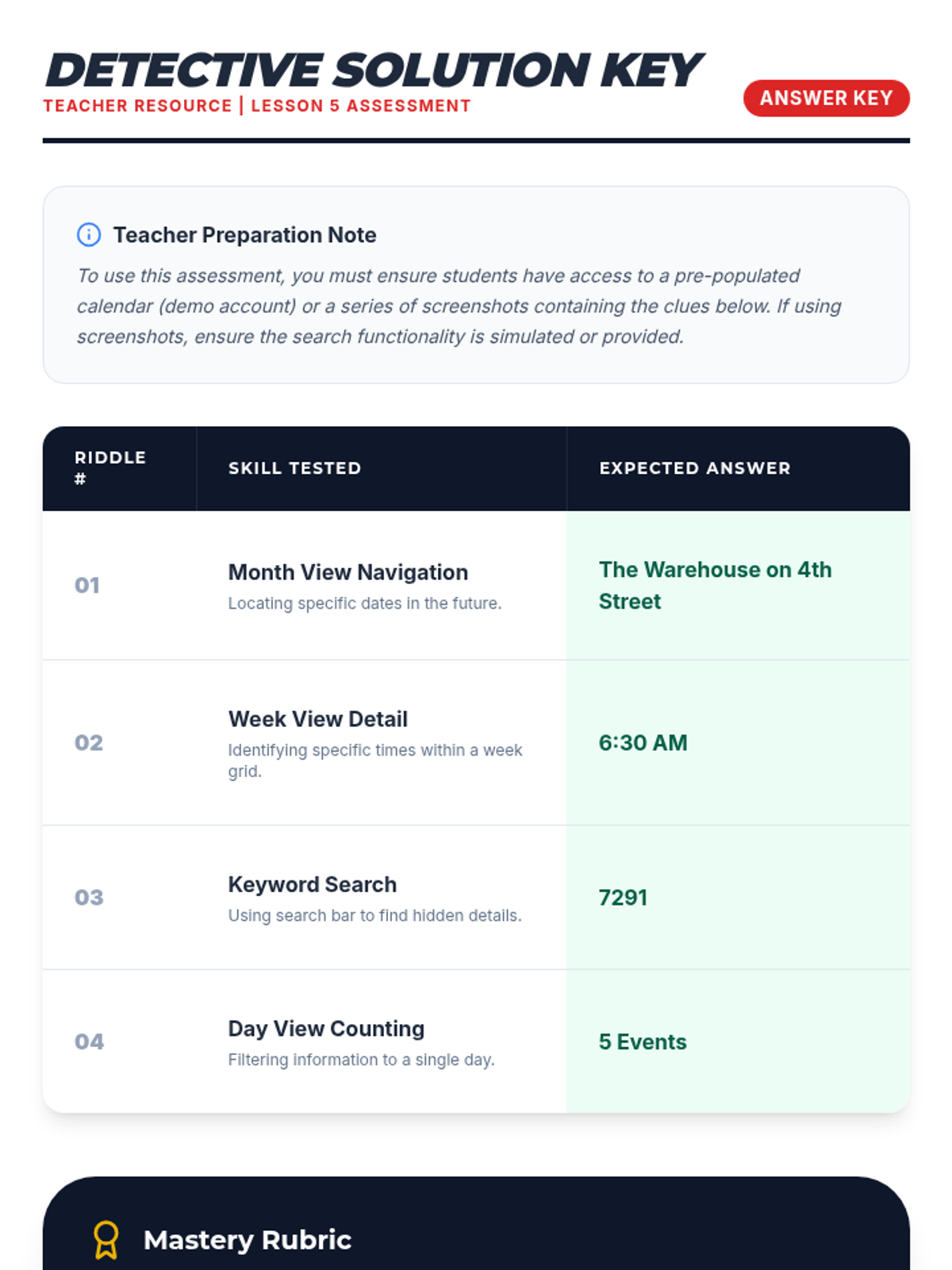 A mastery-based assessment where students solve riddles by finding specific details in a complex calendar.