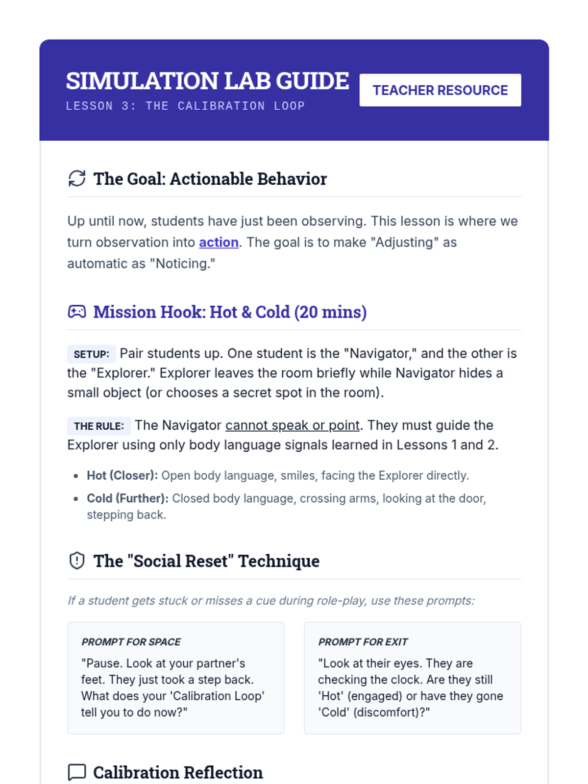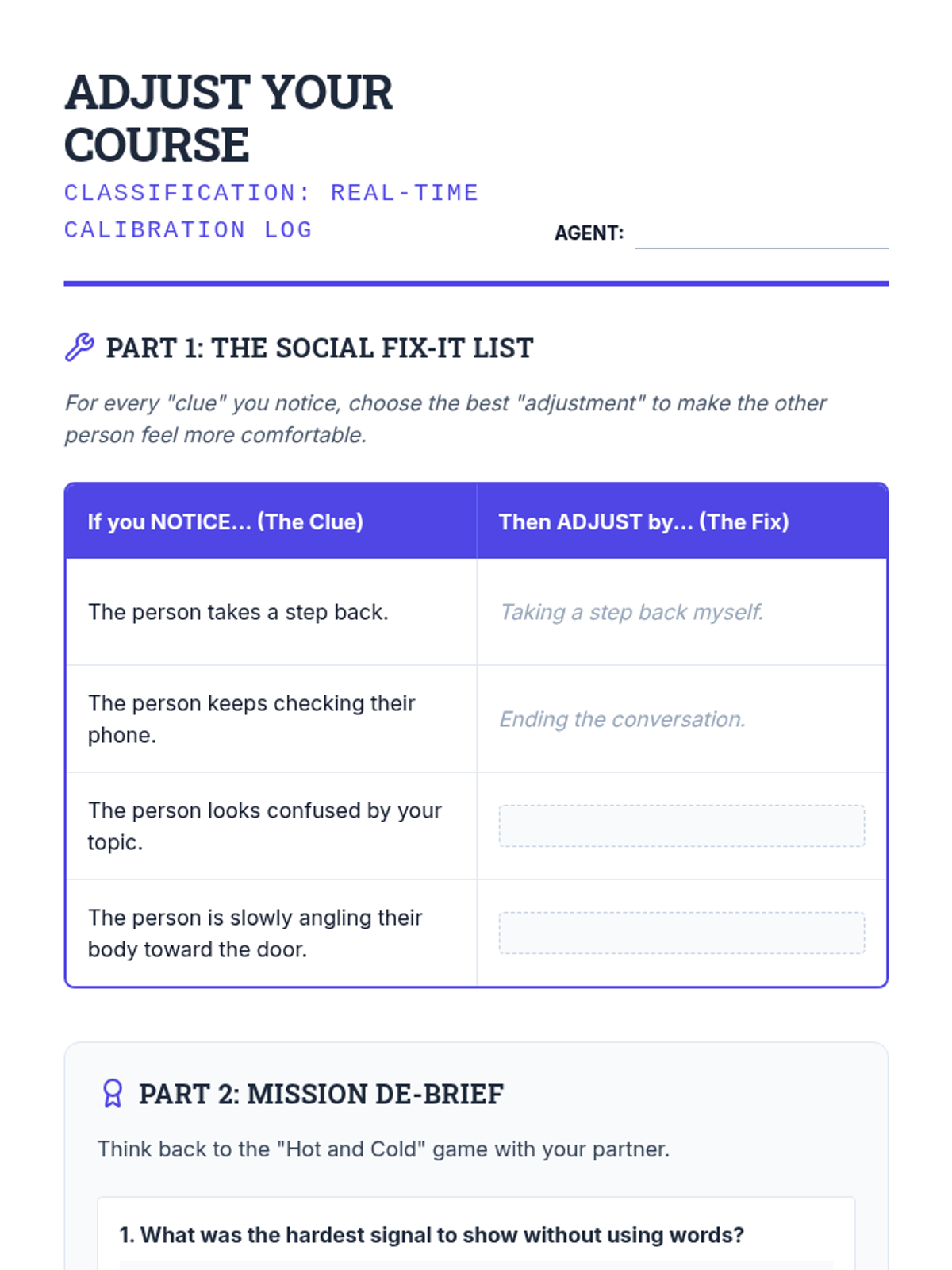 Students practice the 'Notice and Adjust' loop, learning to change their physical proximity or topic based on the nonverbal cues they observe.