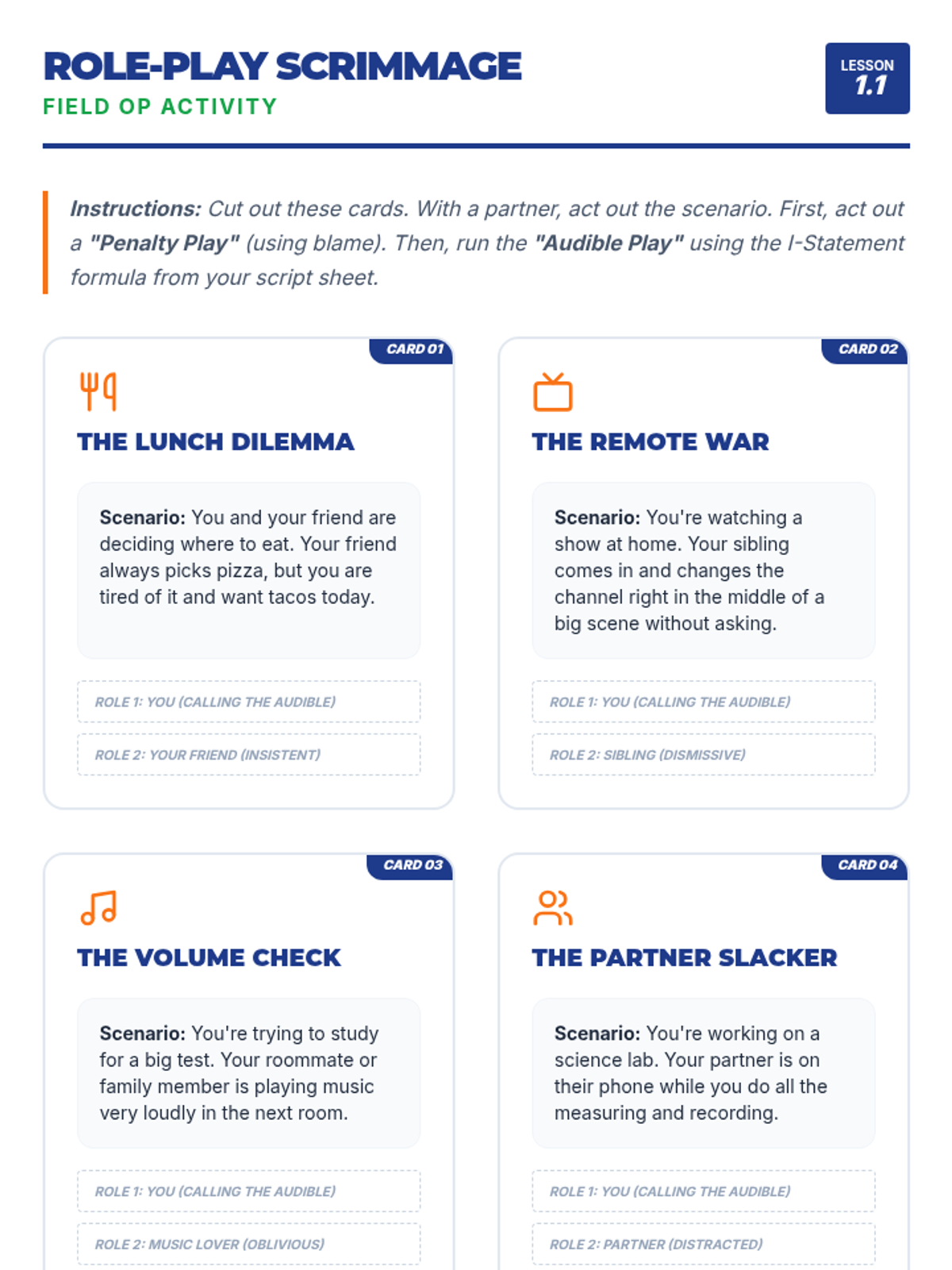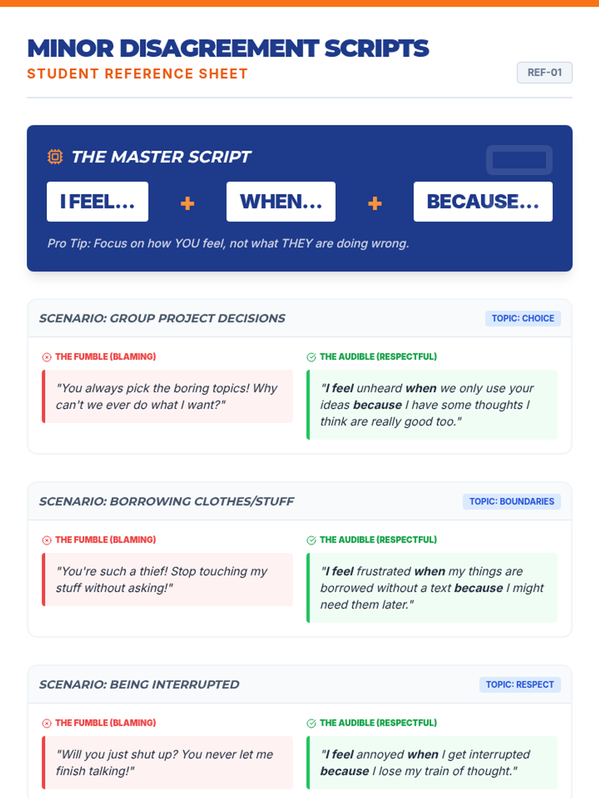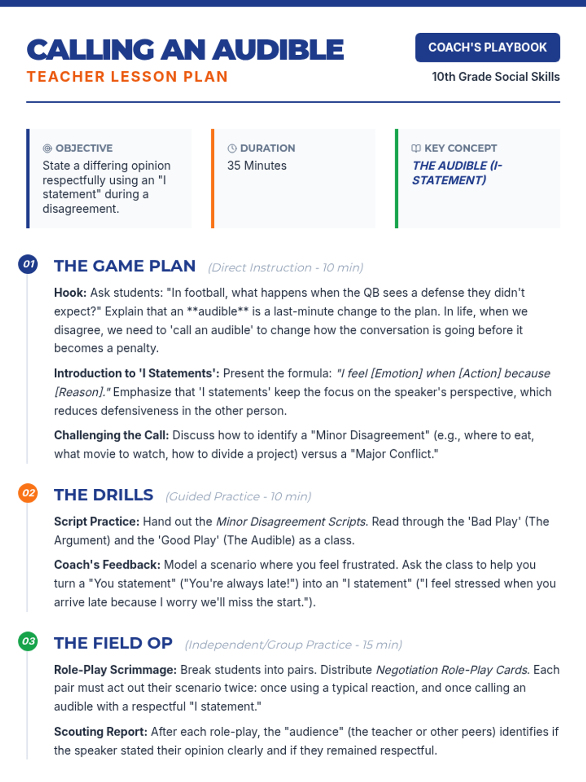 A 10th-grade self-advocacy lesson focused on using 'I statements' to navigate minor disagreements respectfully using a sports-themed 'audible' metaphor.