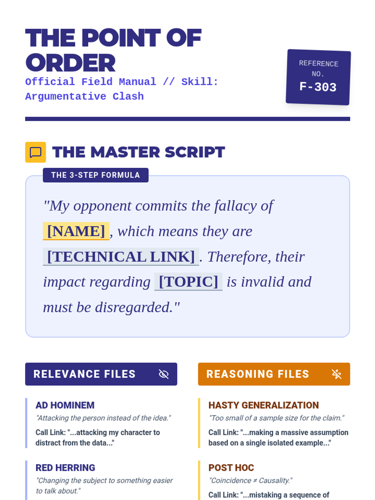 Students learn the technical vocabulary to call out fallacies in a debate round. The lesson focuses on the phrasing: 'My opponent commits the fallacy of X, which means their impact is invalid because...'