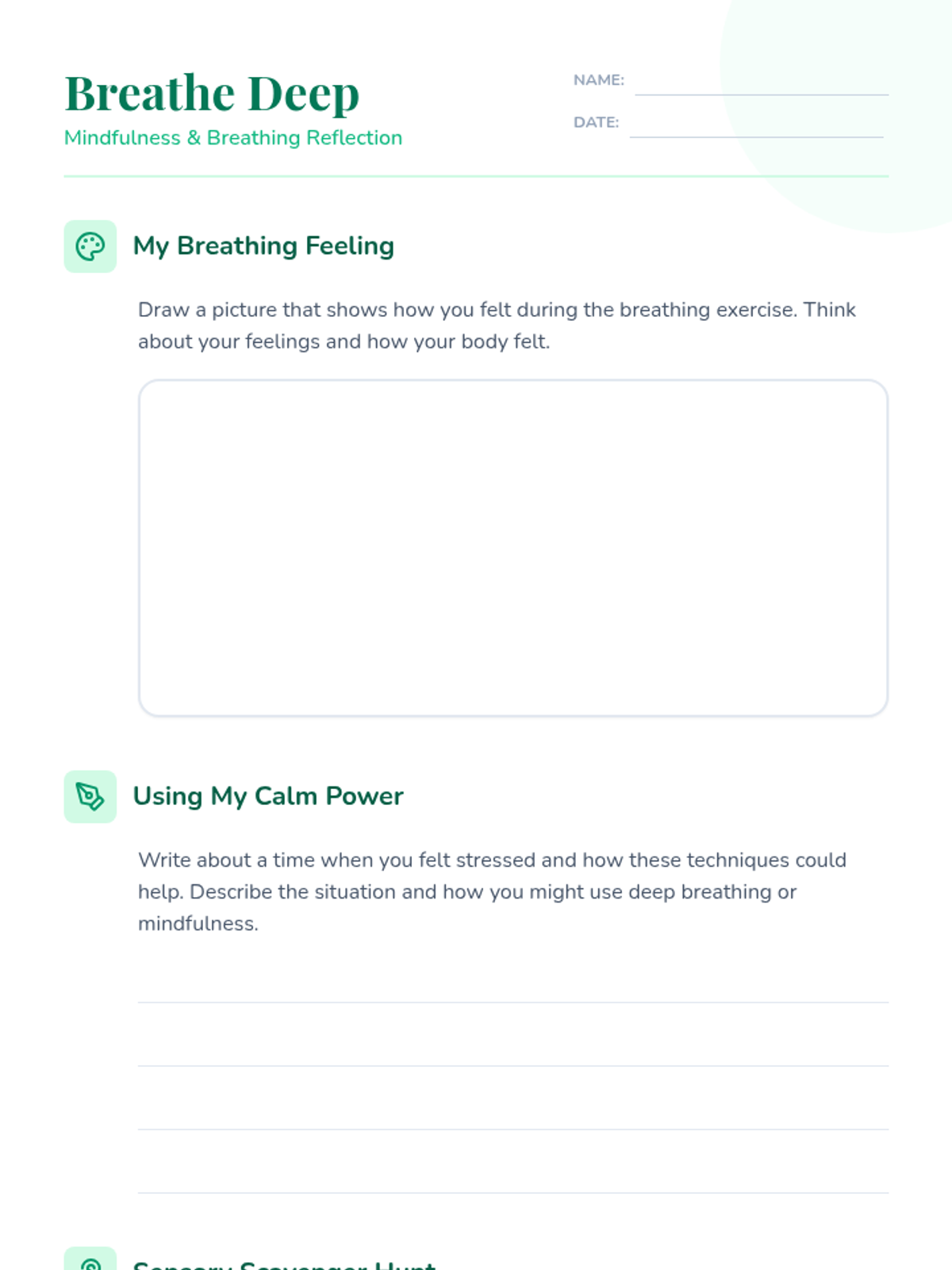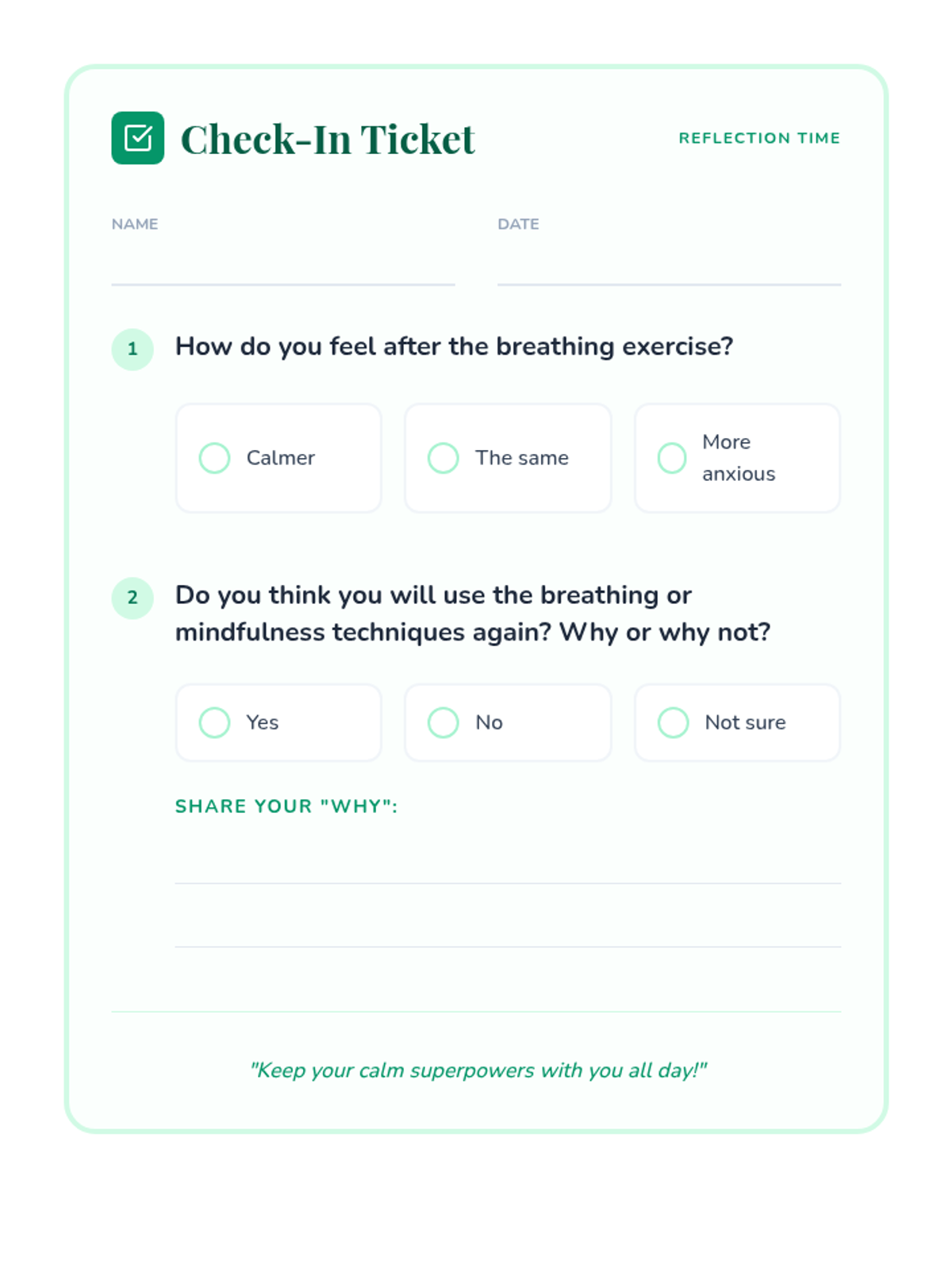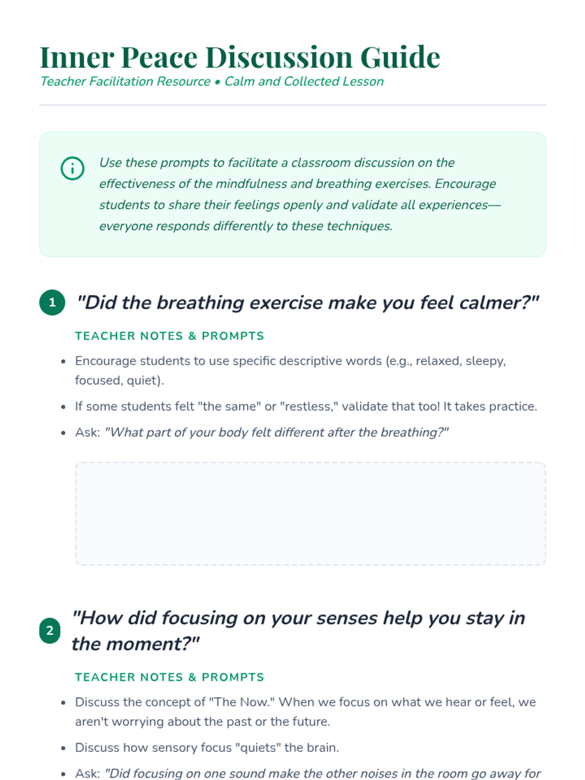 A lesson designed for Grade 3 students to learn and practice deep breathing and mindfulness techniques to manage stress and stay calm. Students will engage in guided exercises and reflect on their experiences through discussion and written work.