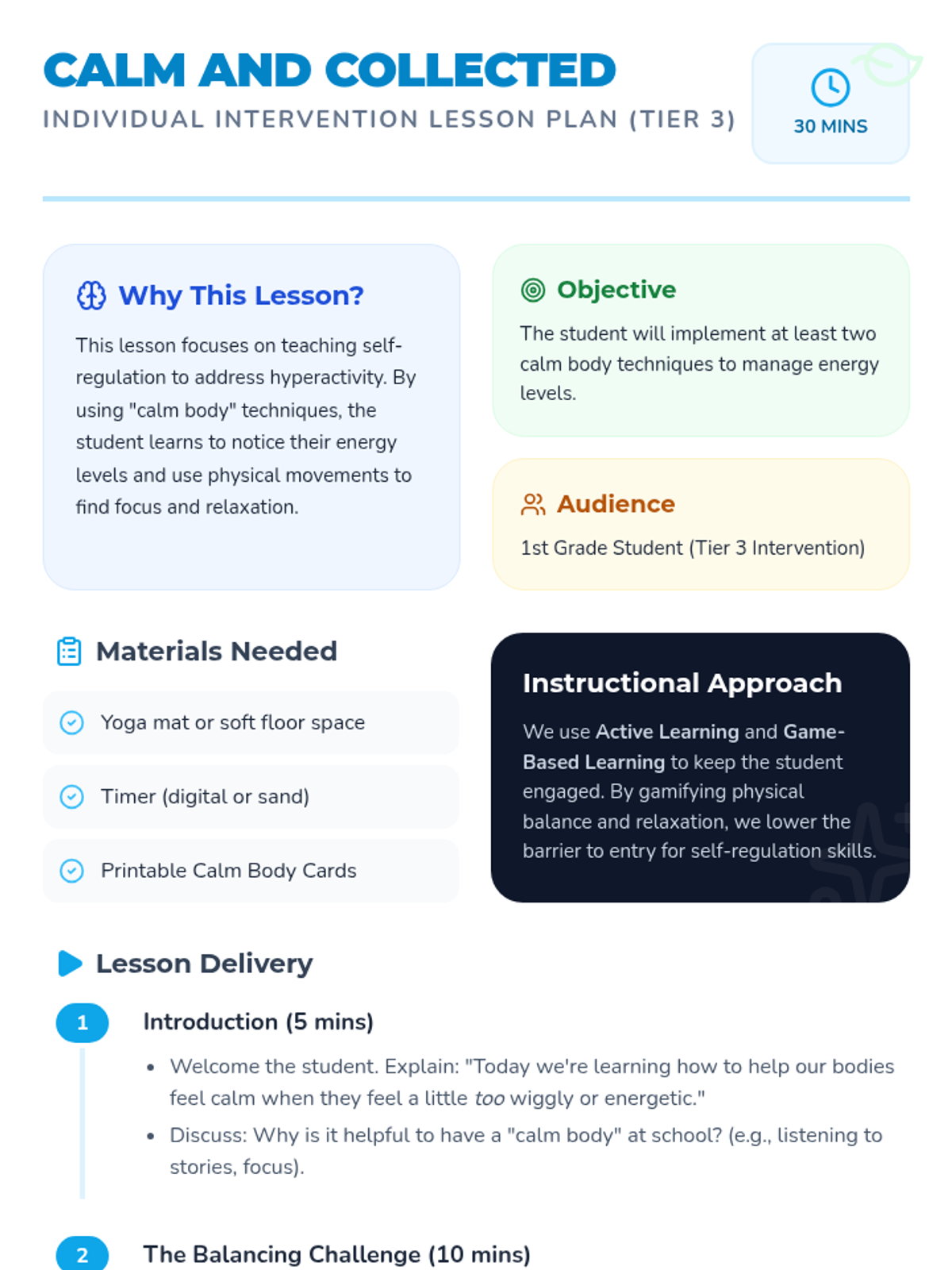 A Tier 3 individual intervention designed for a 6-year-old boy to help manage hyperactivity through physical balancing games and relaxation techniques. The lesson focuses on practical, sensory-based strategies to regulate energy levels and improve focus.