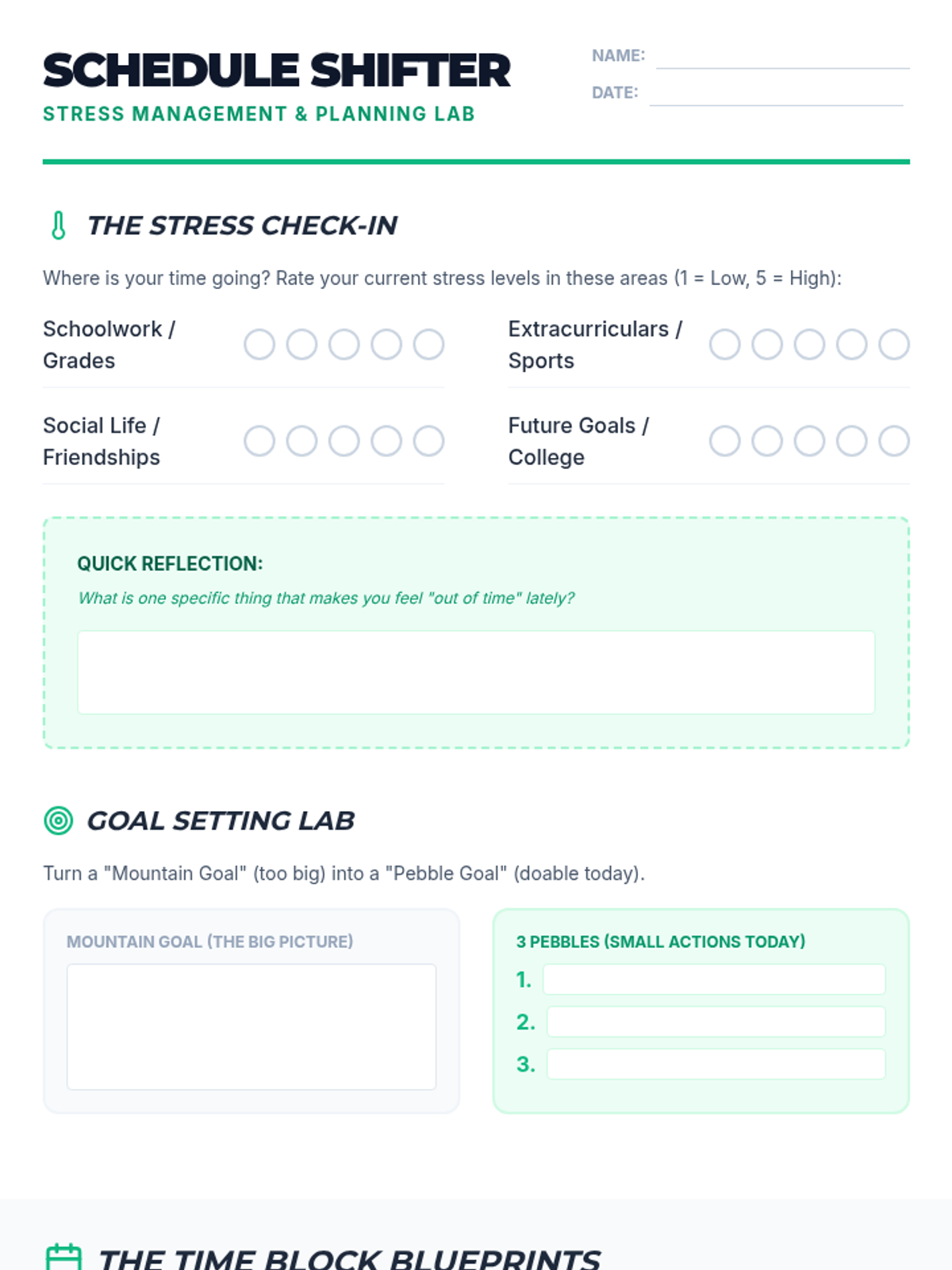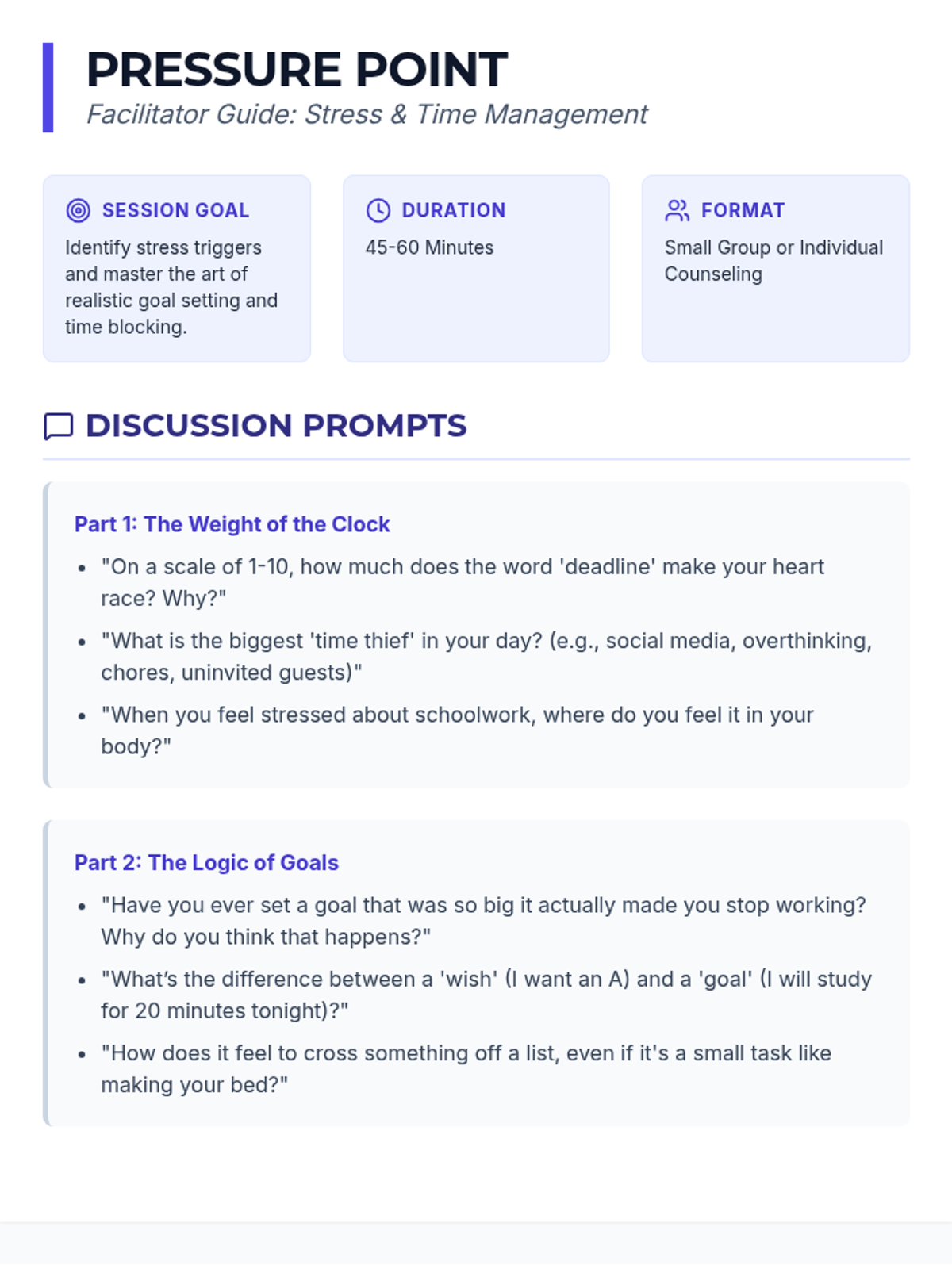 A counseling session focused on equipping students with practical tools for goal setting, time blocking, and managing academic stress through discussion and role-play.
