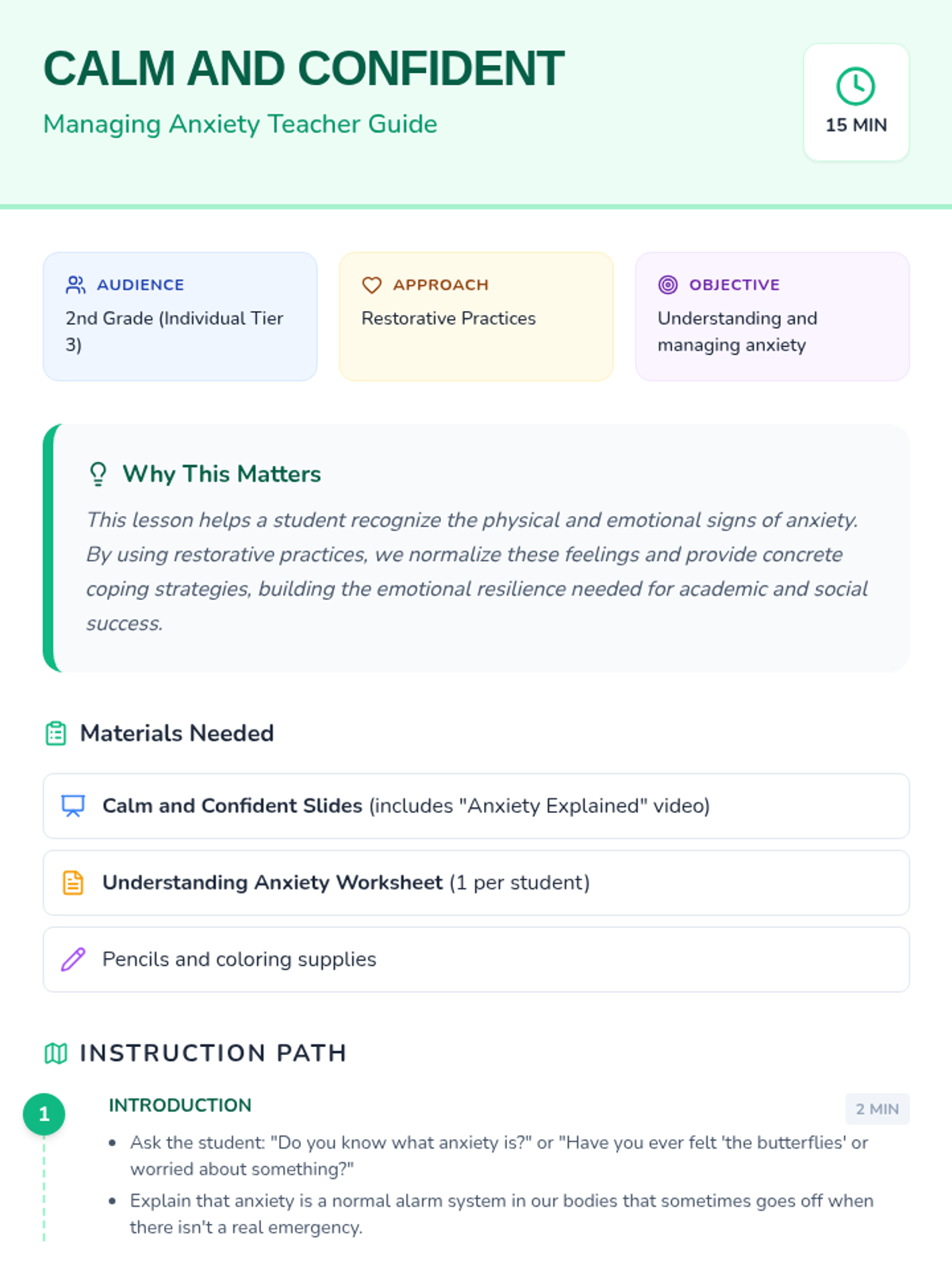 A restorative practices lesson for 2nd-grade students to understand and manage anxiety through video-based discussion and reflection.