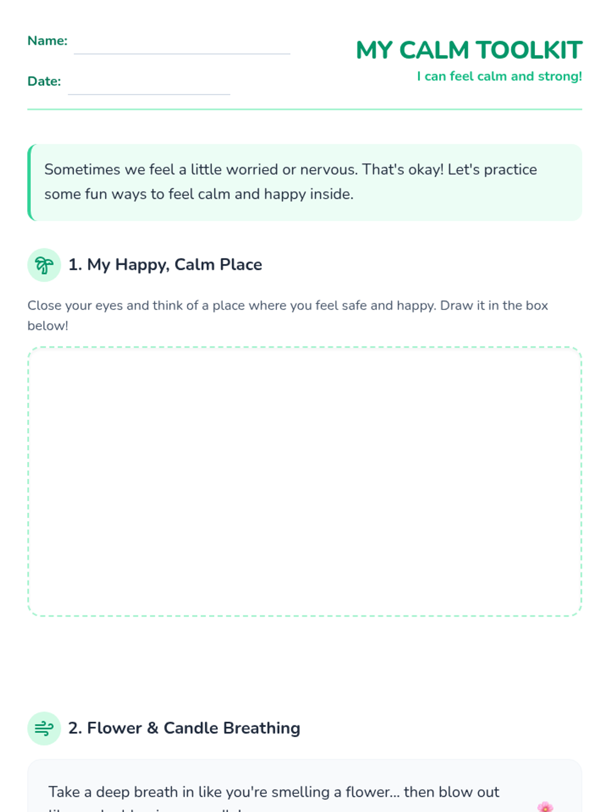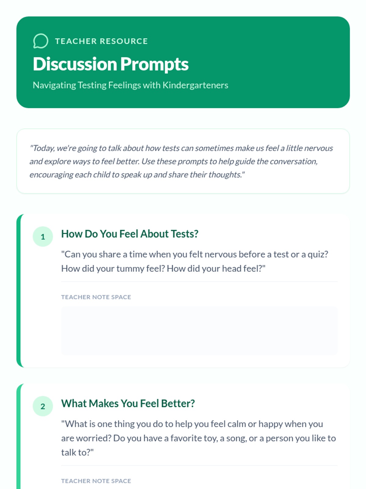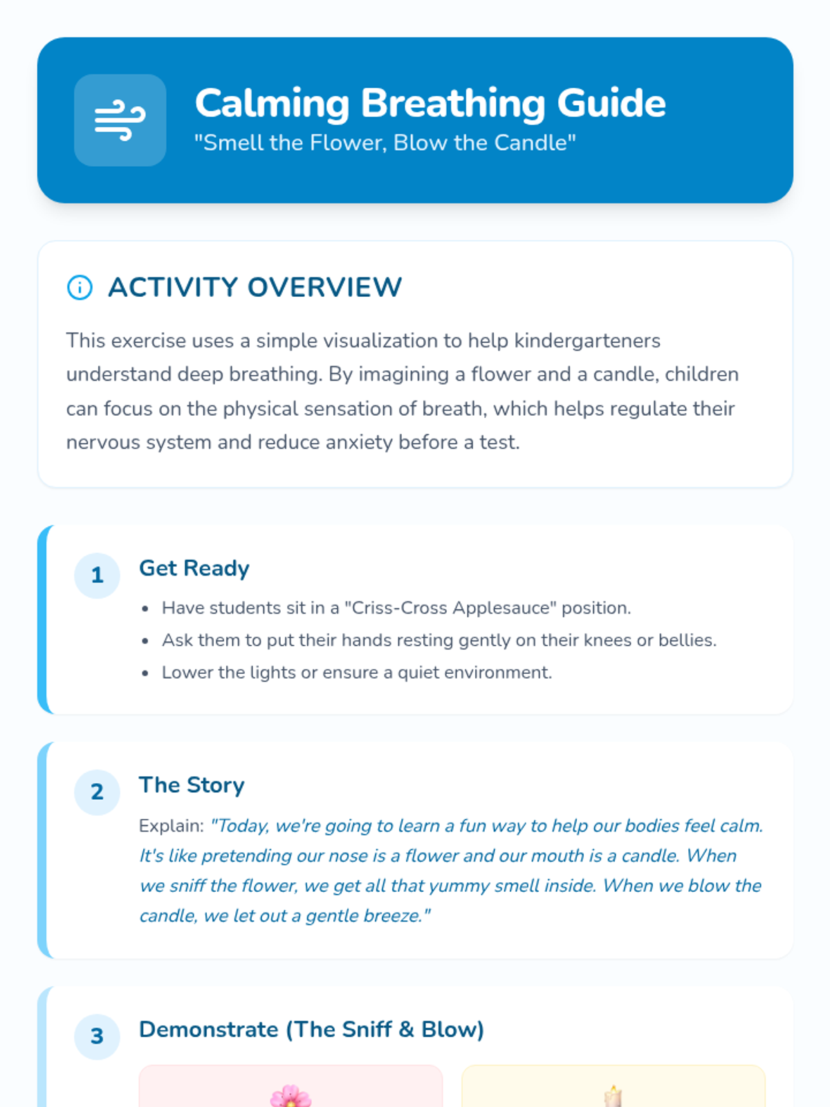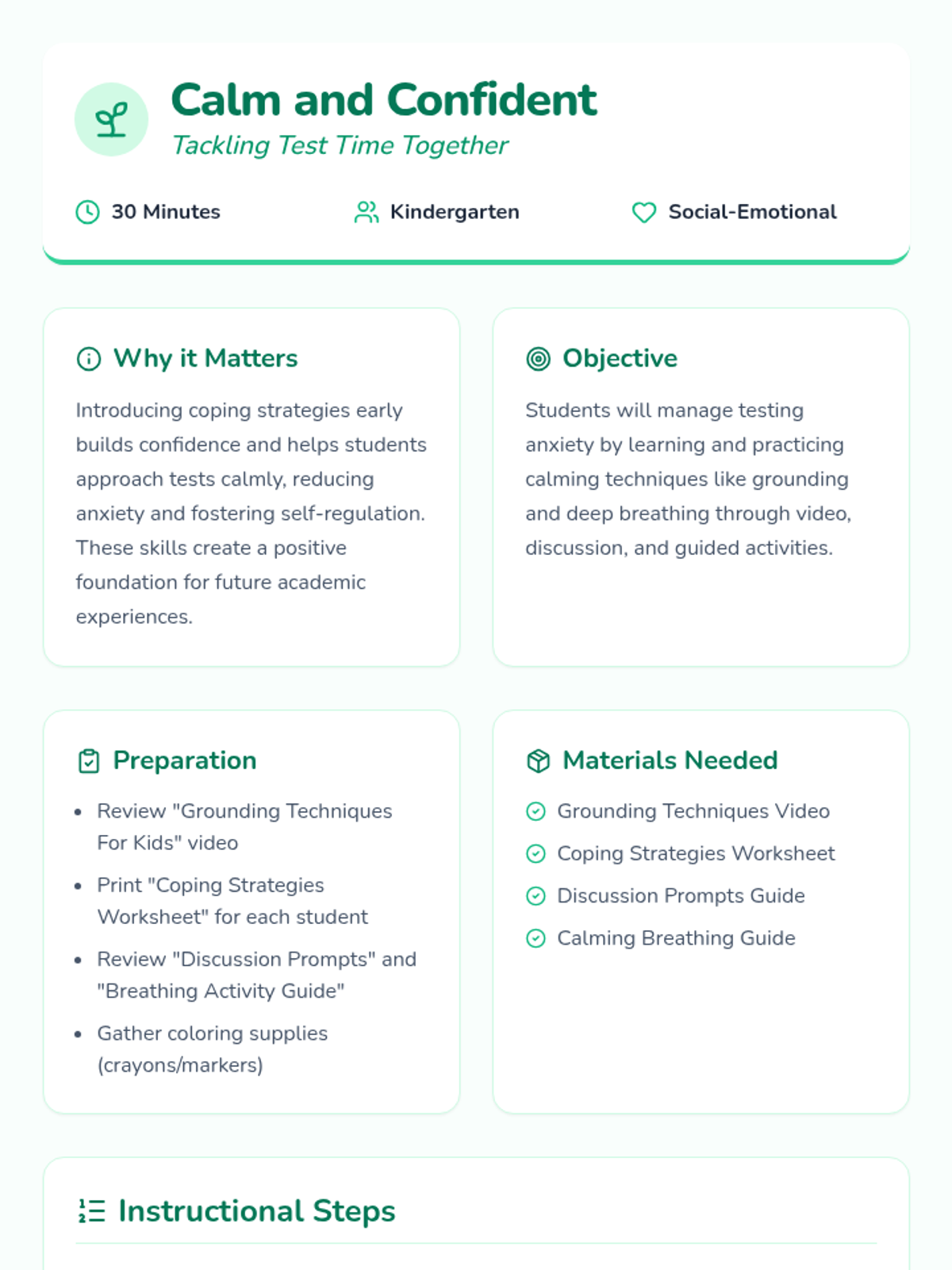 A kindergarten lesson designed to help students manage testing anxiety through calming techniques and confidence-building strategies. Students will learn grounding exercises and deep breathing to approach tests with a calm mindset.