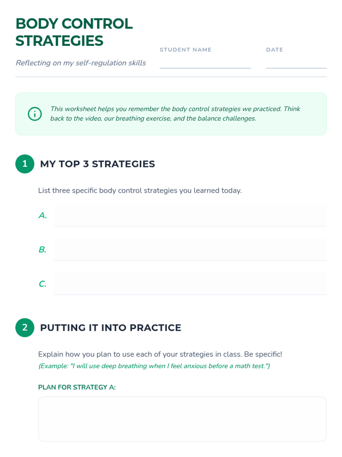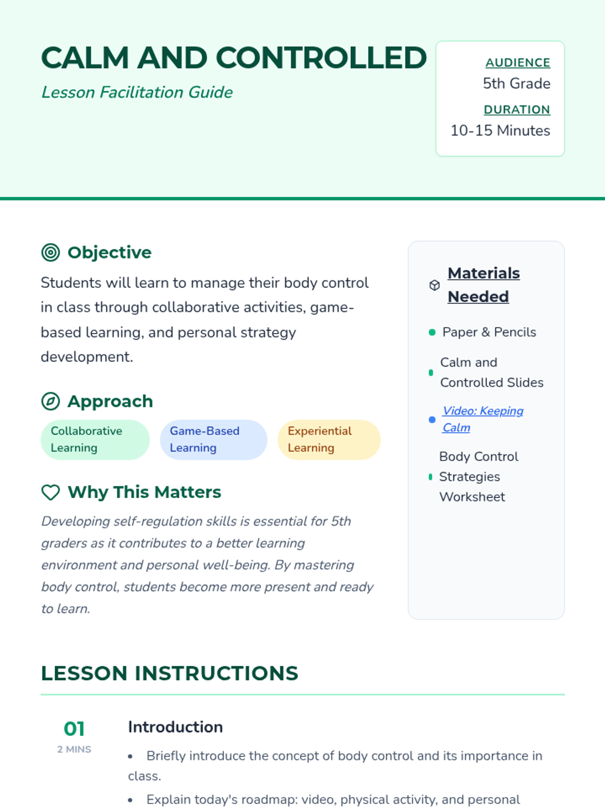 A lesson for 5th graders on managing body control through breathing exercises, collaborative games, and self-reflection strategies. Students learn to regulate their physical presence to improve focus and classroom well-being.