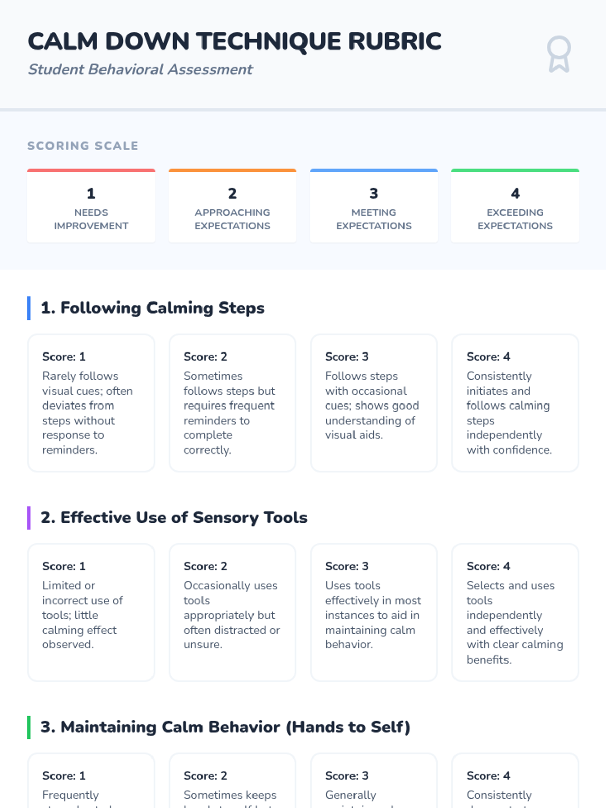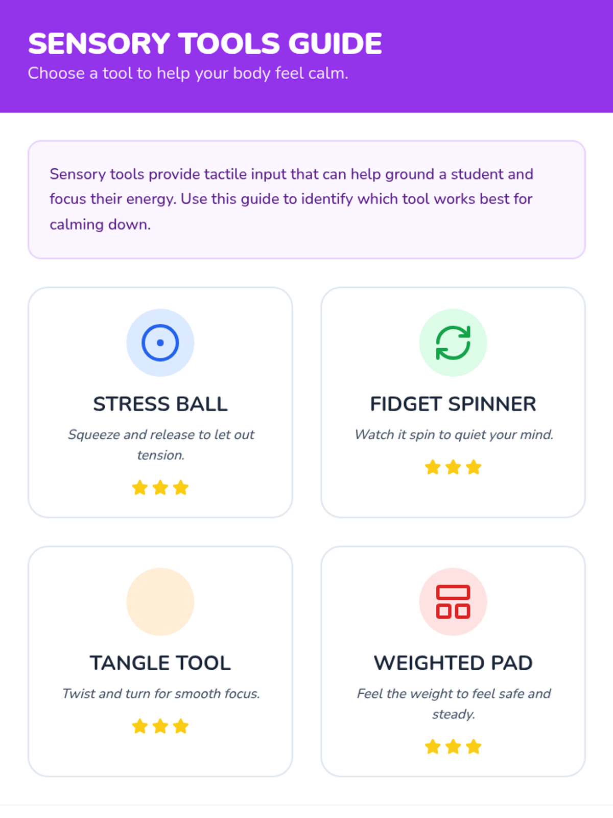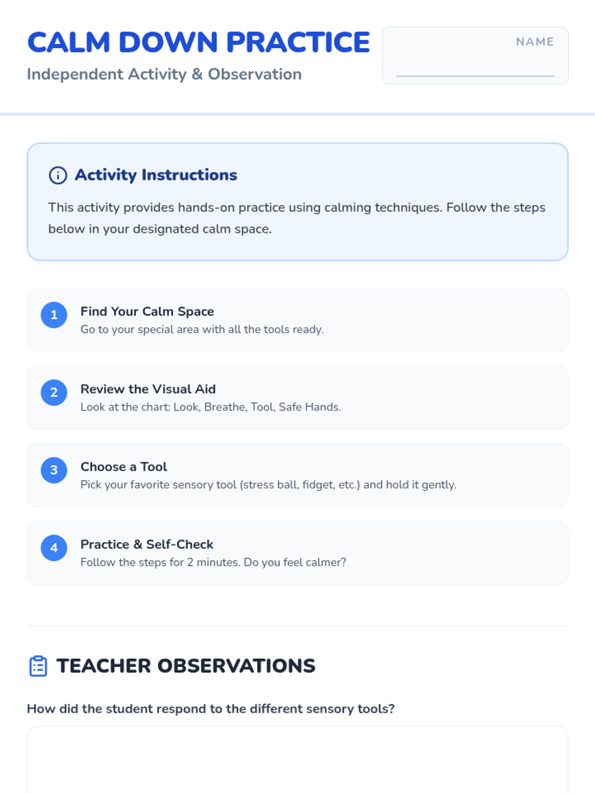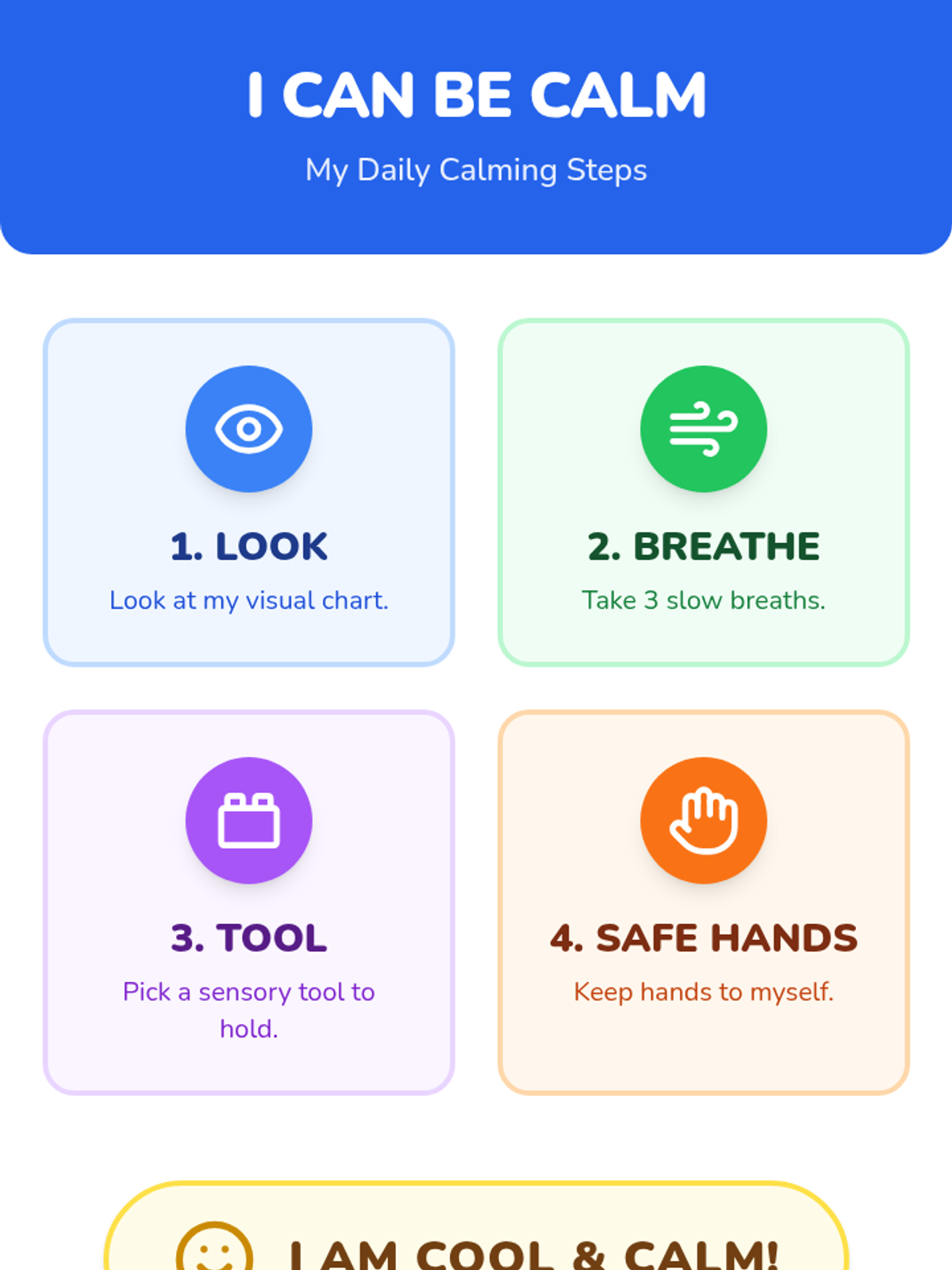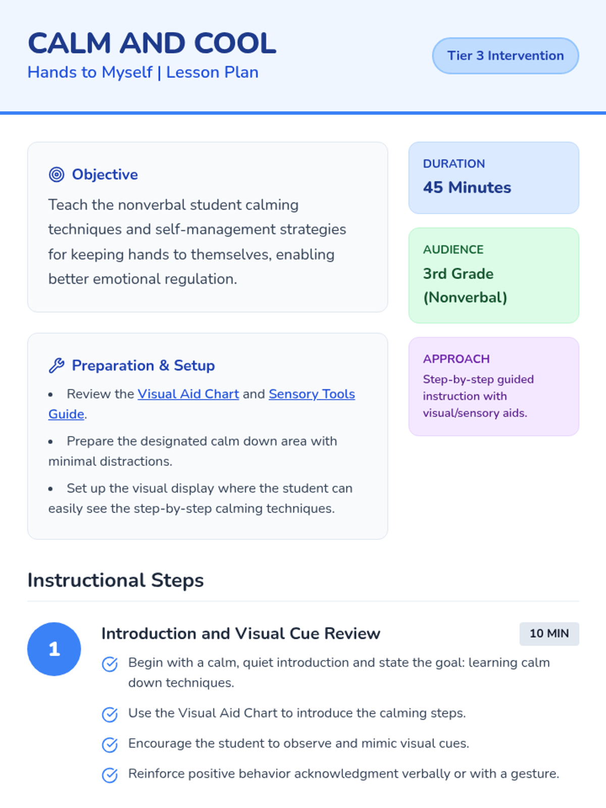 A Tier 3 individual lesson for a nonverbal 3rd-grade student focused on self-regulation, calming techniques, and keeping hands to oneself through visual and sensory support.