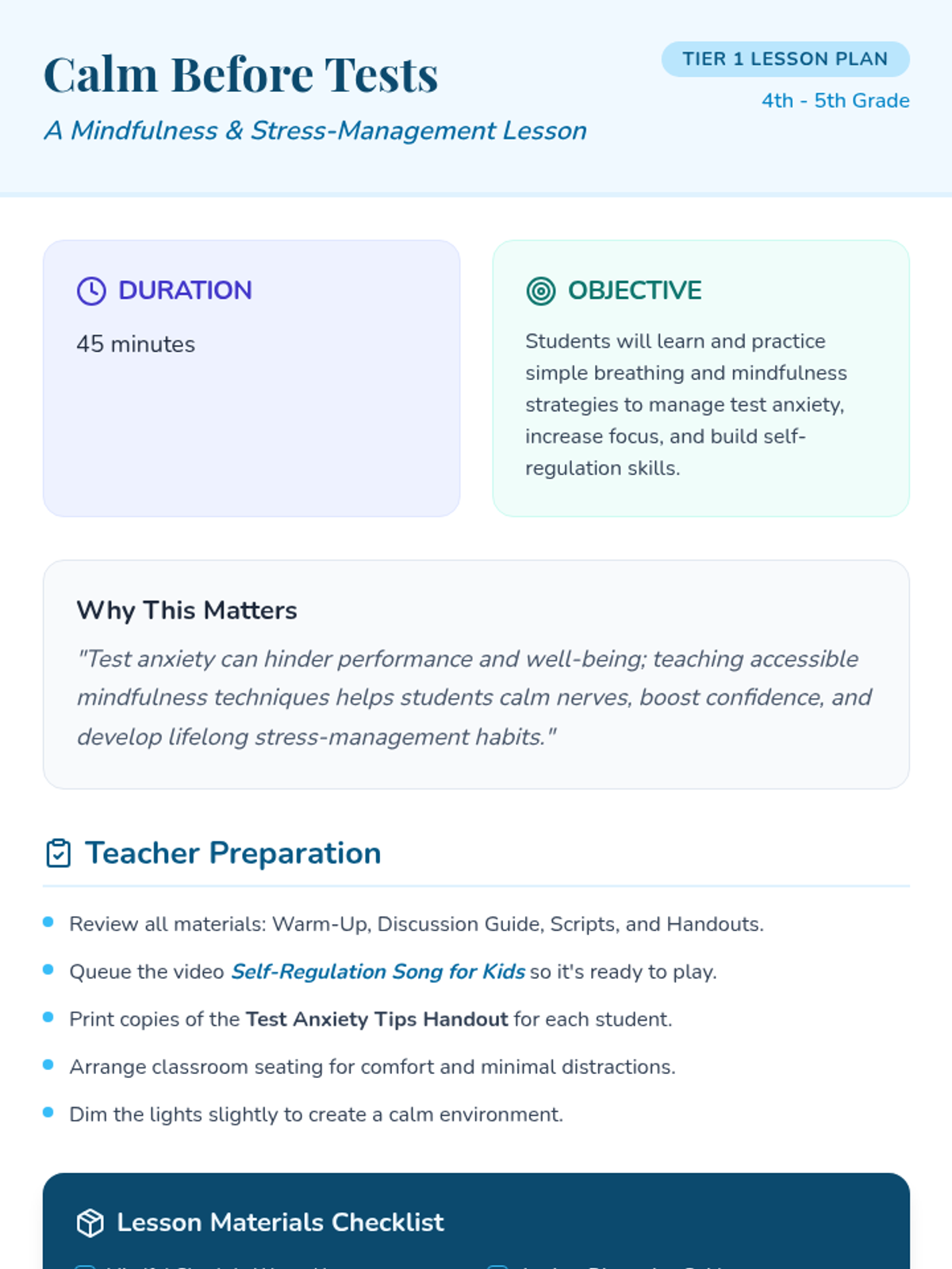 This 45-minute Tier 1 lesson for 4th and 5th graders teaches simple breathing and mindfulness techniques to manage test anxiety, supporting emotional regulation and building lifelong stress-management skills.