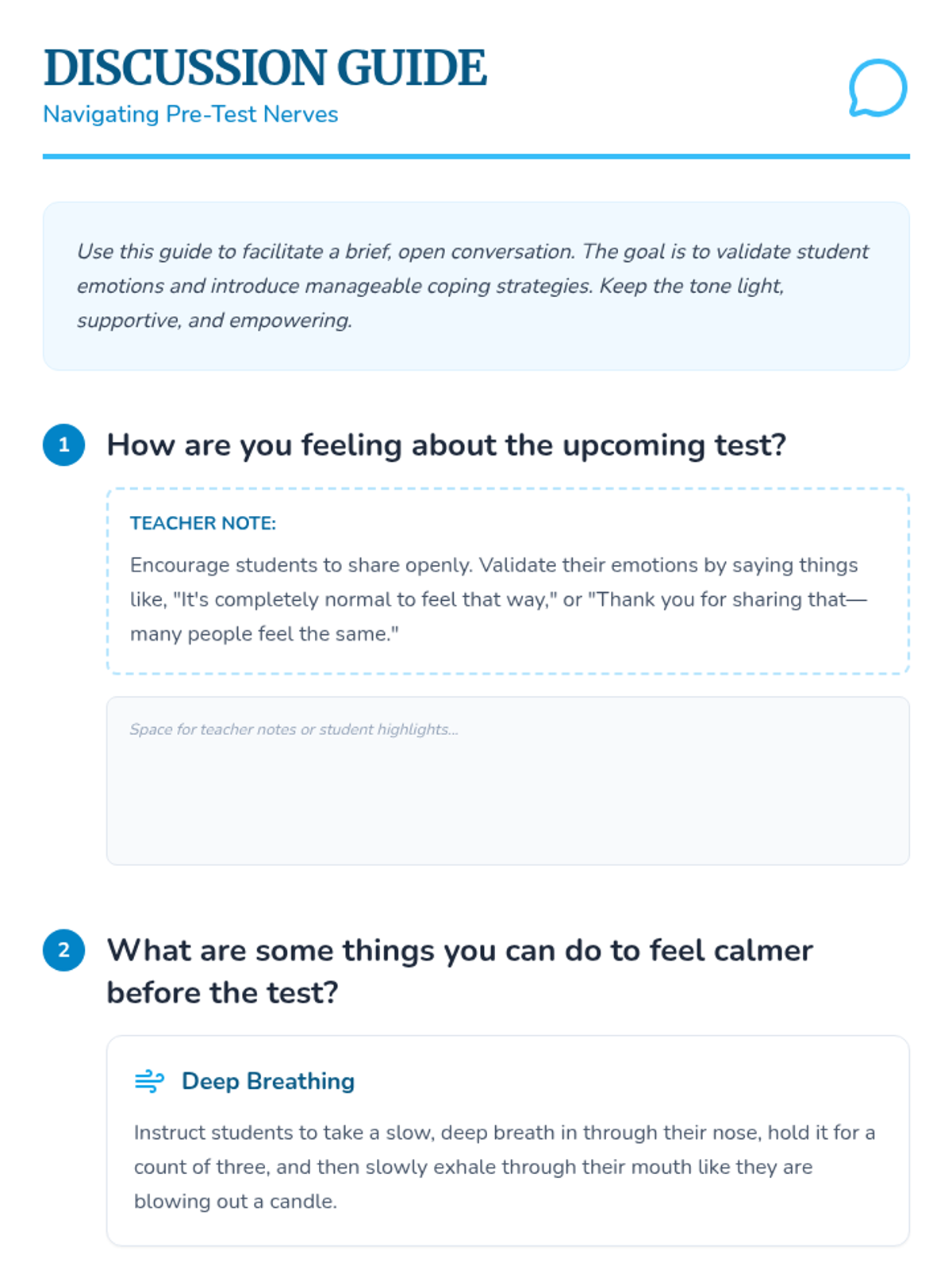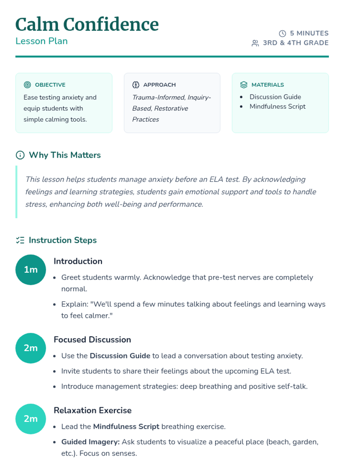 A quick, 5-minute intervention designed to help 3rd and 4th graders manage testing anxiety through discussion and mindfulness before an ELA exam.